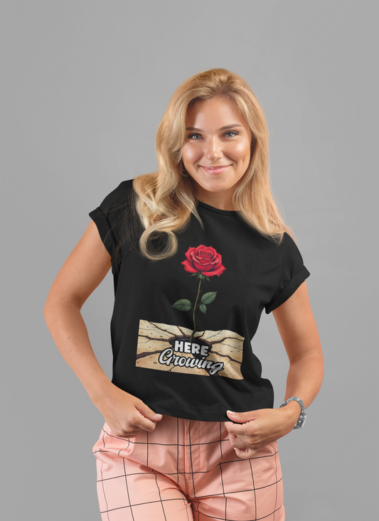 Here Growing T-Shirt – Resilient Rose Through Cracks Motivational Tee