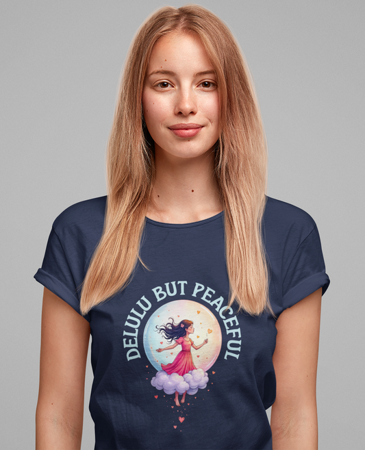 Delulu But Peaceful – Blissfully Unrealistic Floating Girl with Moon & Hearts Graphic T-Shirt