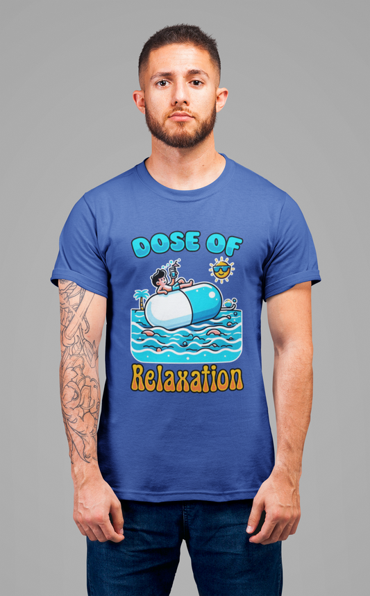 Dose of Relaxation | Boy Sitting on Pill Floating on Water with Drink, Sun & Palm Tree Graphic T-Shirt