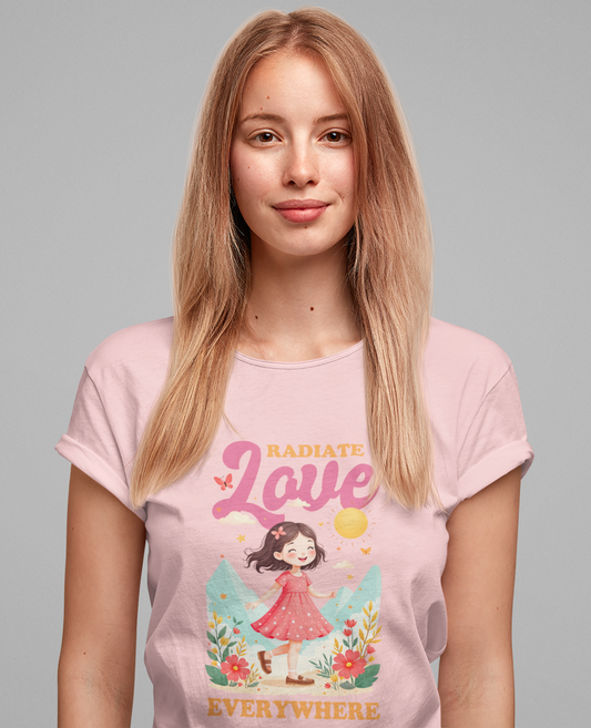 Radiate LOVE Everywhere – Happy Girl Walking in Flower Garden with Butterflies Graphic T-Shirt