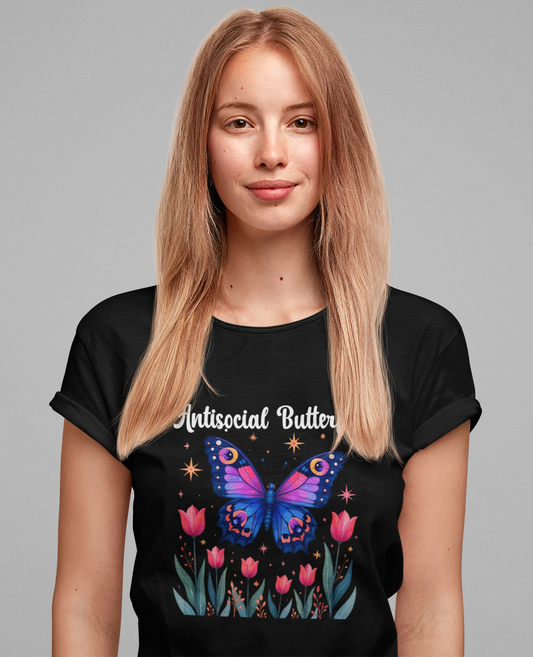 Antisocial Butterfly – Large Butterfly Above Flower Plants Graphic T-Shirt