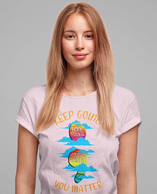 Keep going Semi Colon Rainbow Affirmation Graphic Statement Tee for Mental Health, Recovery, and the Story That Still Continues in Color