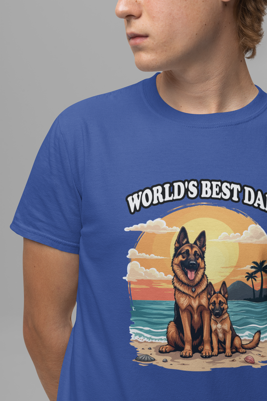 Worlds Best Dad Tshirt German Shepherd Dog Father and Puppy Beach Sunset Design