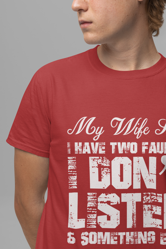 Funny Husband T-Shirt – My Wife Says I Have TWO Faults Shirt