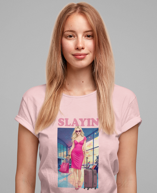 Slayin’ – Pink Airport Lounge Fashion Graphic T-Shirt