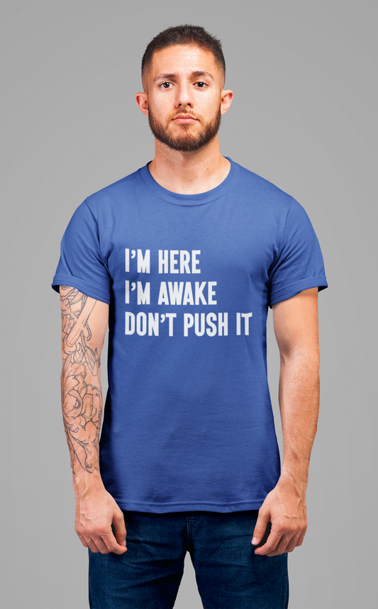 I'm Here I'm Awake Don't Push It T-Shirt – Funny Sarcastic Morning Attitude Tee