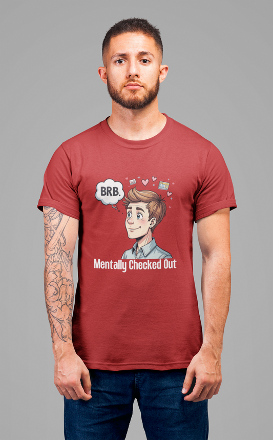 Mentally Checked Out – "BRB" Thought Bubble with Lost Man & Heart Emotions Graphic T-Shirt