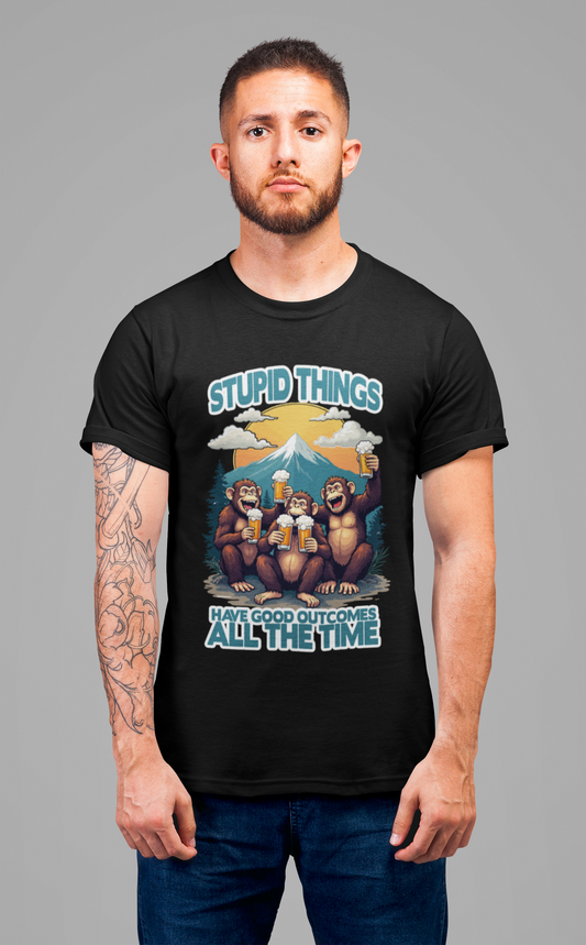 Stupid Things Have Good Outcomes Tshirt – Three Monkeys Cheers with Beer Mugs & Mountain Scene