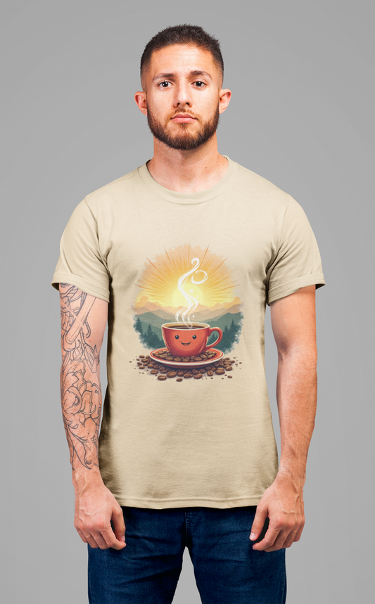 Sunrise Coffee Cup with Coffee Beans and Radiant Morning Glow Graphic T-Shirt