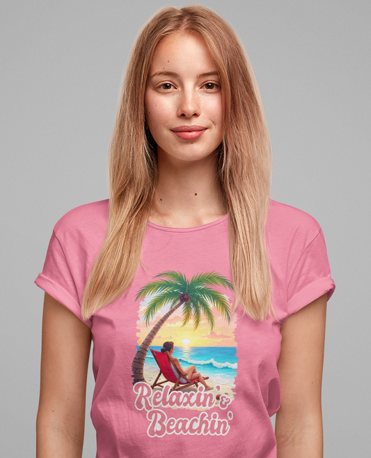 Sunkissed by the Beach – Relaxed Lady on Palm Shore Graphic T-Shirt