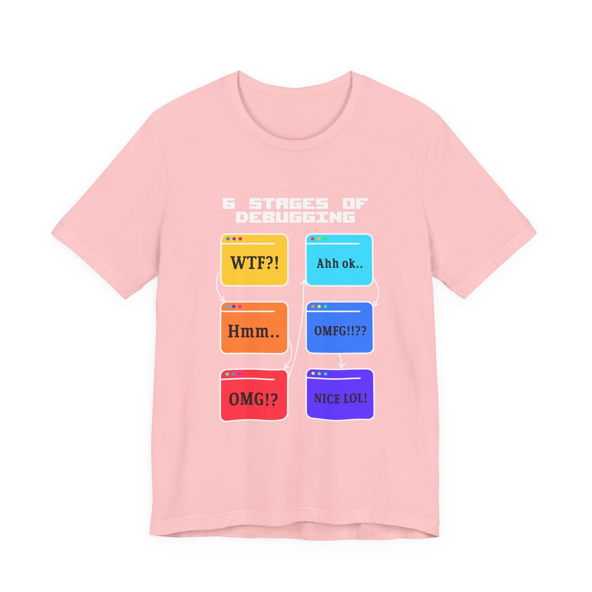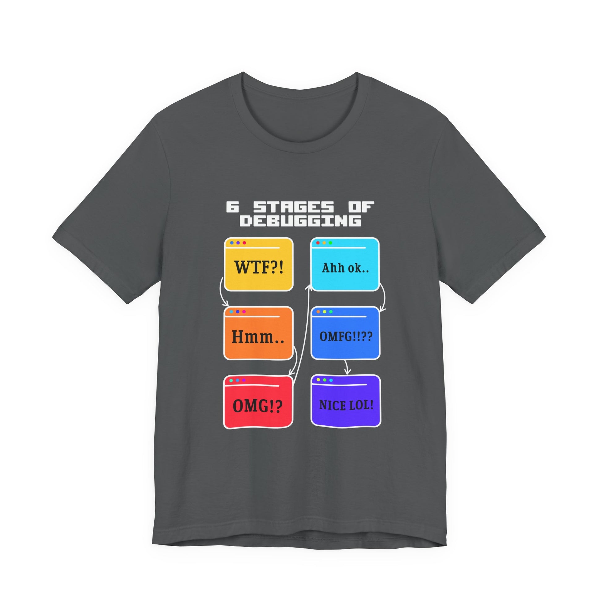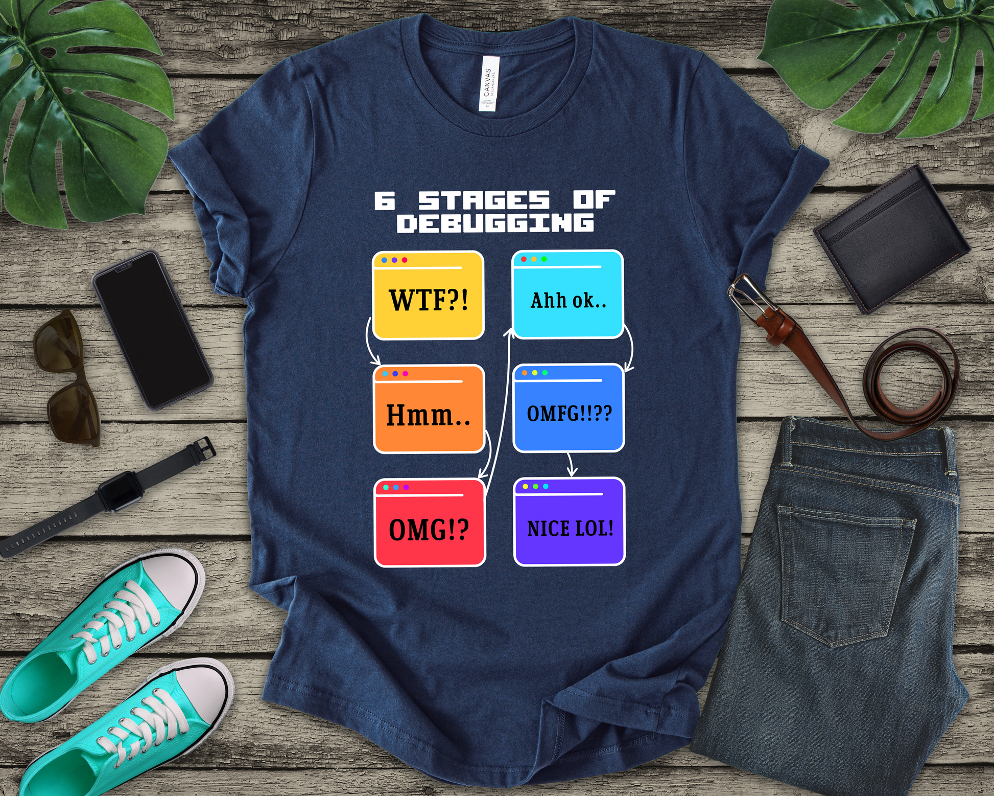 Perfect for programmers and developers, this humorous t-shirt features a flow diagram with arrows going in a confusing direction, illustrating the “6 Stages of Debugging.” Each box contains the relatable stages: “WTF?”, “Ahh ok..”, “Hmm..”, “OMFG!!??”, “OMG!?” and “NICELOL!” This playful design captures the rollercoaster emotions of debugging code and is a great conversation starter at work or tech meetups. Made from soft, breathable fabric, it’s both comfortable and a must-have for every coder’s wardrobe.