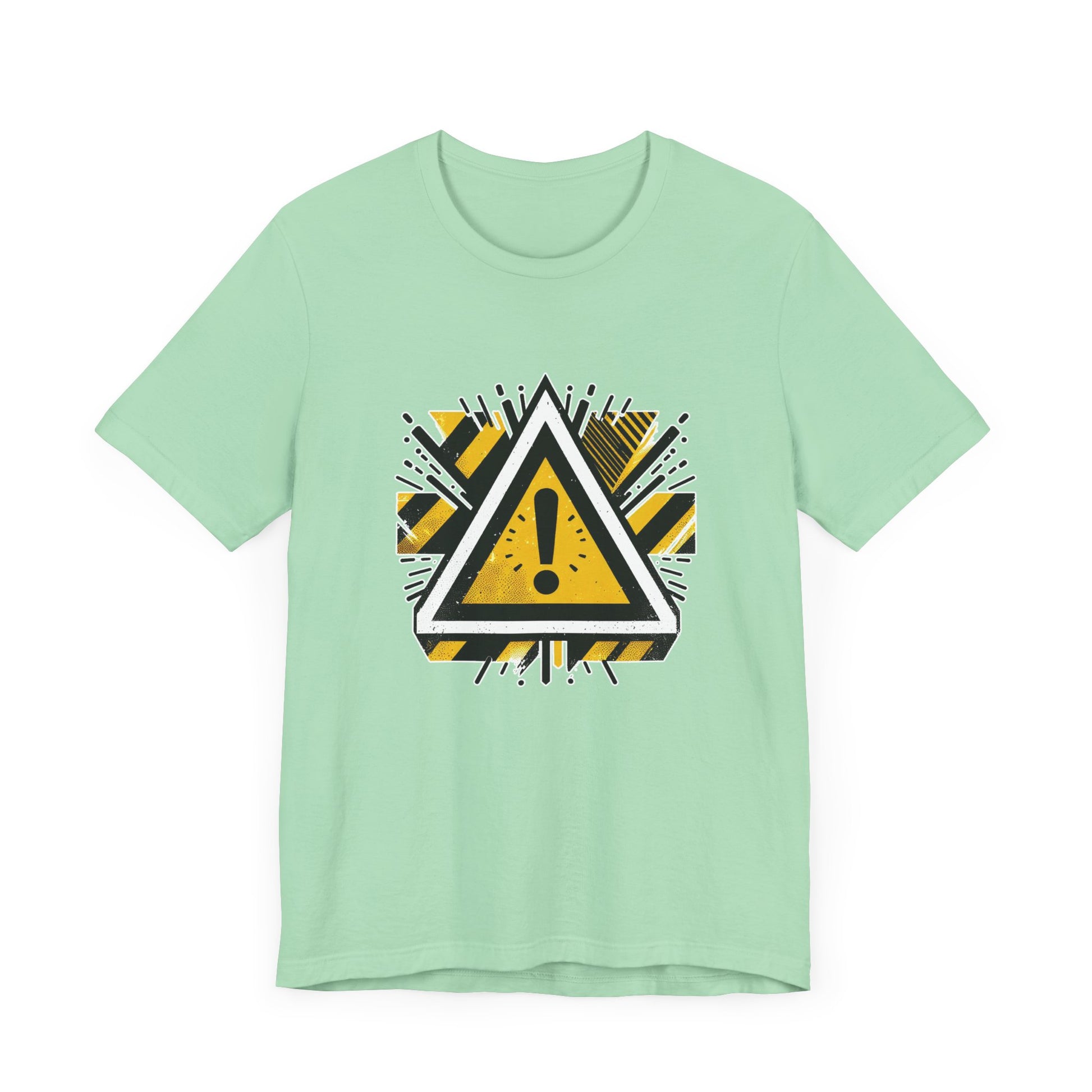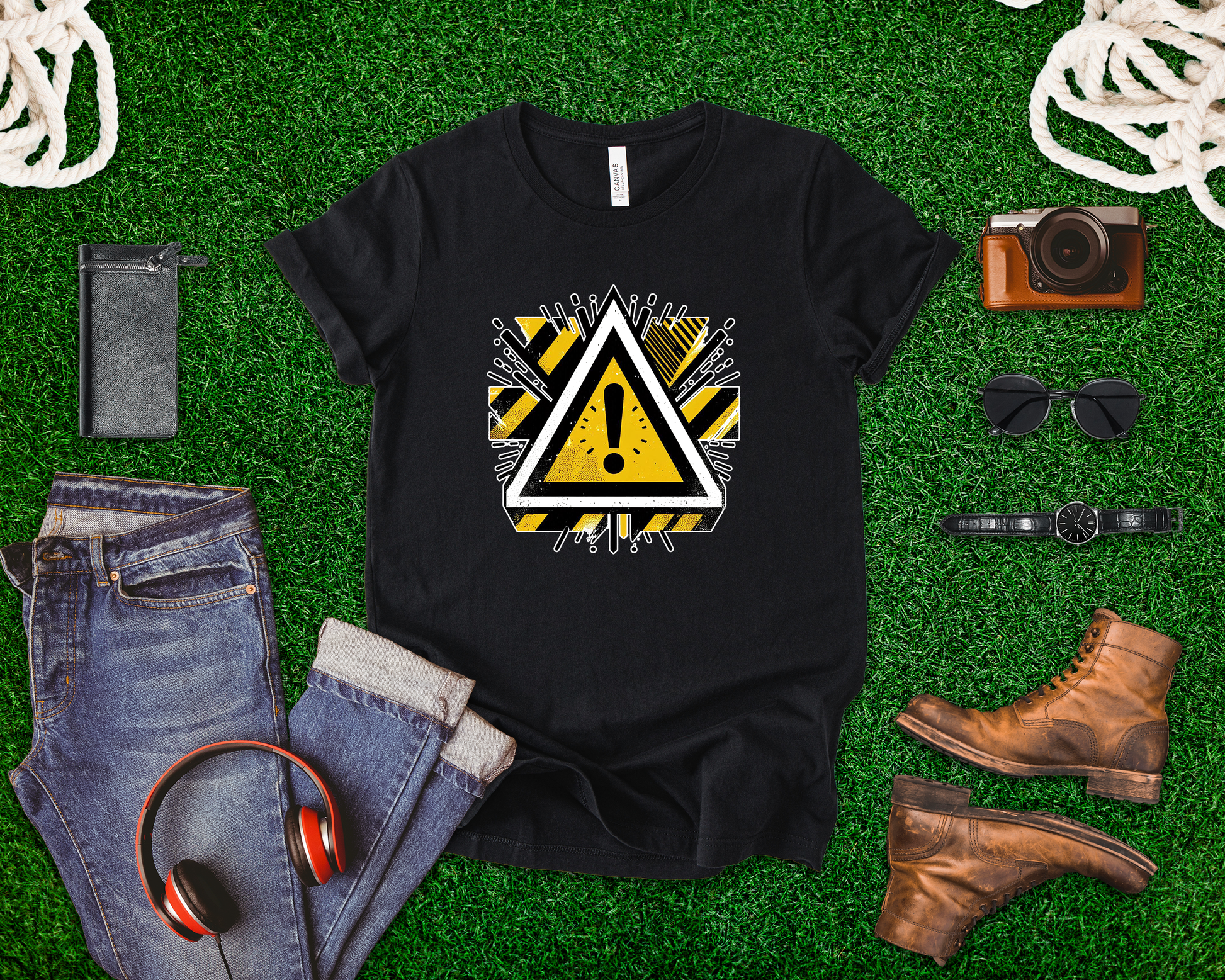 Make a bold statement with this abstract graphic t-shirt featuring a prominent warning symbol set against a dynamic, artistic abstract background. The design combines sharp geometric shapes and fluid patterns to create a visually striking contrast that draws attention while conveying a sense of caution and alertness. Perfect for fans of edgy, modern art and graphic tees that blend symbolism with contemporary style. Crafted from soft, comfortable fabric, this tee suits casual wear and street fashion alike.