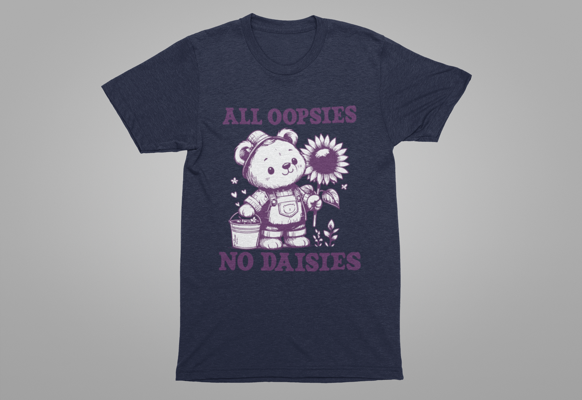Celebrate the perfectly imperfect with this adorable “All Oopsies No Daisies” T-shirt featuring a sweet teddy bear holding a bucket in one hand and a flowering plant in the other. This whimsical design captures the charm of life’s little messes and loving care. Perfect for anyone who embraces imperfection with a smile. A great gift for animal lovers, nature enthusiasts, or anyone who appreciates heartwarming, playful graphics.