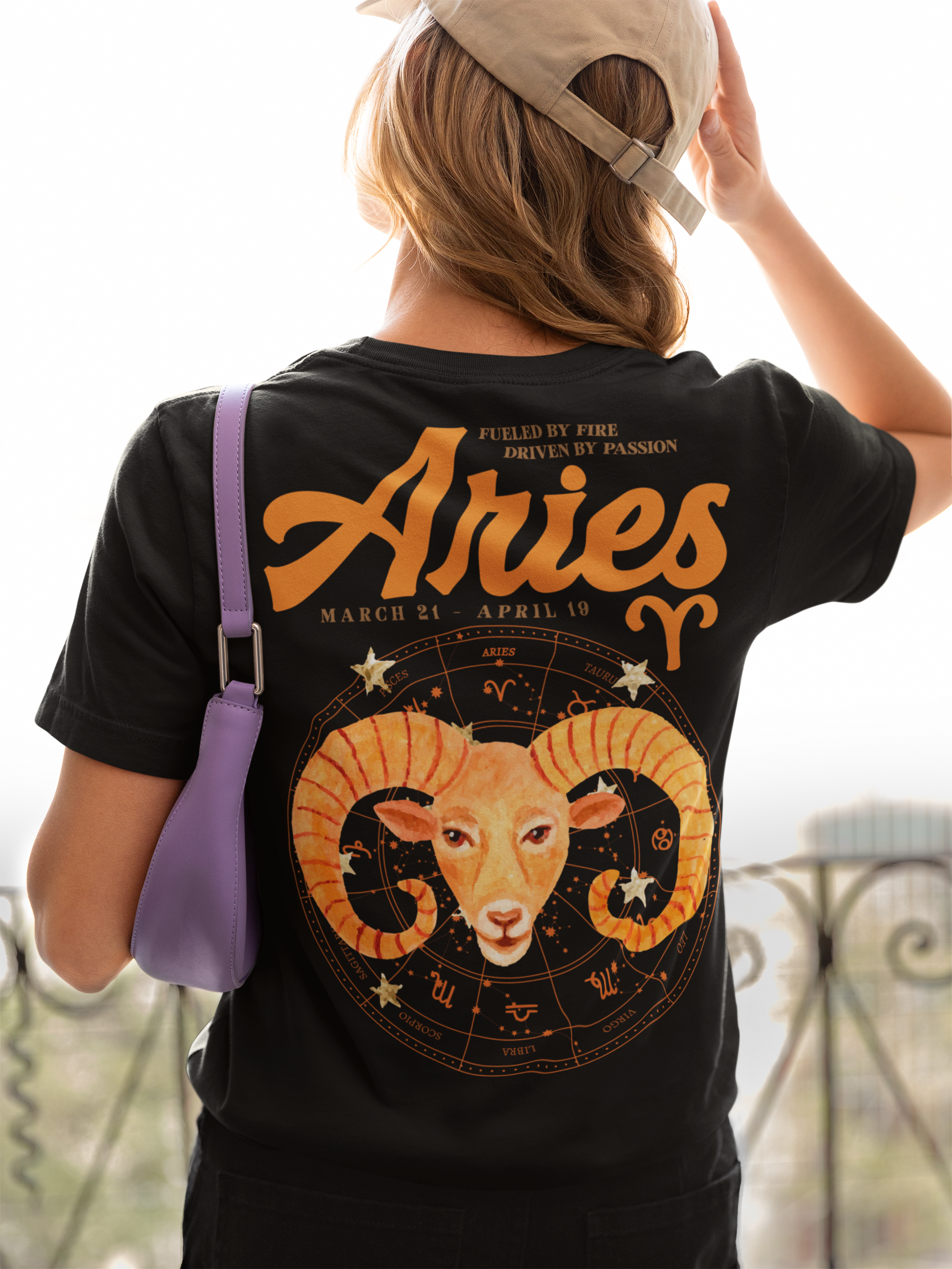 Ignite your passion and showcase your bold Aries identity with this stunning tshirt featuring a large Aries ram head at the center, set against a circular zodiac astrological wheel. The empowering top text “Aries Fueled by Fire Driven by Passion” highlights the adventurous and dynamic spirit of this fire sign—making it perfect for Aries natives and astrology enthusiasts who value energy and leadership.