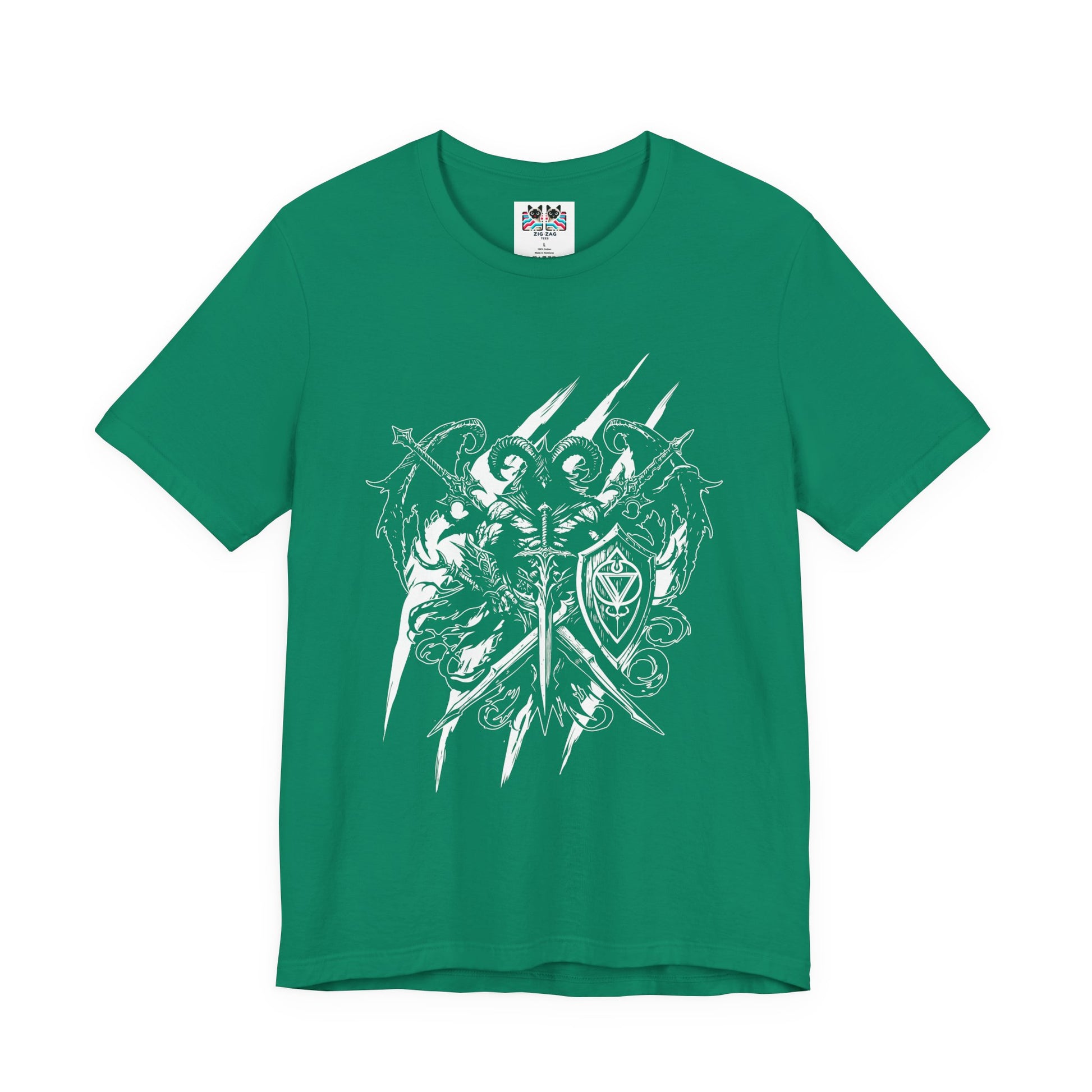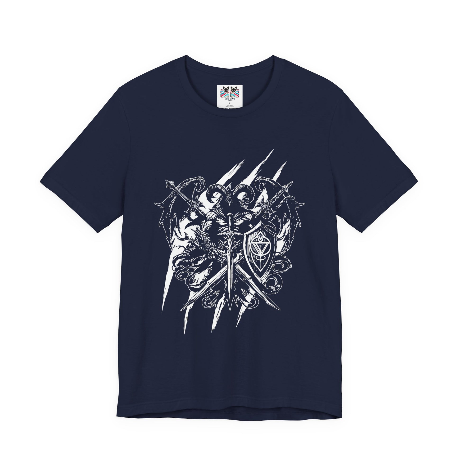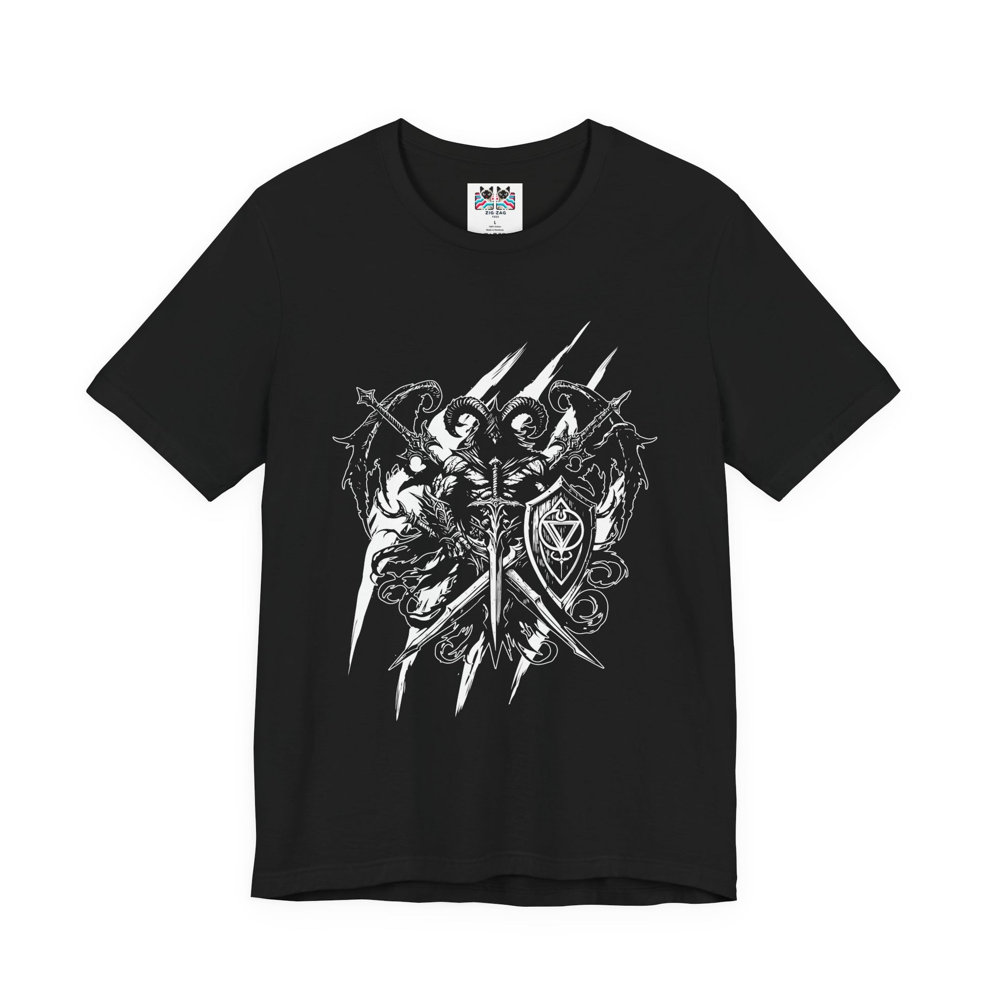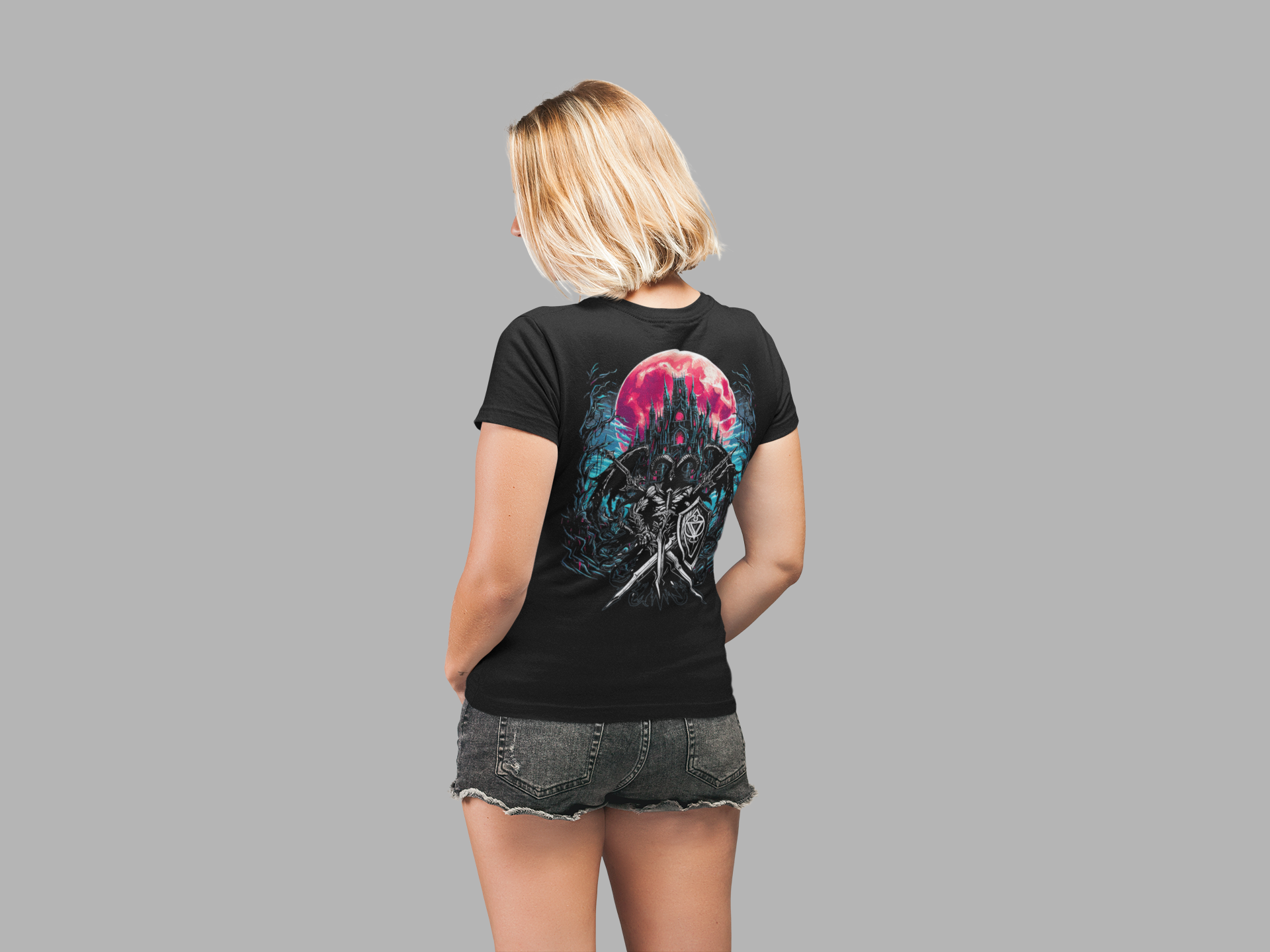 Enter dark fantasy mode with this epic graphic tee featuring an armored paladin with crossed swords and shield on the front, surrounded by gothic flourishes and claw-like slashes. The back design reveals the full scene with the warrior standing before a towering haunted castle under a glowing blood-red moon, framed by twisted branches and blue mist for maximum drama. Perfect for gamers, metalheads, DnD players, and dark fantasy fans, this shirt is ideal for conventions, concerts, RPG nights, or any outfit that needs a powerful heroic edge.