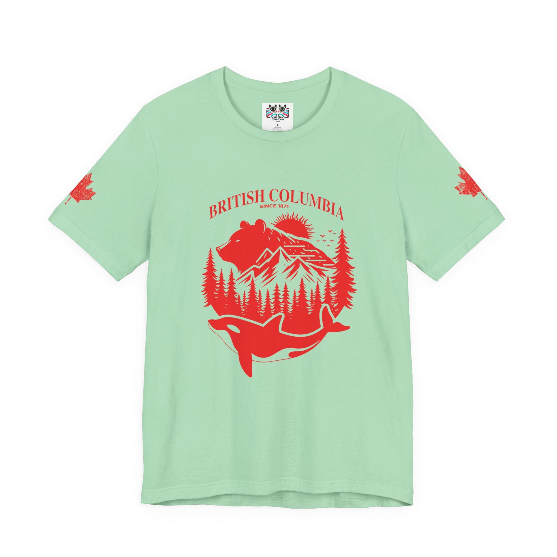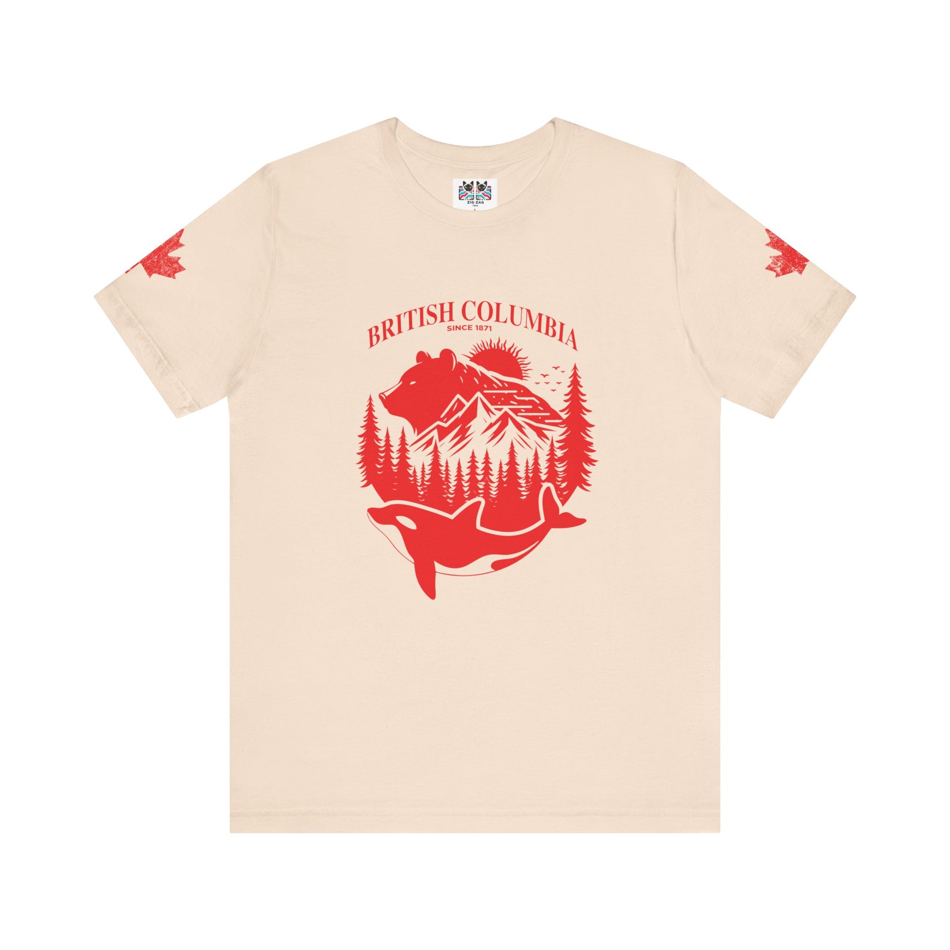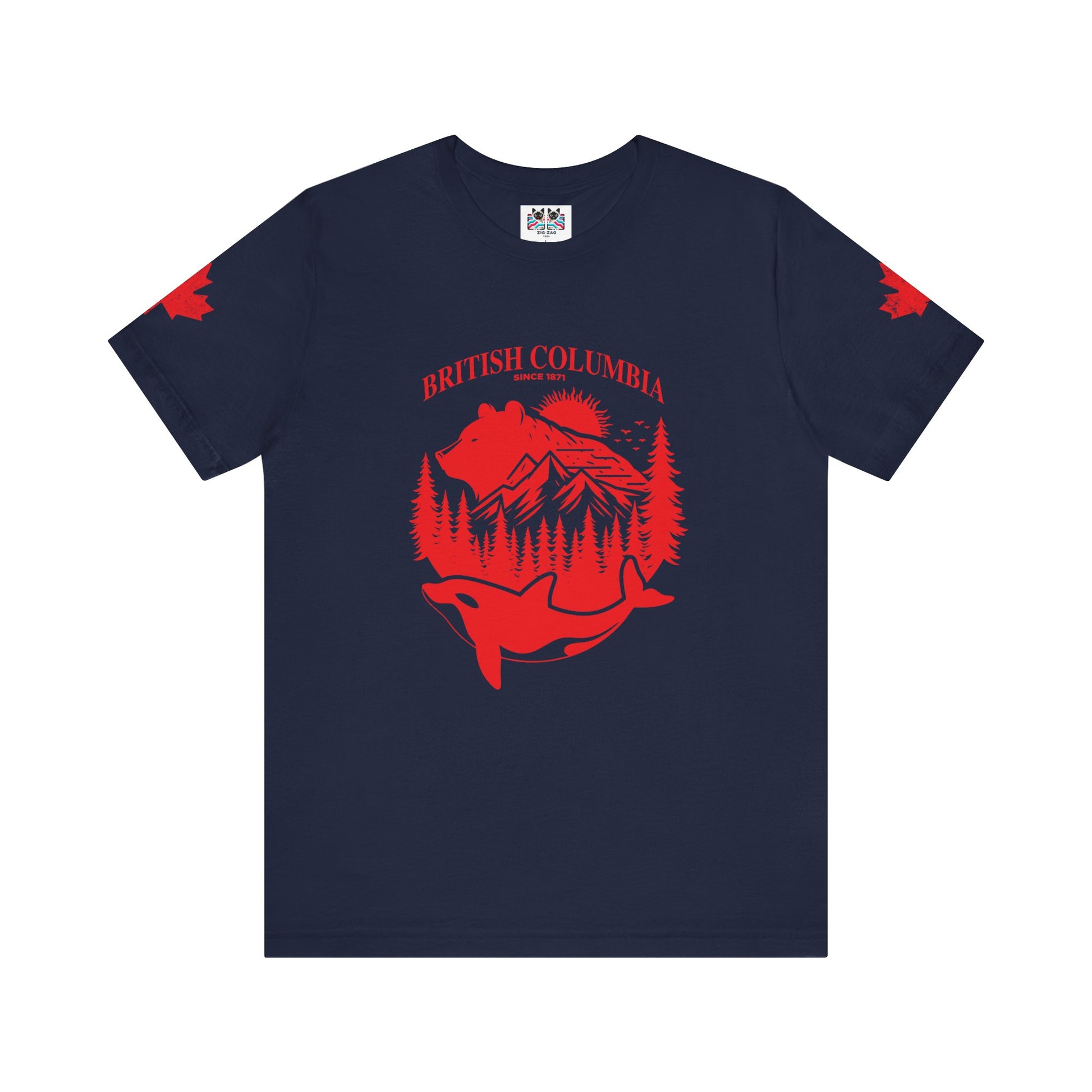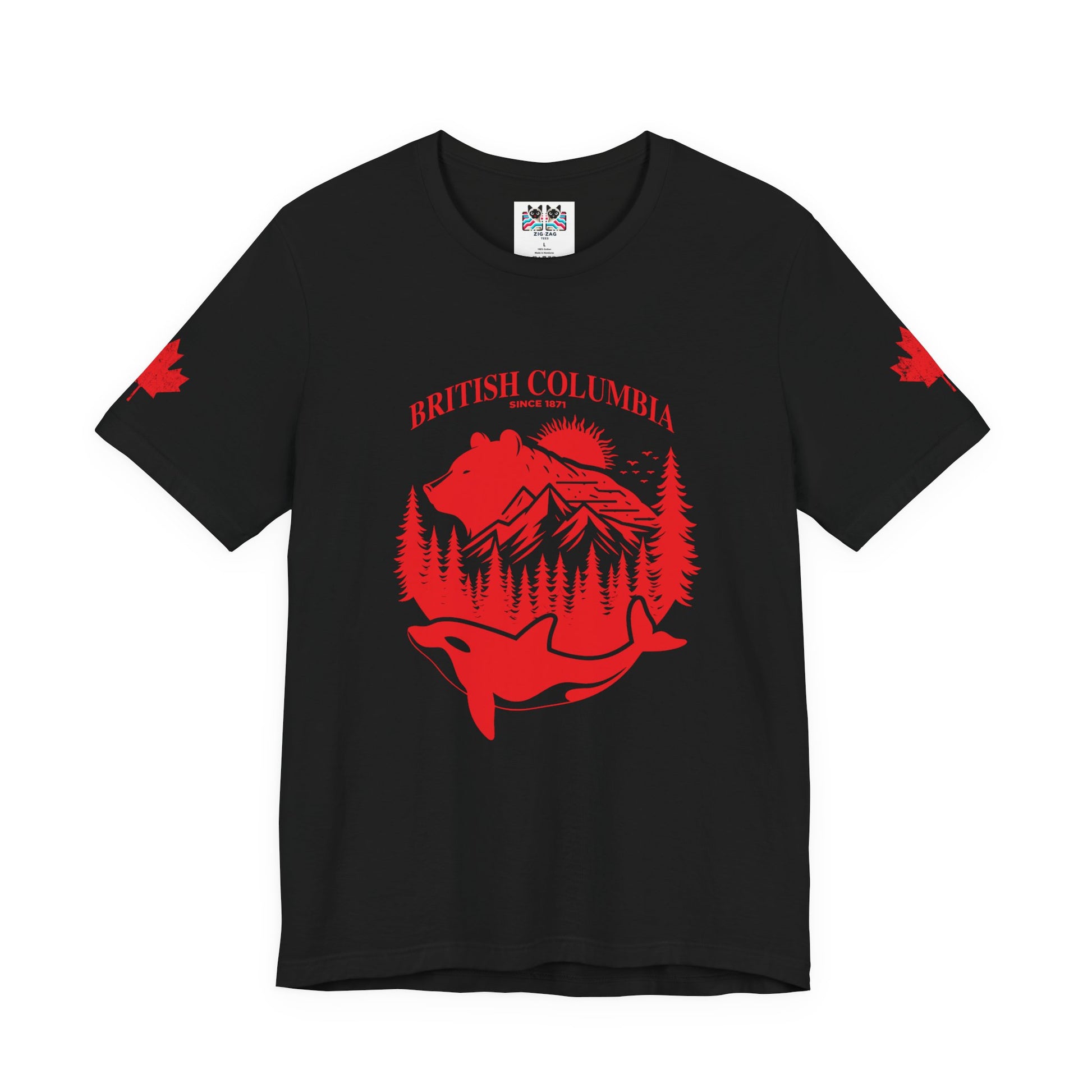 Showcase the spirit of British Columbia with this striking white t-shirt featuring a bold red graphic. The design highlights iconic BC wildlife and scenery—a majestic bear, snow-capped mountains, lush pine forests, and a leaping orca whale—all arranged within a circular emblem. “BRITISH COLUMBIA Since 1871” arches above, while maple leaf accents on both sleeves add national flair. This tee celebrates the province’s rich heritage and natural beauty, making it a perfect choice for locals, travelers, or anyone passionate about Canada’s west coast.