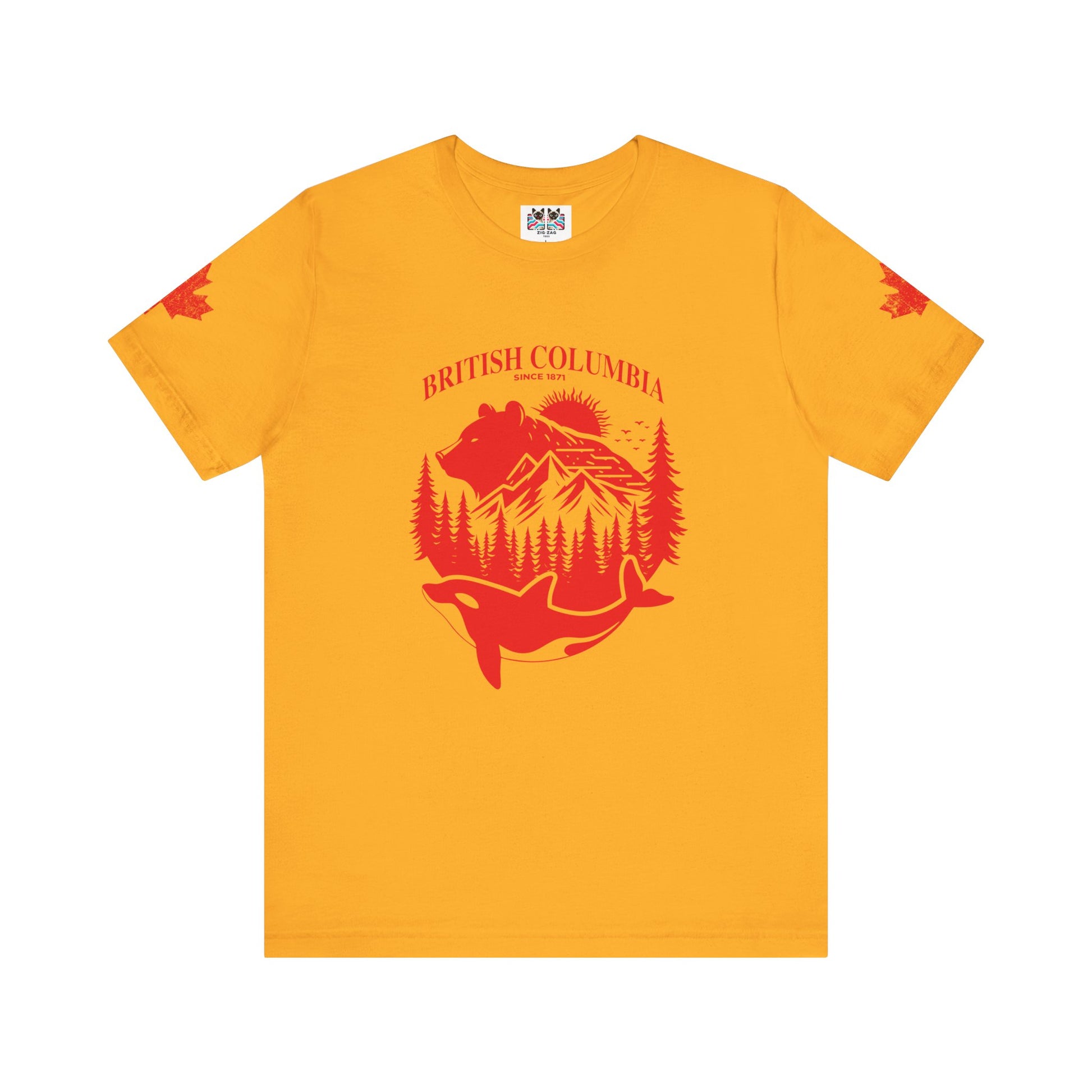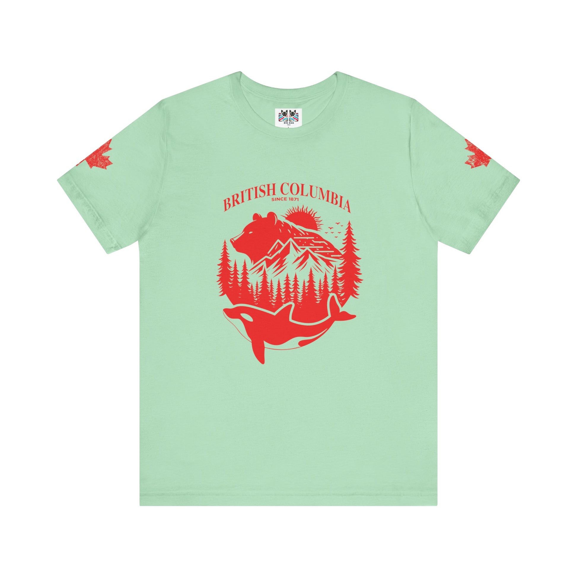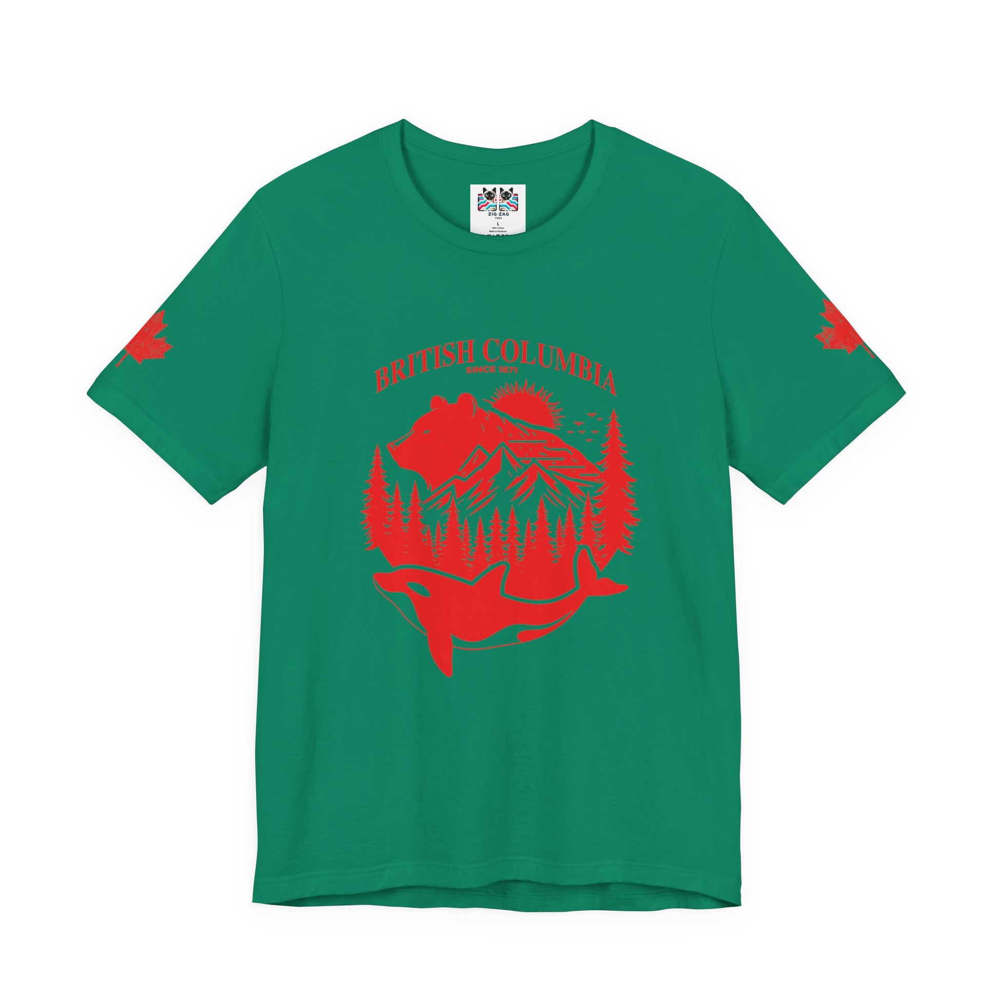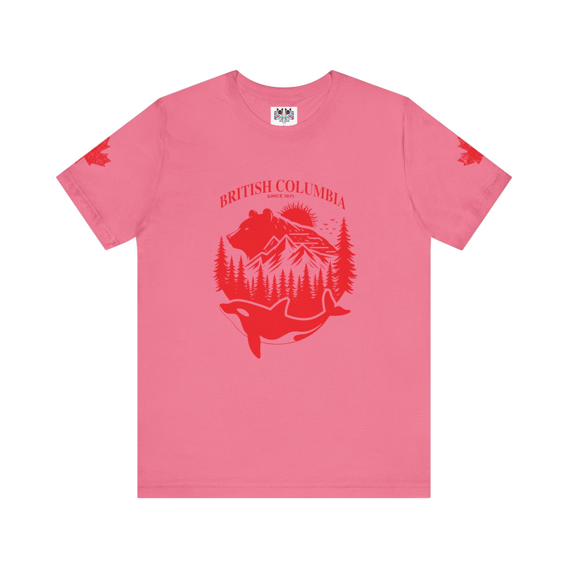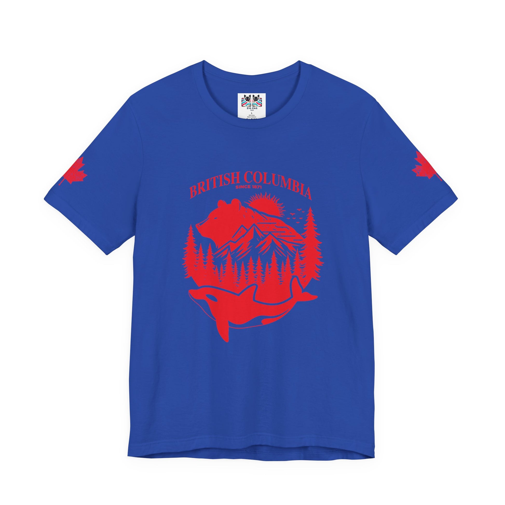 Showcase the spirit of British Columbia with this striking white t-shirt featuring a bold red graphic. The design highlights iconic BC wildlife and scenery—a majestic bear, snow-capped mountains, lush pine forests, and a leaping orca whale—all arranged within a circular emblem. “BRITISH COLUMBIA Since 1871” arches above, while maple leaf accents on both sleeves add national flair. This tee celebrates the province’s rich heritage and natural beauty, making it a perfect choice for locals, travelers, or anyone passionate about Canada’s west coast.