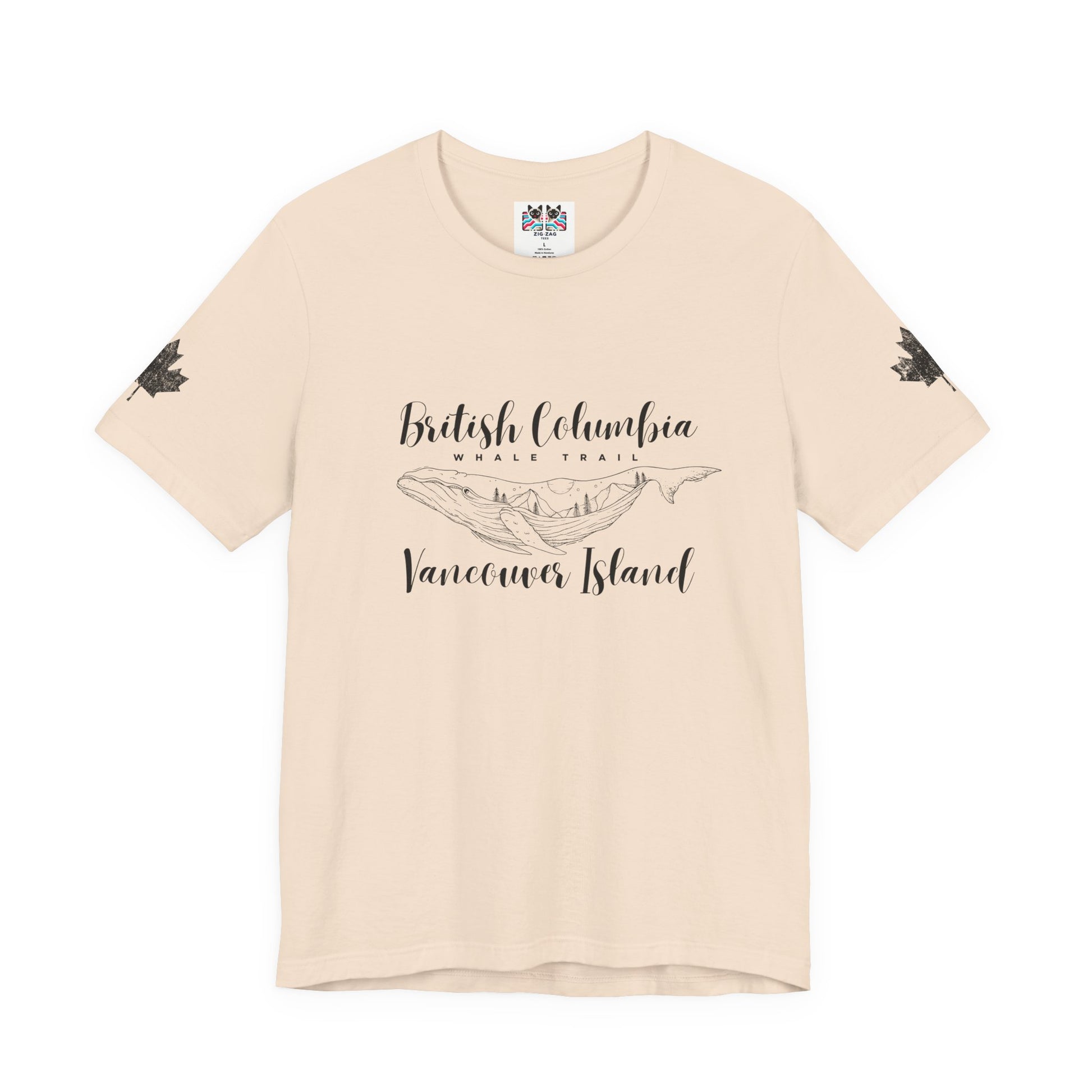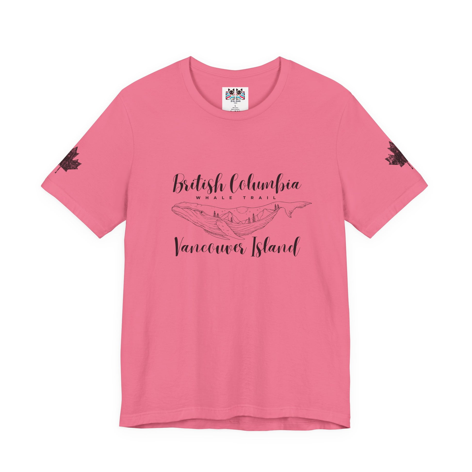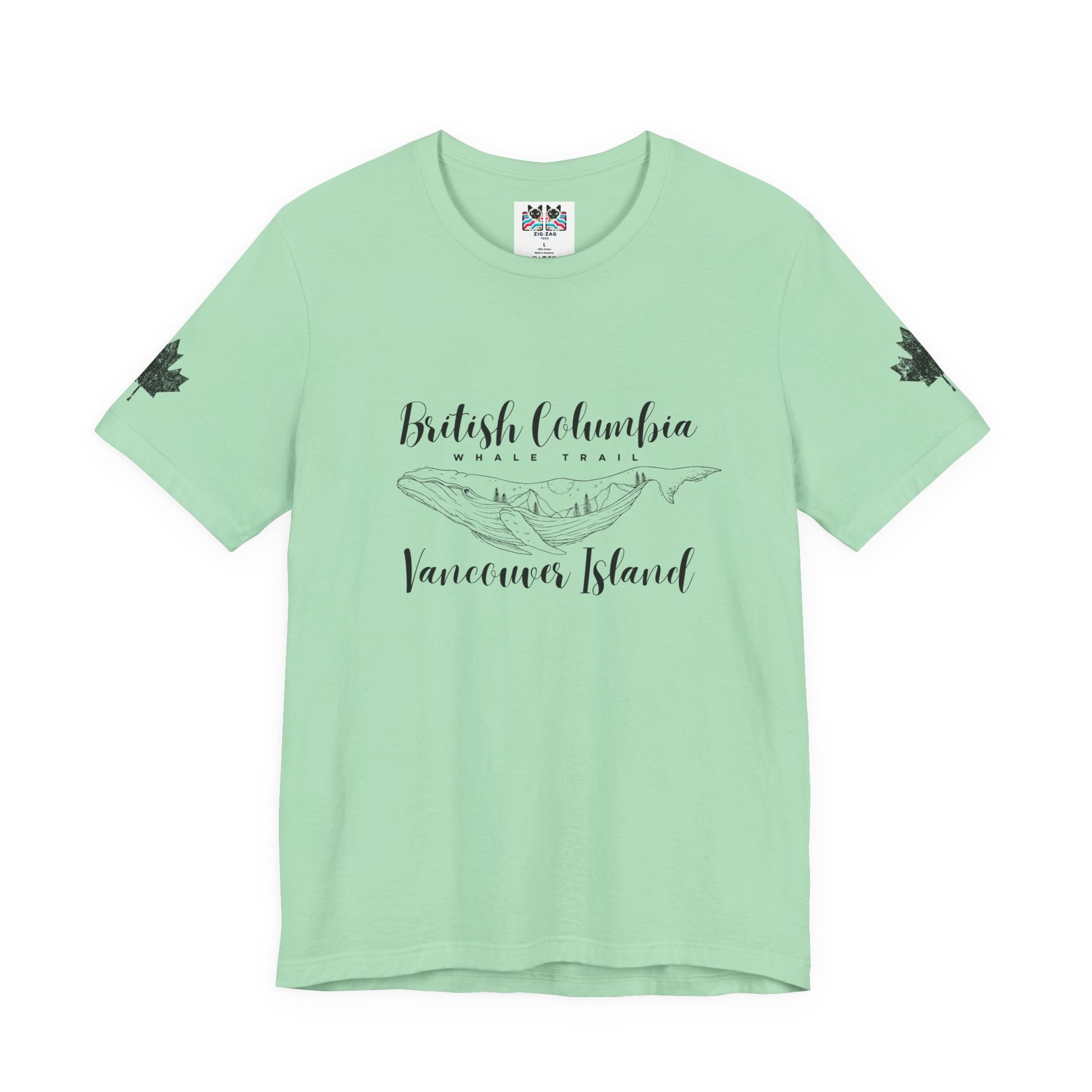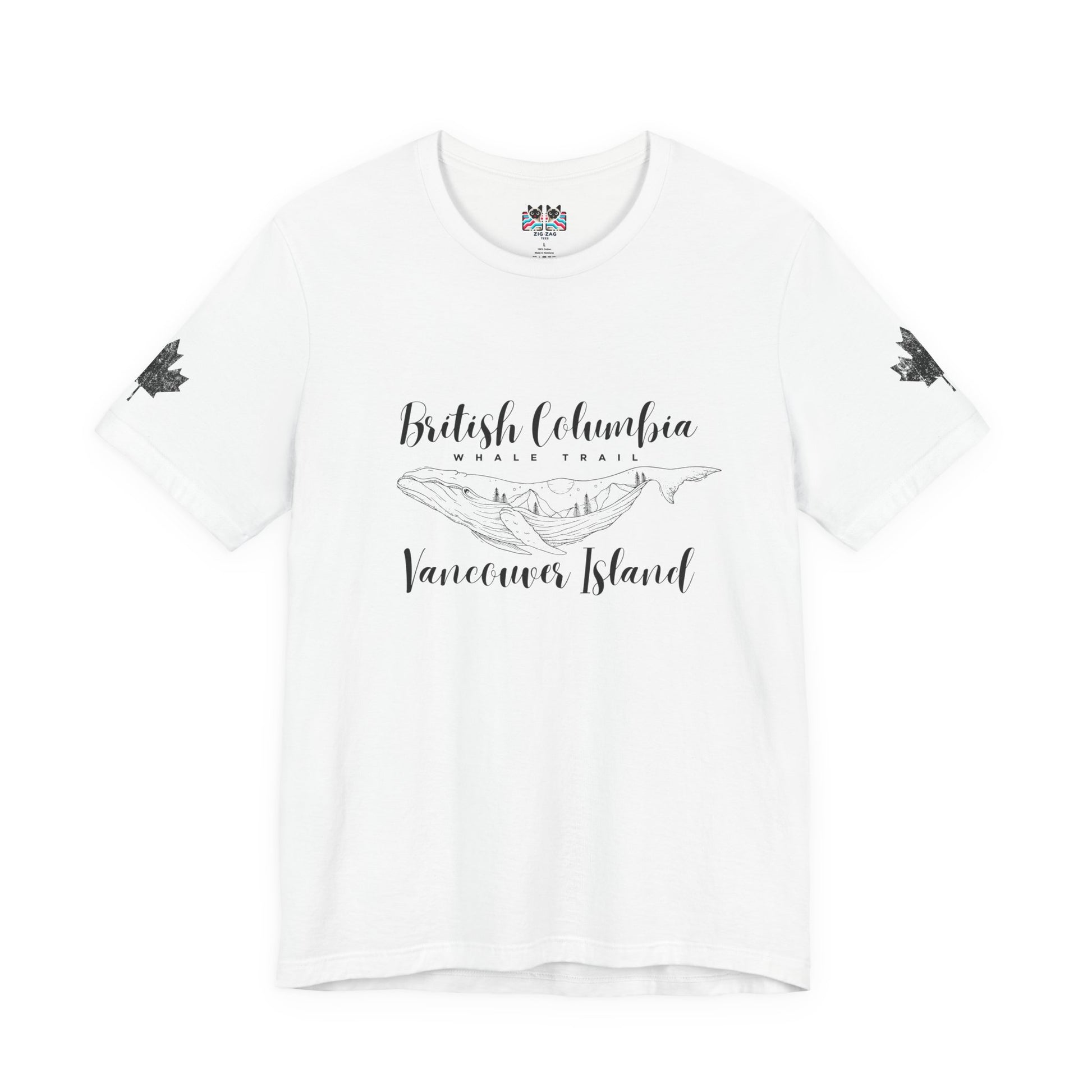 Celebrate the magic of the Pacific coast with this minimalist t-shirt showcasing the phrase “British Columbia Whale Trail Vancouver Island.” The center graphic features a majestic whale with Vancouver Island’s landscapes and mountains etched inside, blending ocean and wild nature. Both sleeves display large maple leaf prints, adding a subtle Canadian touch. Perfect for travelers, wildlife lovers, and anyone passionate about the beautiful shores and adventures of British Columbia.