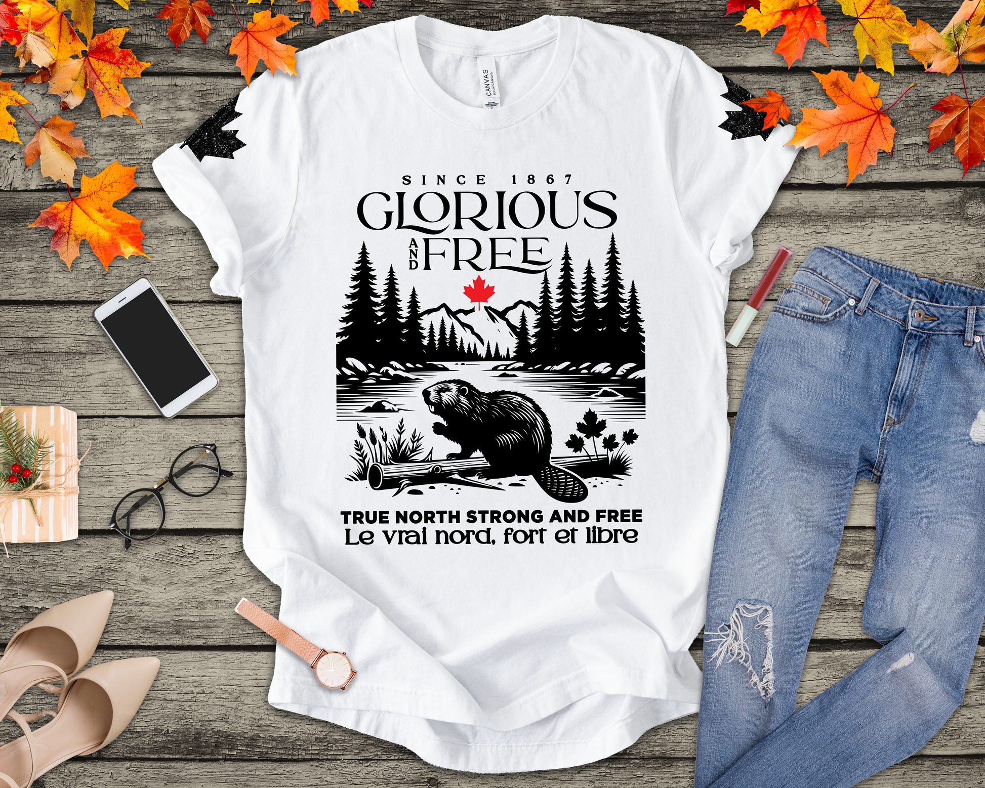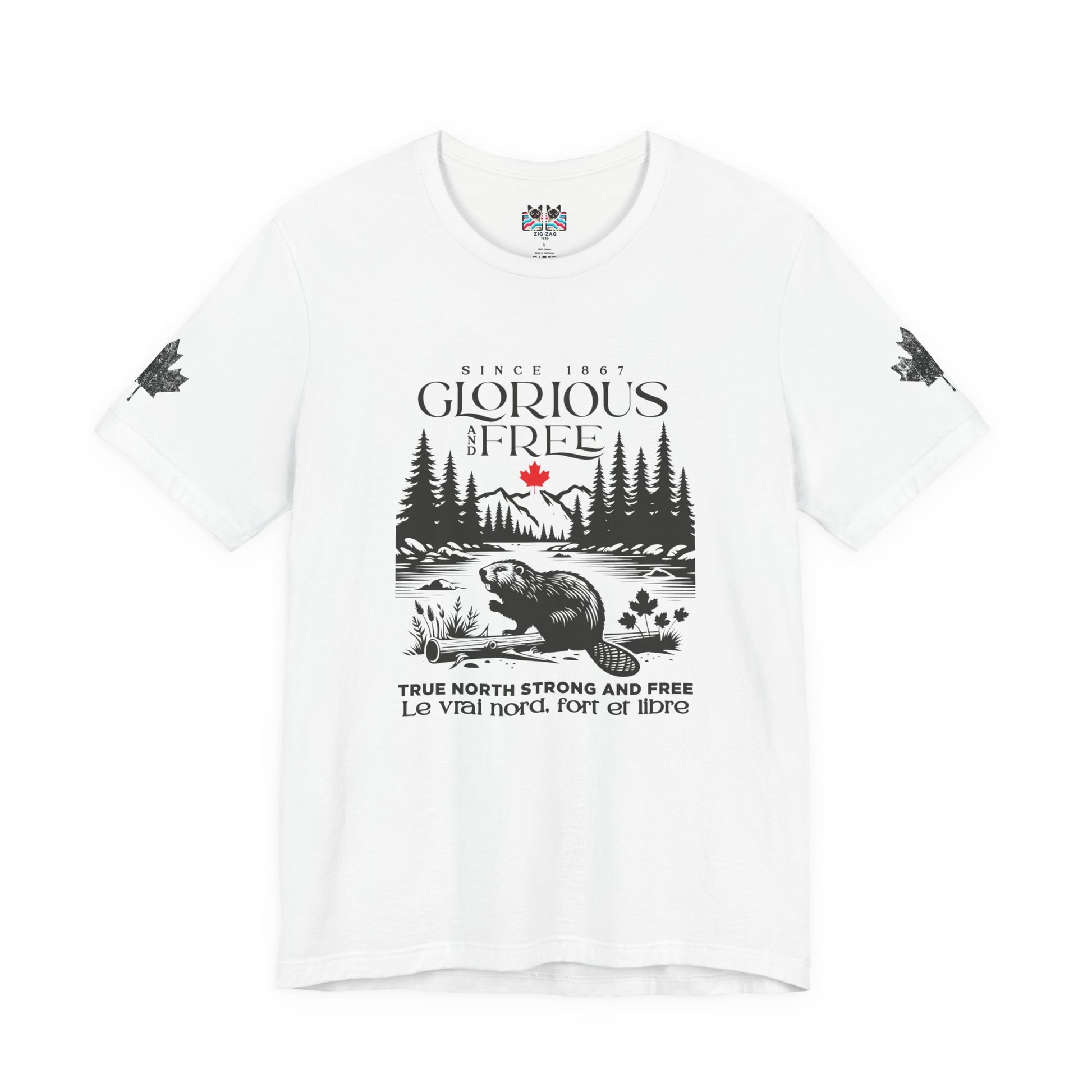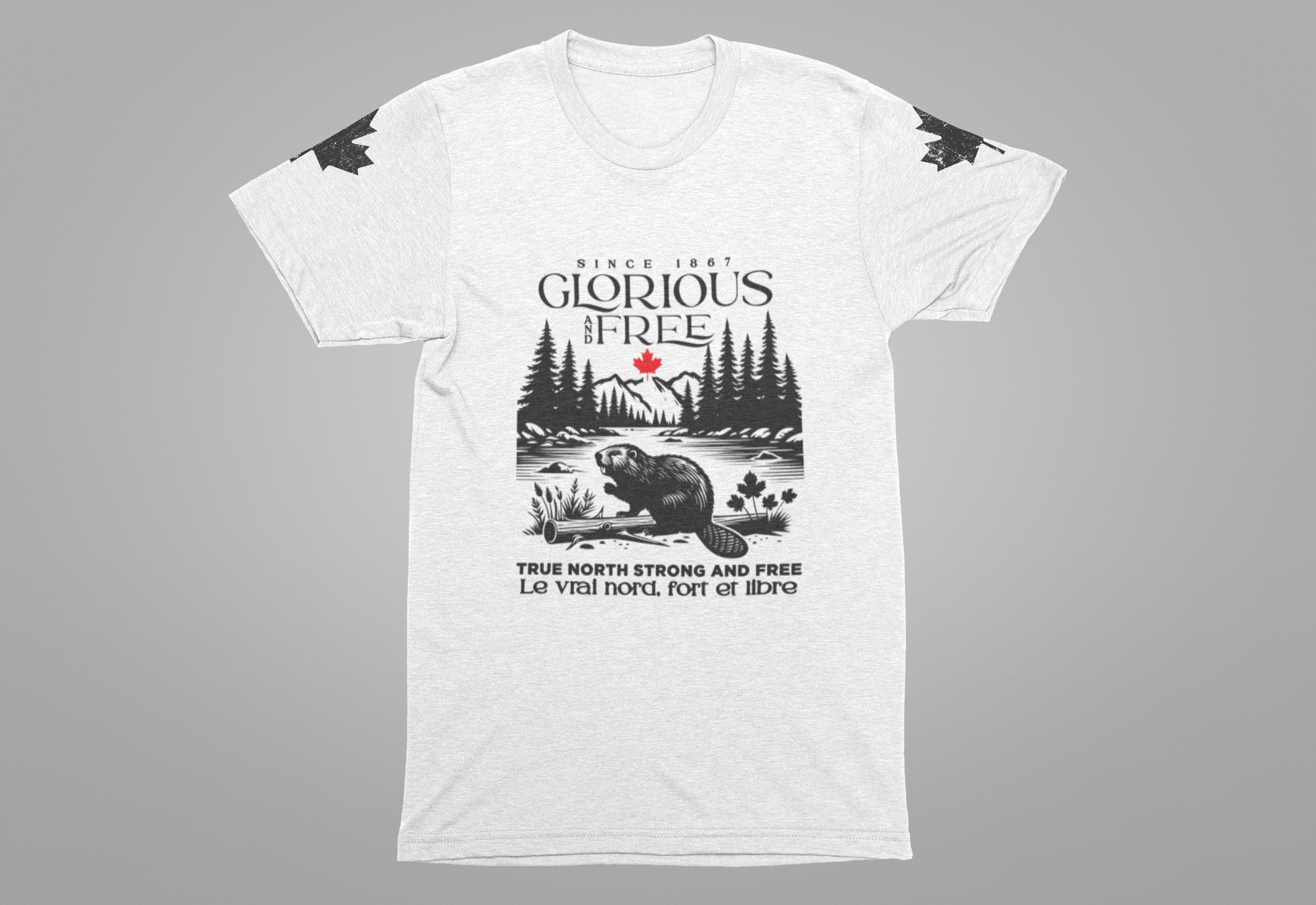 Celebrate the Canadian wilderness and heritage with this t-shirt showcasing a proud beaver sitting on a log in the foreground, with lakes, mountains, and forests stretching behind. A red maple leaf crowns the top peak, surrounded by the slogan “Since 1867 Glorious and Free.” At the bottom, the bilingual motto “True North Strong and Free, Le Vrai Nord, Fort Et Libre” reflects Canada’s enduring legacy. This comfortable, patriotic tee is perfect for Canada Day, outdoor fans, or anyone wanting to honor the true north and its iconic wildlife.