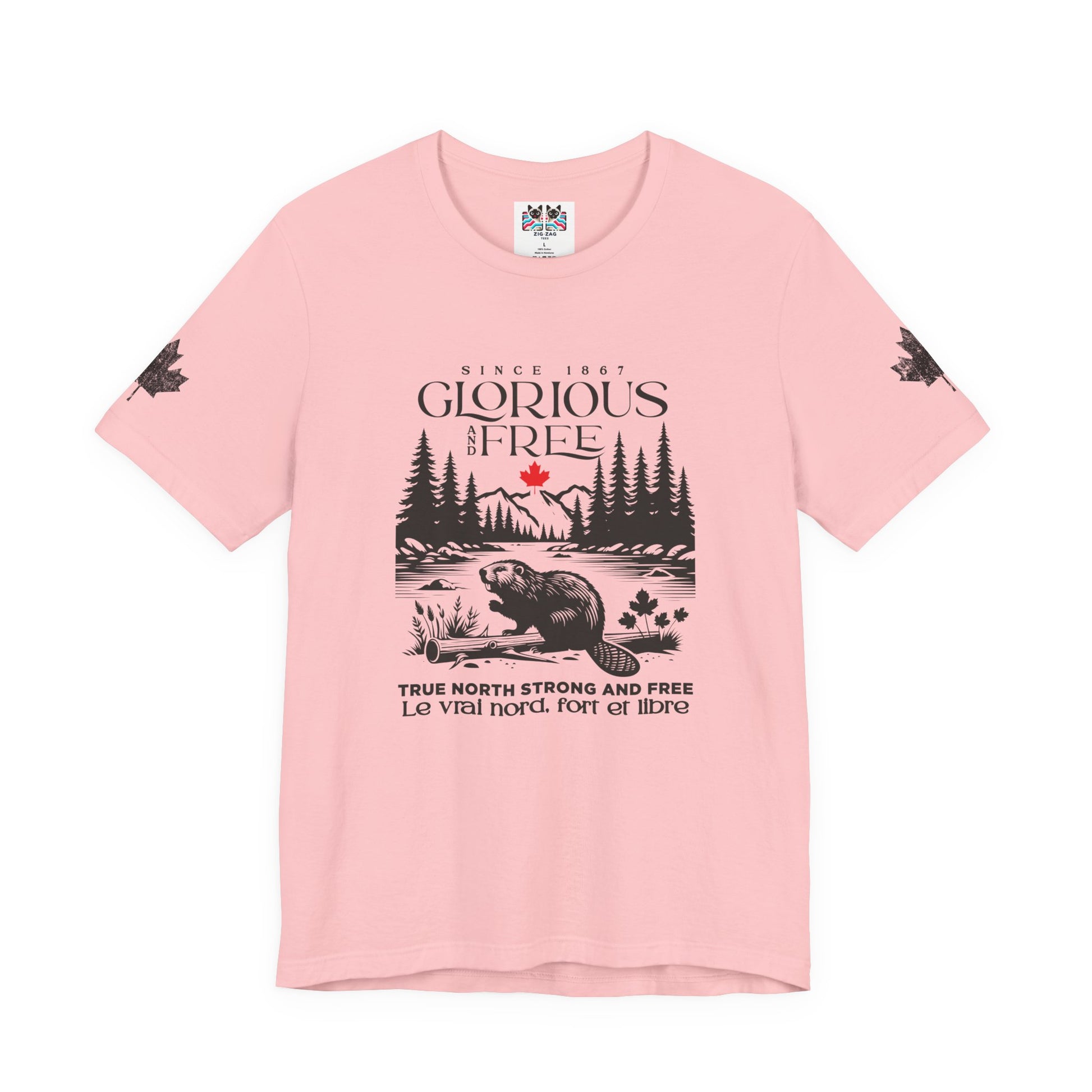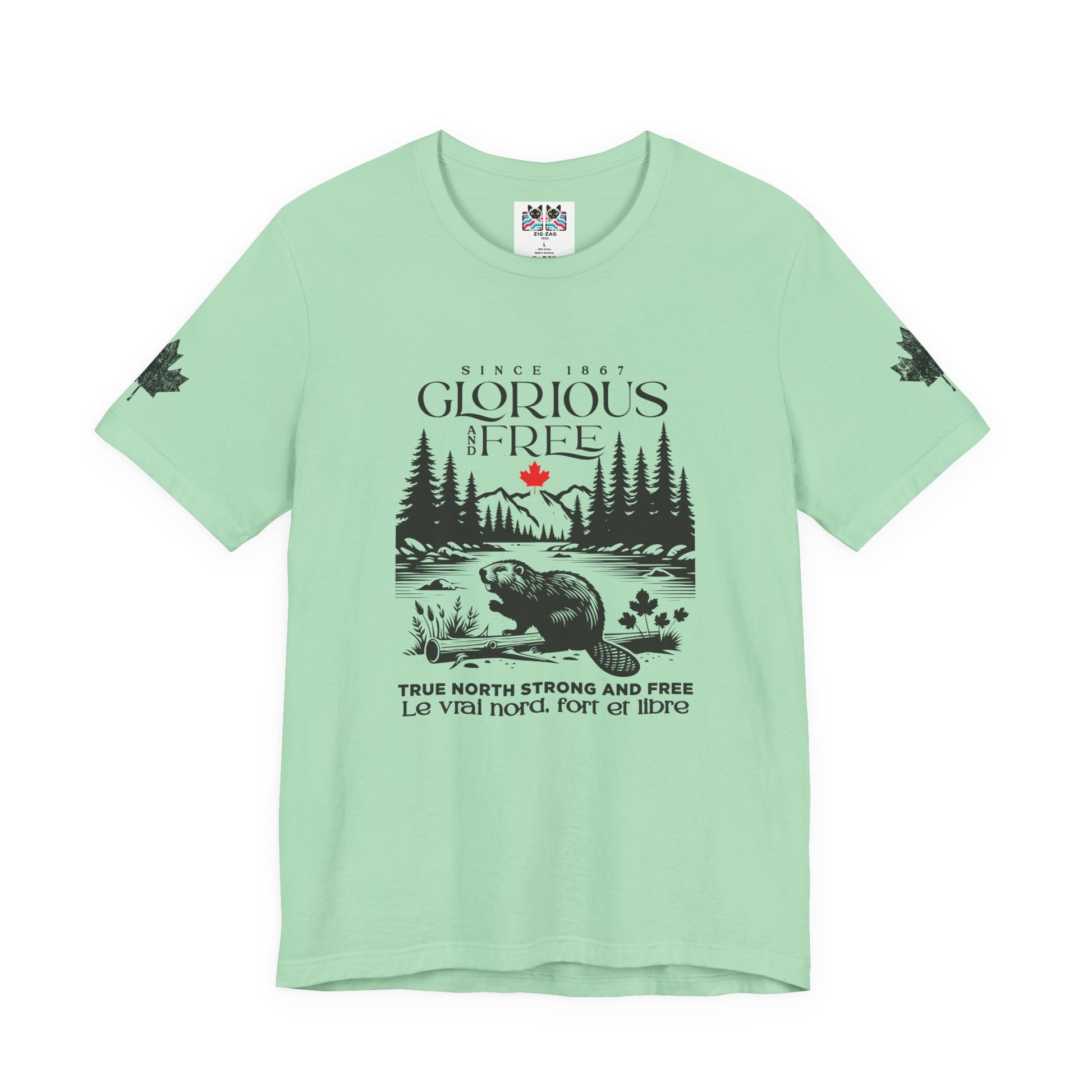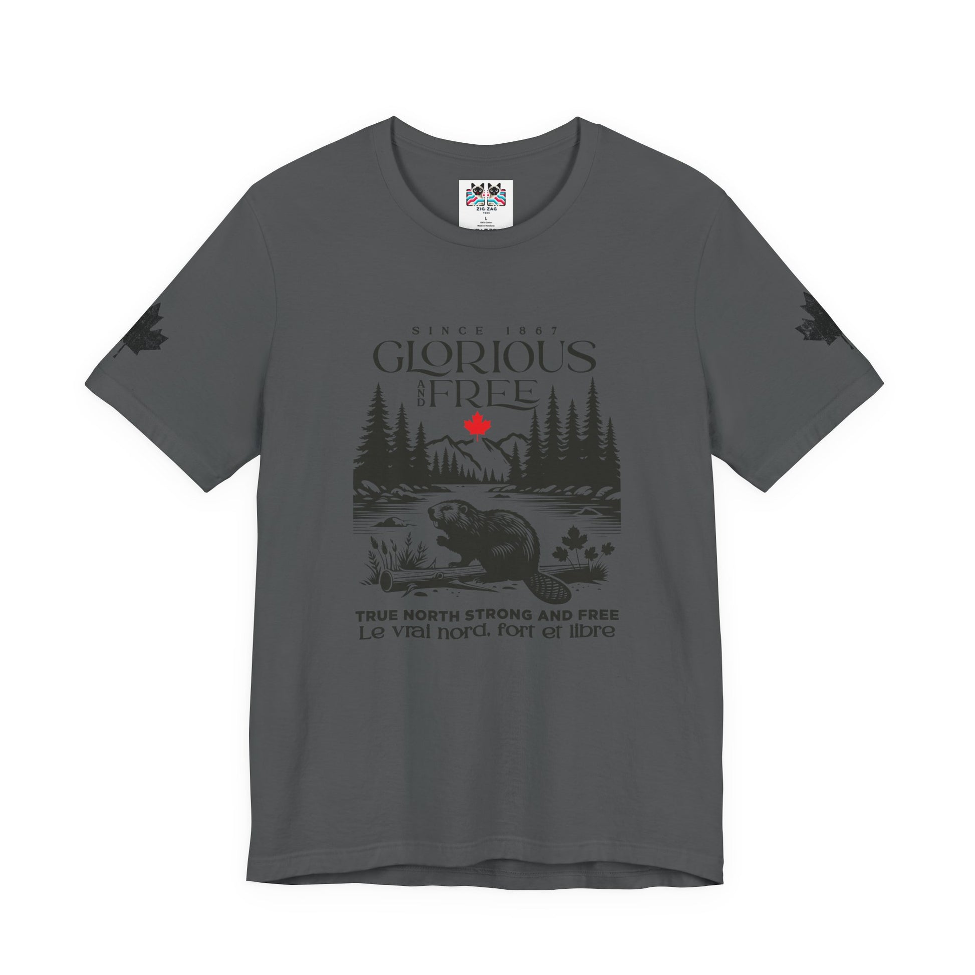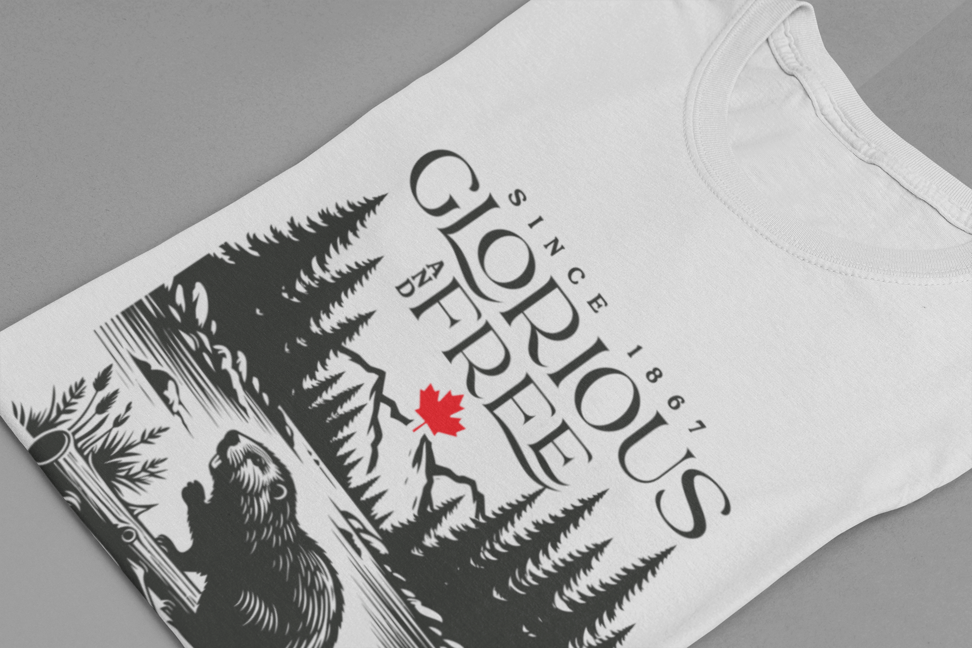 Celebrate the Canadian wilderness and heritage with this t-shirt showcasing a proud beaver sitting on a log in the foreground, with lakes, mountains, and forests stretching behind. A red maple leaf crowns the top peak, surrounded by the slogan “Since 1867 Glorious and Free.” At the bottom, the bilingual motto “True North Strong and Free, Le Vrai Nord, Fort Et Libre” reflects Canada’s enduring legacy. This comfortable, patriotic tee is perfect for Canada Day, outdoor fans, or anyone wanting to honor the true north and its iconic wildlife.