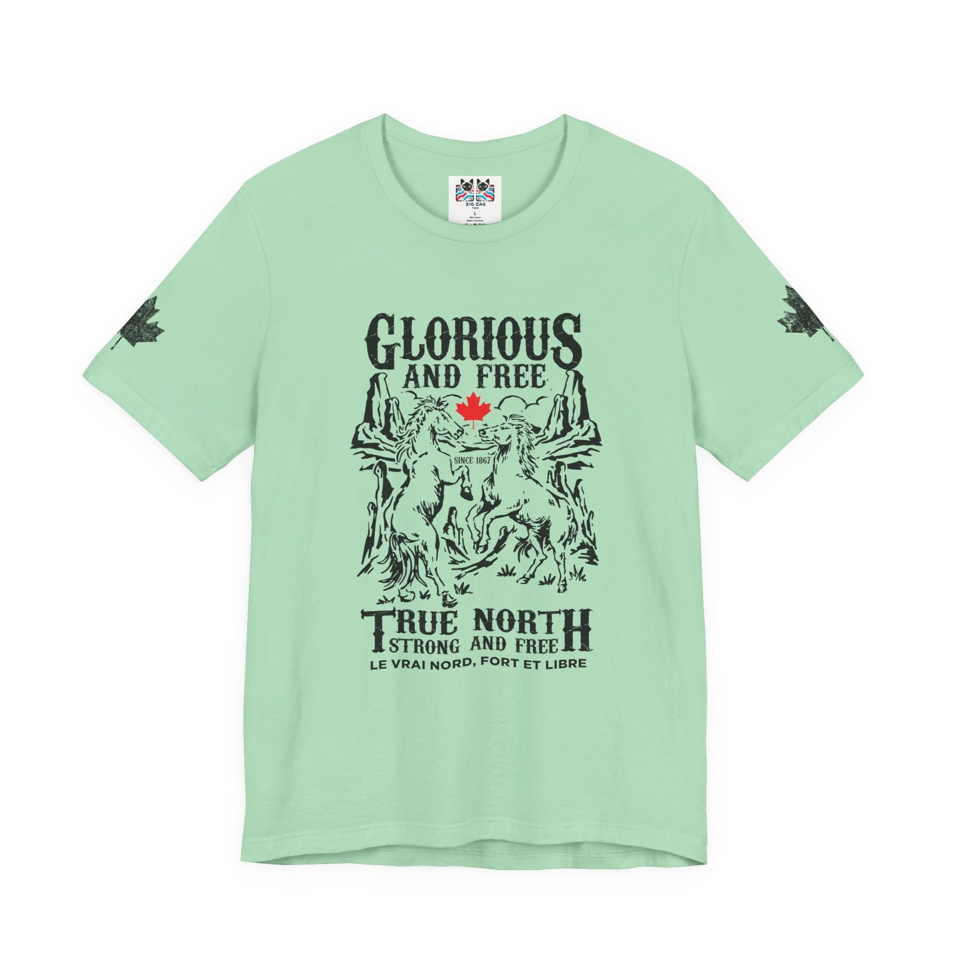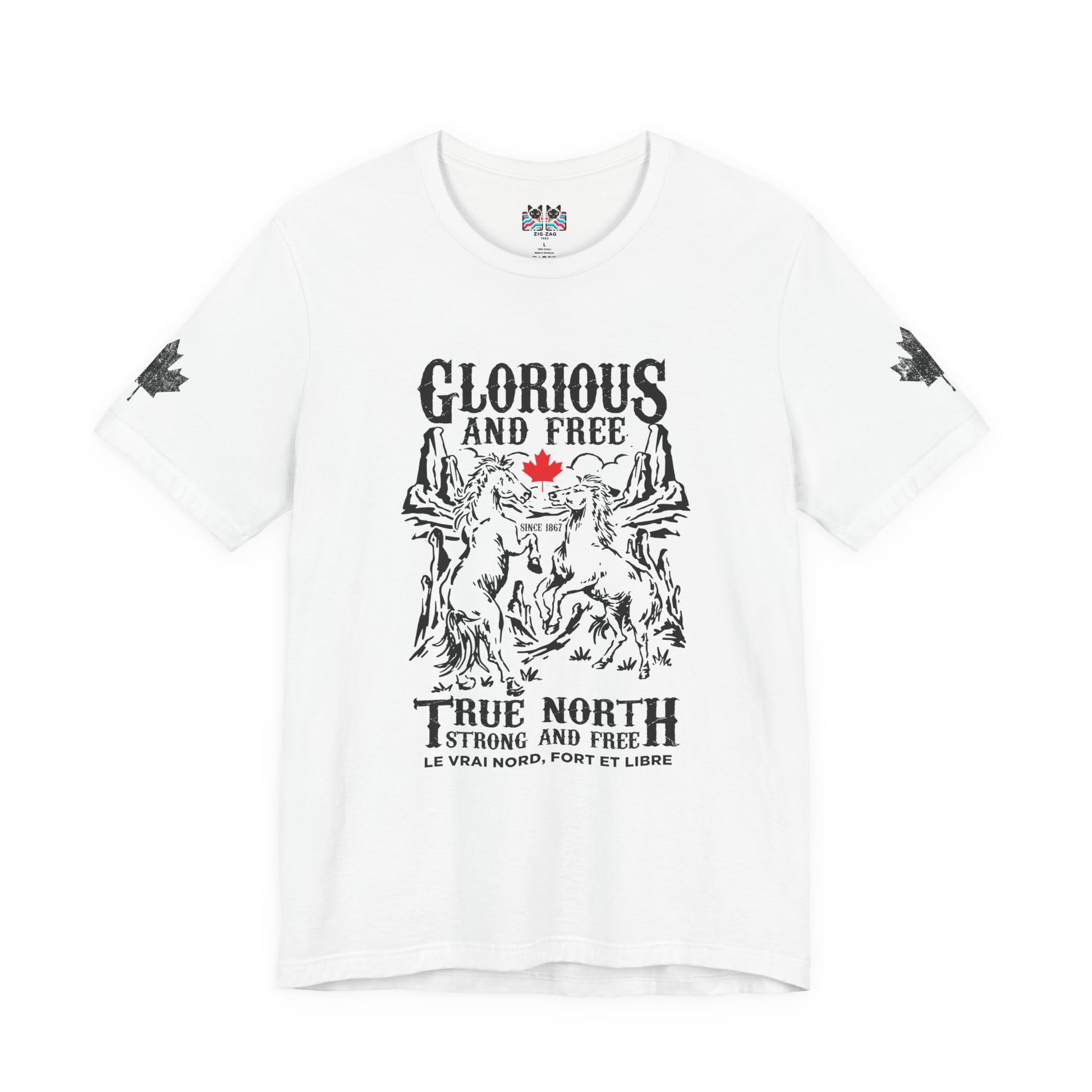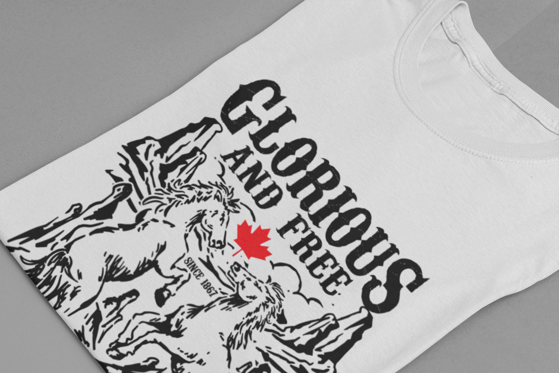 Celebrate Canadian history and resilience with this striking t-shirt featuring two majestic Canadian horses standing, facing each other against a backdrop of mountains crowned with a red maple leaf at the peak. The top text reads “Since 1867 Glorious and Free,” while the horses proudly display “True North Strong and Free.” At the bottom, the inspirational bilingual motto “Le Vrai Nord, Fort Et Libre”