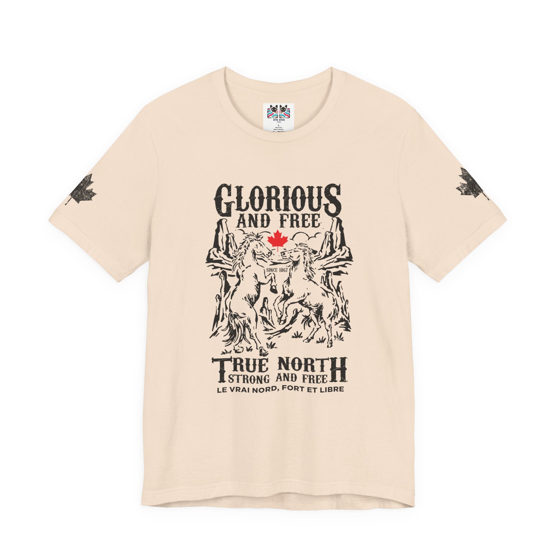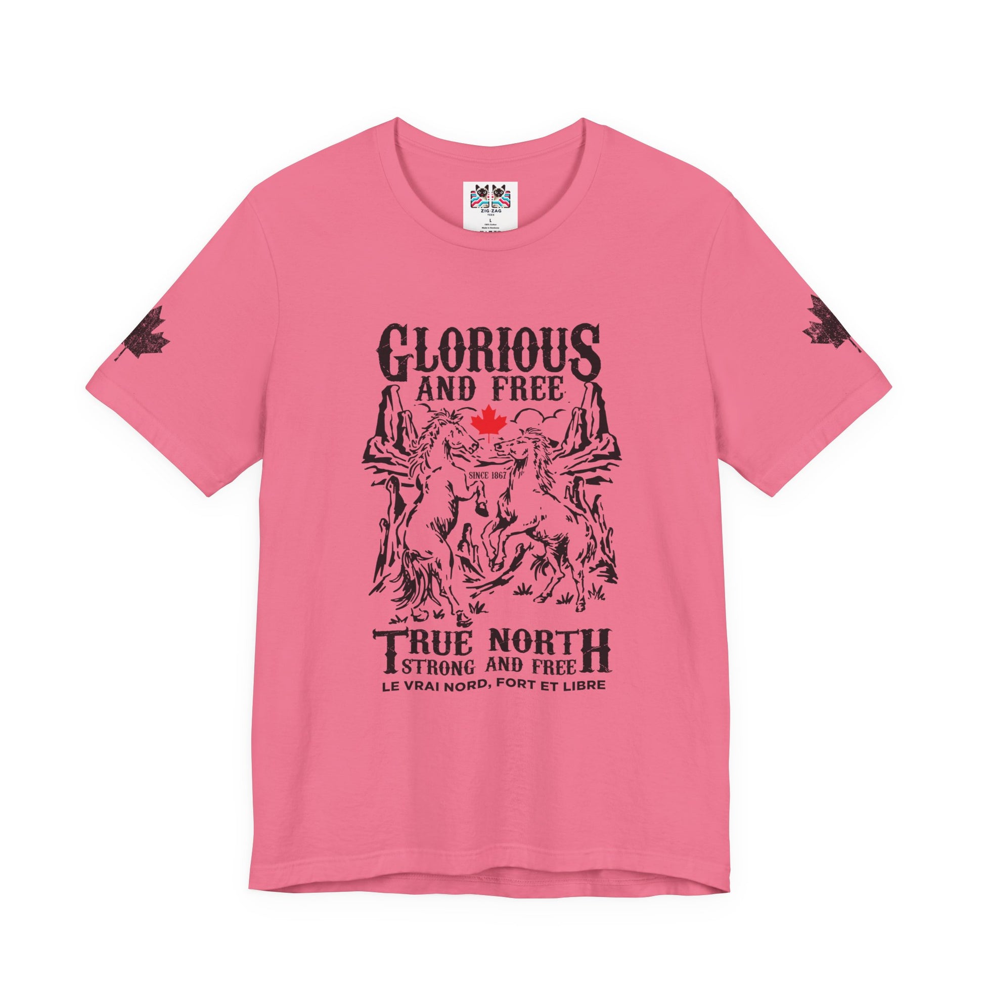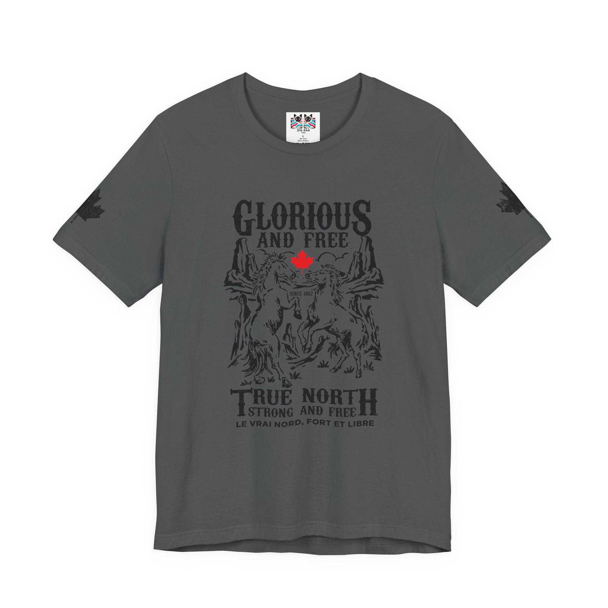 Celebrate Canadian history and resilience with this striking t-shirt featuring two majestic Canadian horses standing, facing each other against a backdrop of mountains crowned with a red maple leaf at the peak. The top text reads “Since 1867 Glorious and Free,” while the horses proudly display “True North Strong and Free.” At the bottom, the inspirational bilingual motto “Le Vrai Nord, Fort Et Libre”