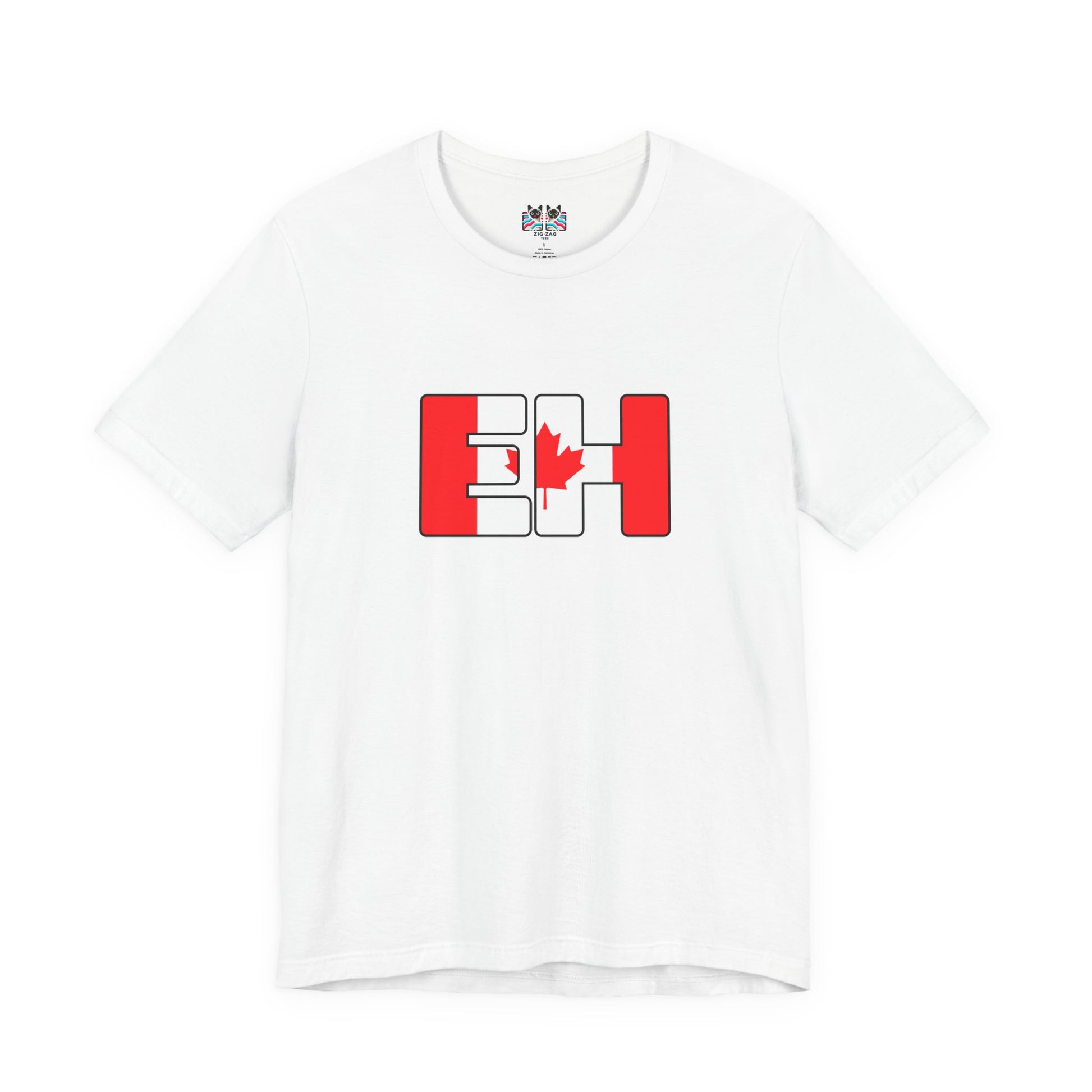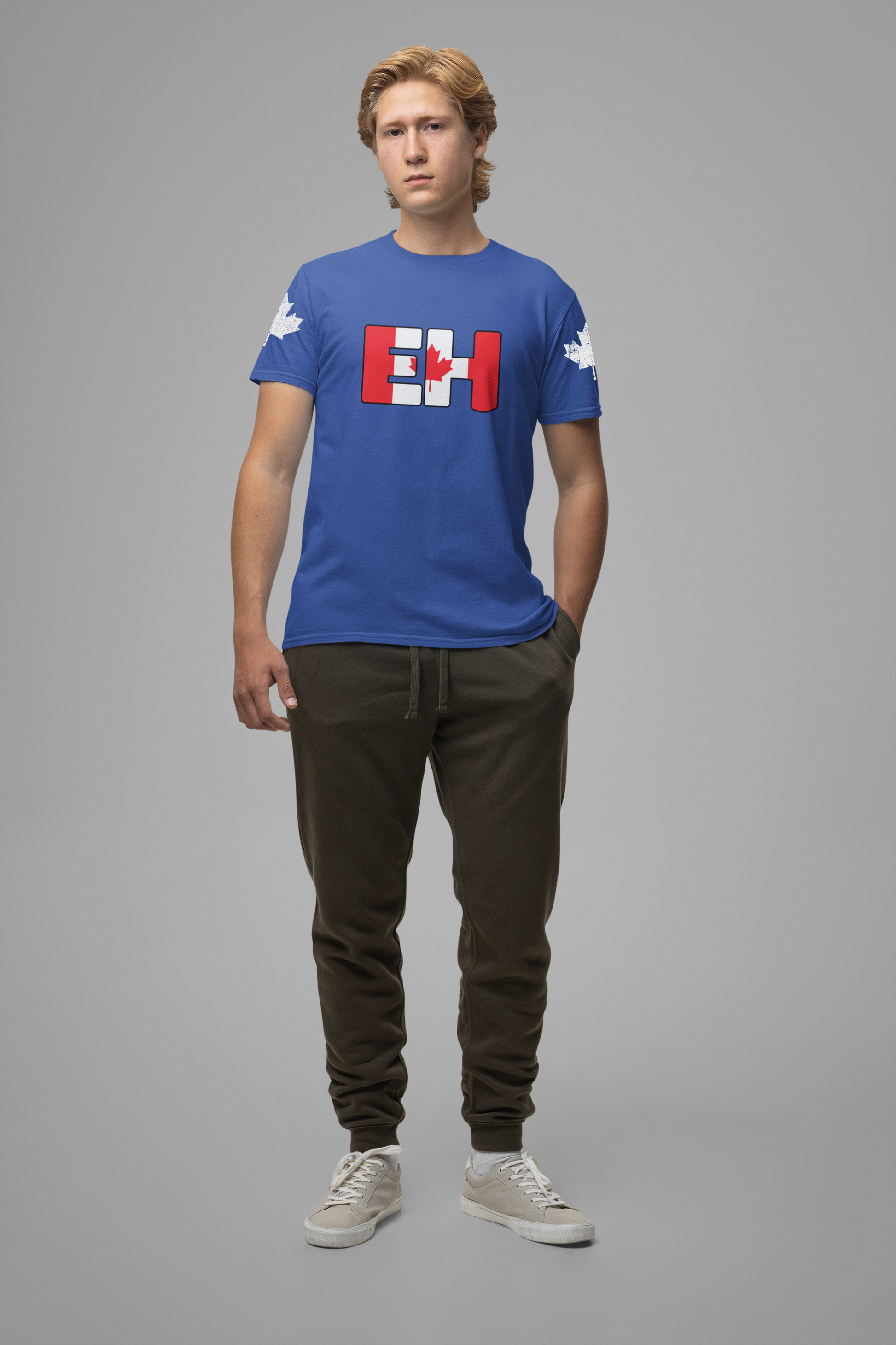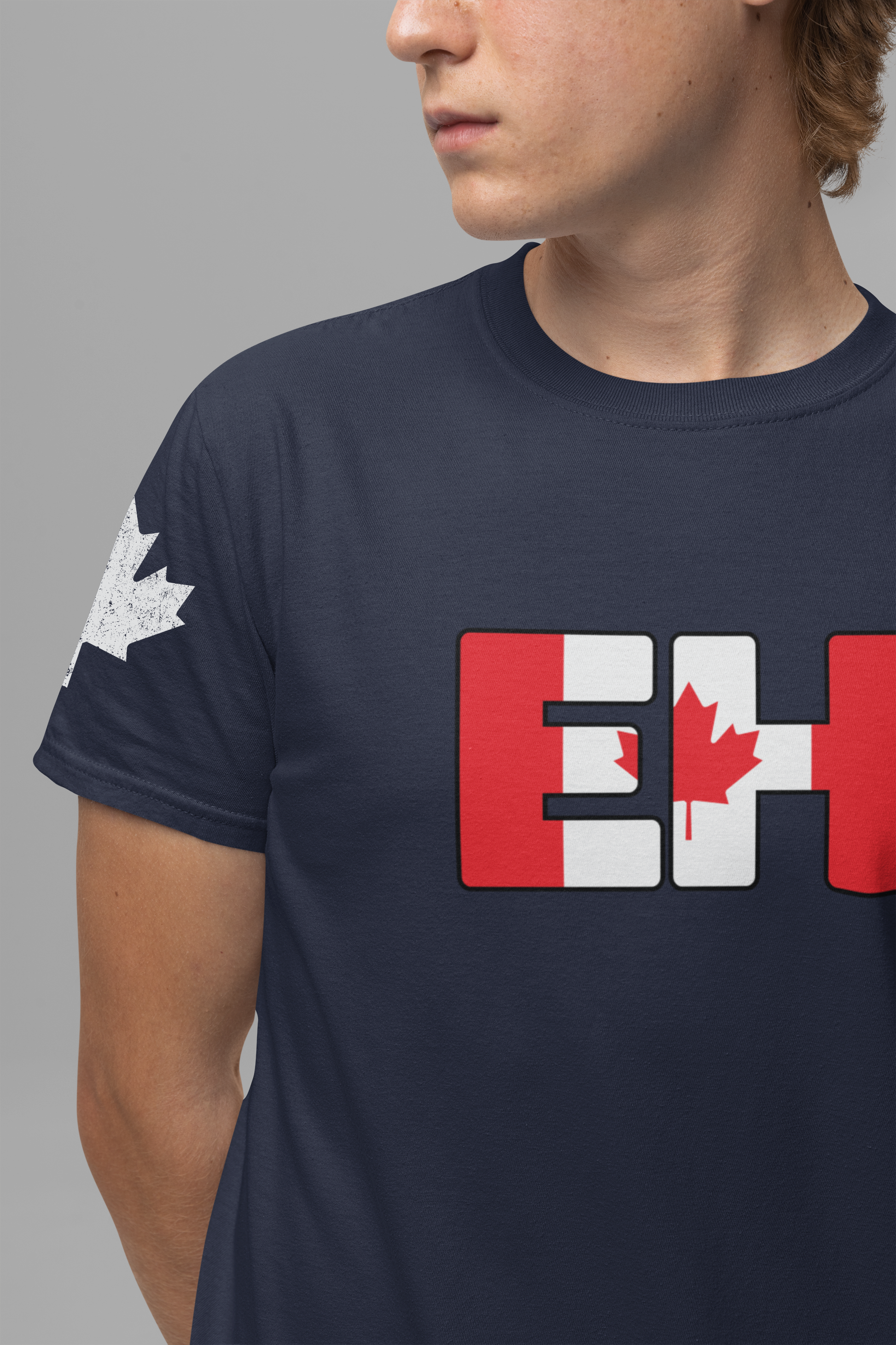 Show your Canadian pride with this bold t-shirt featuring a large embossed "EH" design filled with the Canada flag pattern on the front. Maple leaf graphics decorate both sleeves, adding a touch of patriotic flair. This classic white tee blends iconic Canadian symbolism with casual style, making it perfect for Canada Day, national celebrations, or everyday wear. Soft and comfortable, it’s a statement piece for anyone who loves their Canadian heritage with a playful twist on the famous "Eh" phrase.