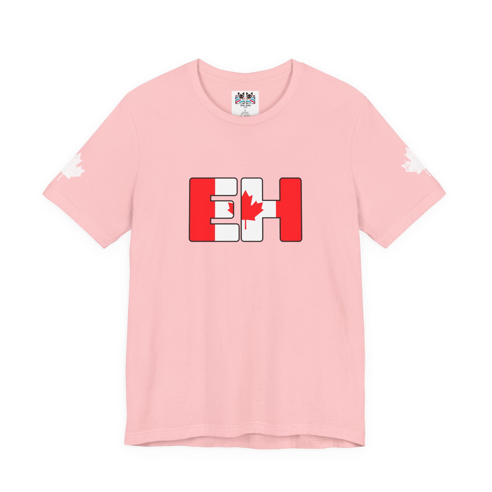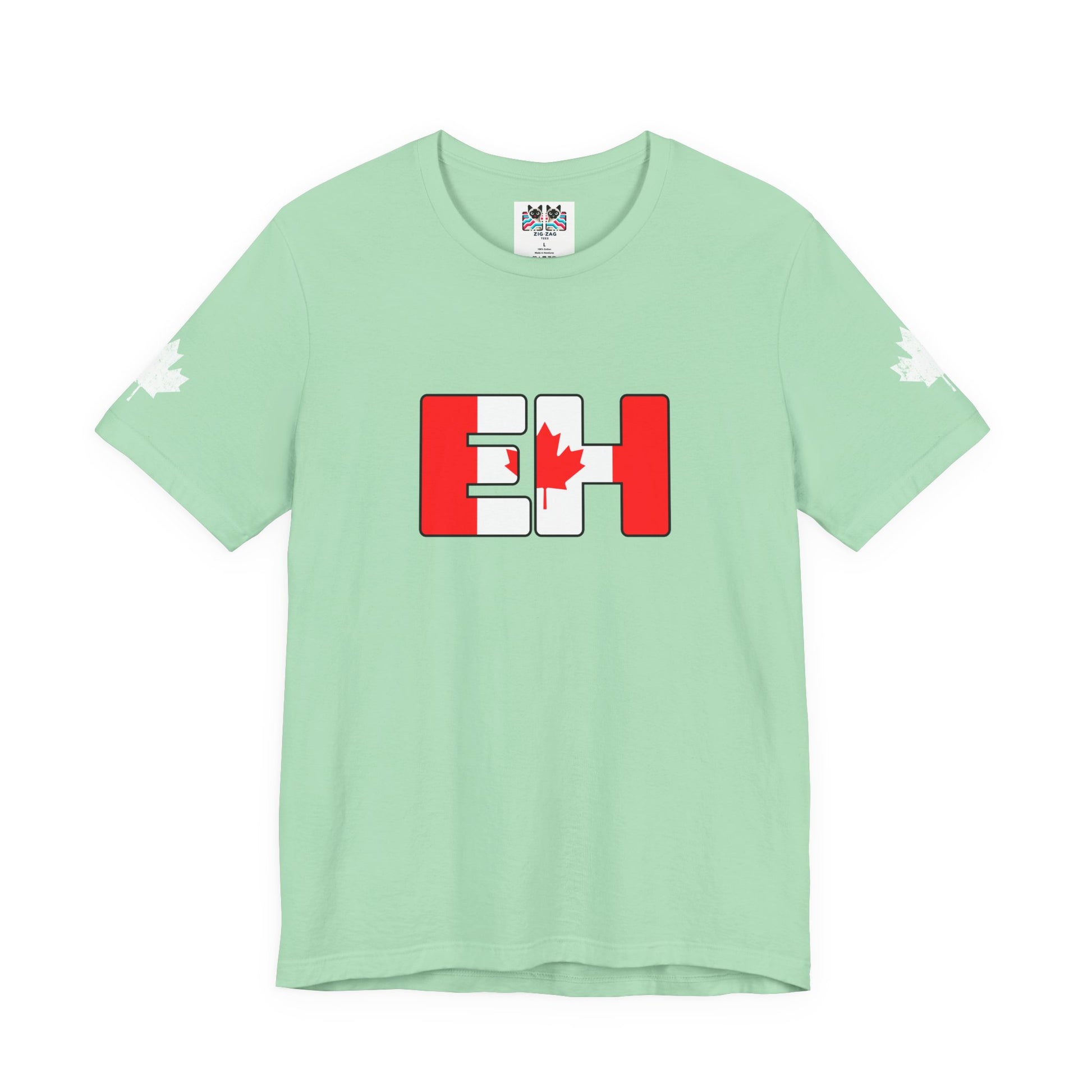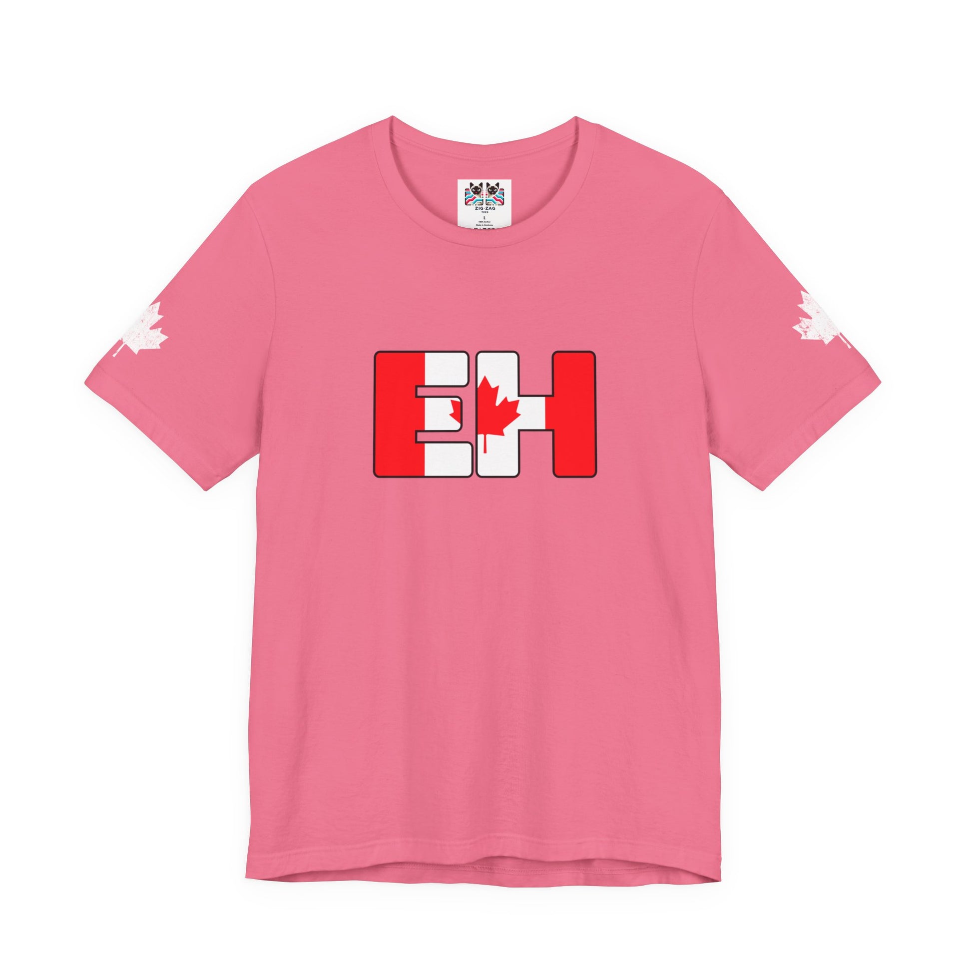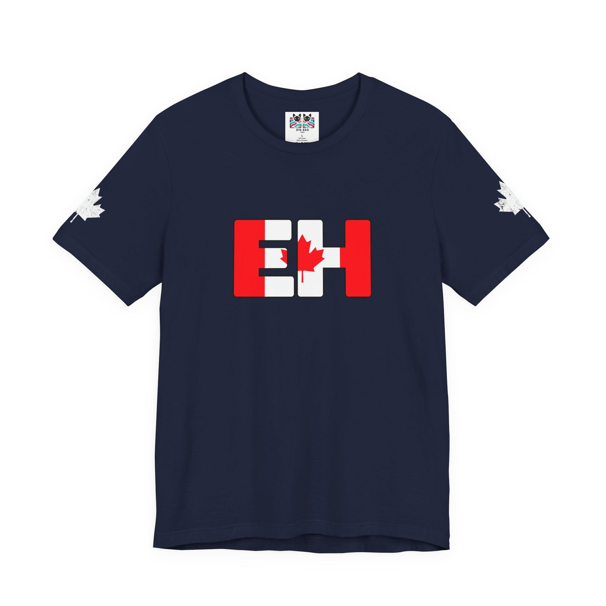Show your Canadian pride with this bold t-shirt featuring a large embossed "EH" design filled with the Canada flag pattern on the front. Maple leaf graphics decorate both sleeves, adding a touch of patriotic flair. This classic white tee blends iconic Canadian symbolism with casual style, making it perfect for Canada Day, national celebrations, or everyday wear. Soft and comfortable, it’s a statement piece for anyone who loves their Canadian heritage with a playful twist on the famous "Eh" phrase.