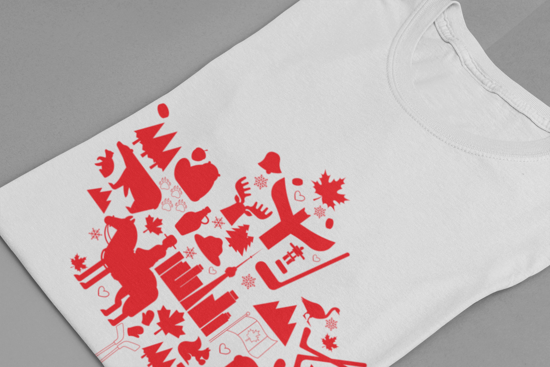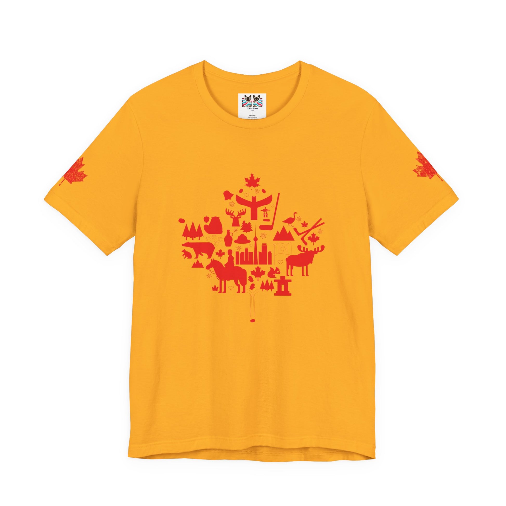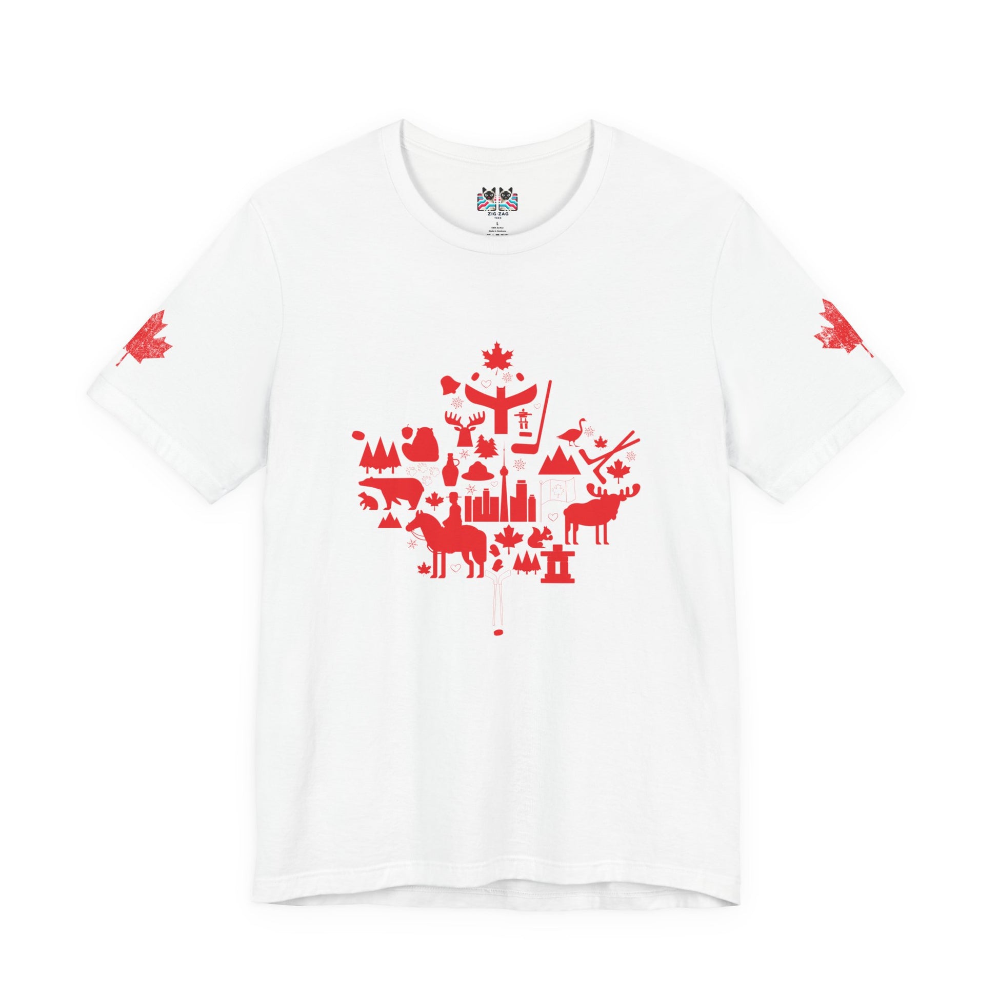Celebrate Canadian culture with this vibrant t-shirt featuring a large maple leaf graphic made from a collage of iconic Canadian symbols in crisp white. From moose and bears to hockey sticks, trees, and city skylines, this design beautifully captures the spirit, nature, and heritage of Canada. Maple leaf accents on both sleeves round out this modern classic, making it a stylish choice for Canada Day, travel, or everyday patriotic wear. Crafted from soft, comfortable fabric, perfect for showcasing national pride.
