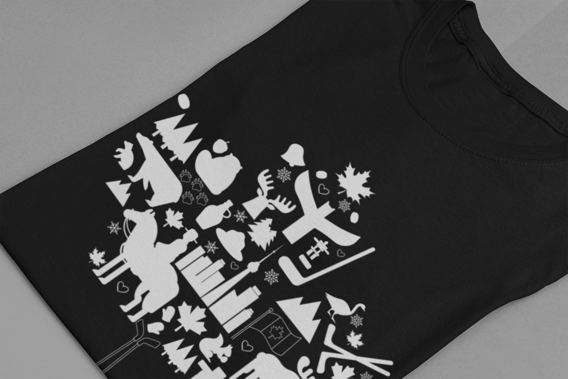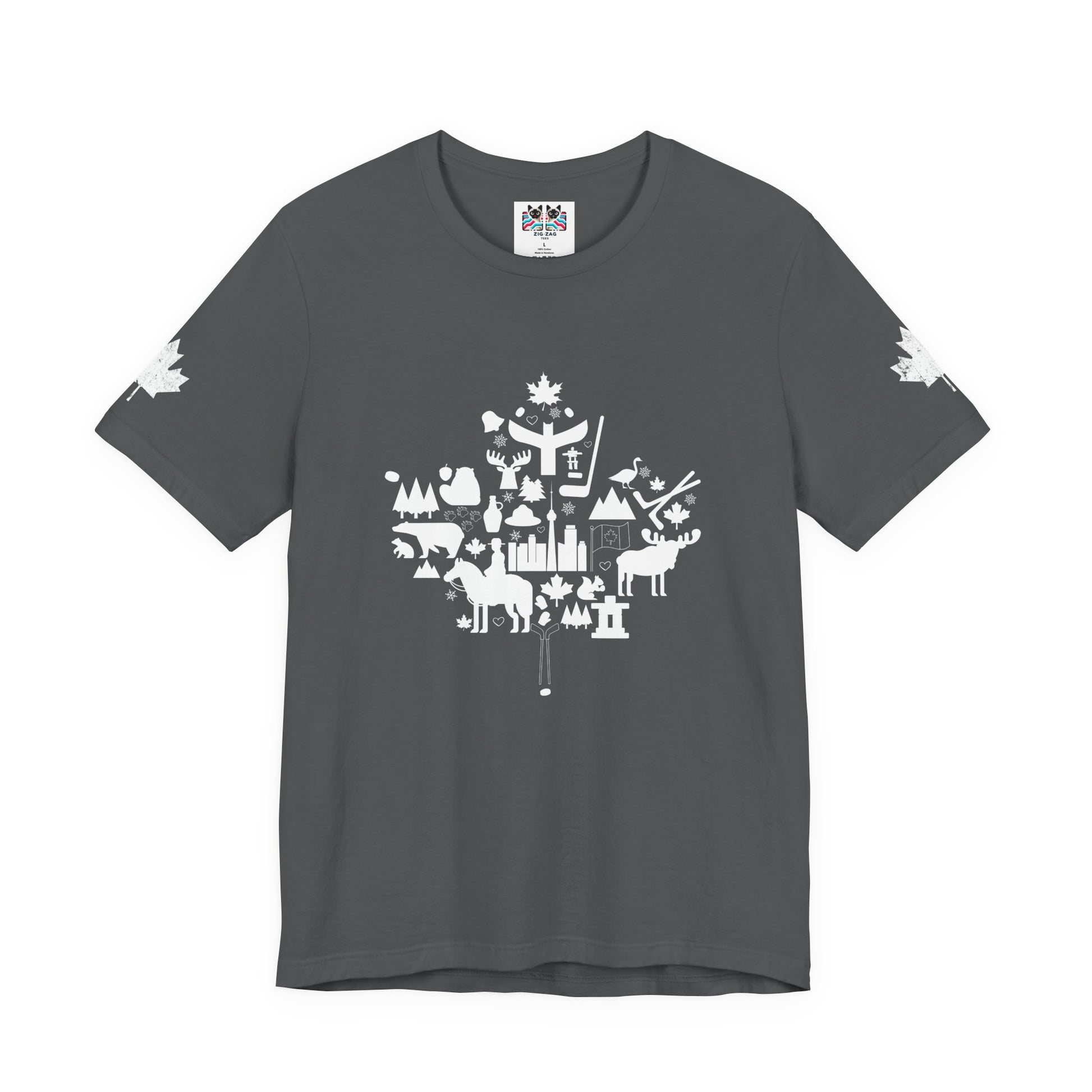 Celebrate Canadian culture with this vibrant t-shirt featuring a large maple leaf graphic made from a collage of iconic Canadian symbols in crisp white. From moose and bears to hockey sticks, trees, and city skylines, this design beautifully captures the spirit, nature, and heritage of Canada. Maple leaf accents on both sleeves round out this modern classic, making it a stylish choice for Canada Day, travel, or everyday patriotic wear. Crafted from soft, comfortable fabric, perfect for showcasing national pride.