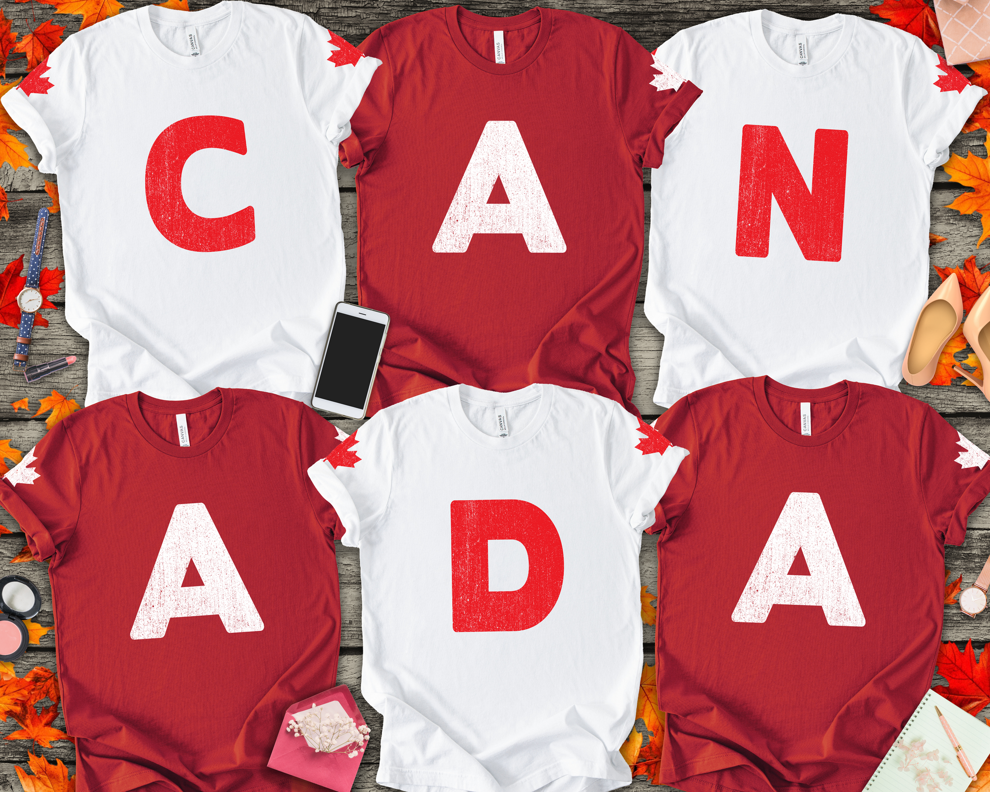 Make a bold and playful statement with the Canada Letters Group T-Shirt Collection, where each shirt in the set features a single large letter from the word "CANADA" in classic bold print. Designed for groups, events, and families, each individual tee together spells out "CANADA" when worn side by side. All shirts sport maple leaf sleeve accents, enhancing the patriotic flair and unity of the set. Perfect for Canada Day celebrations, team events, group photos, or as a creative gift idea for Canadian pride. Made from soft, comfortable fabric for maximum group comfort and impact.