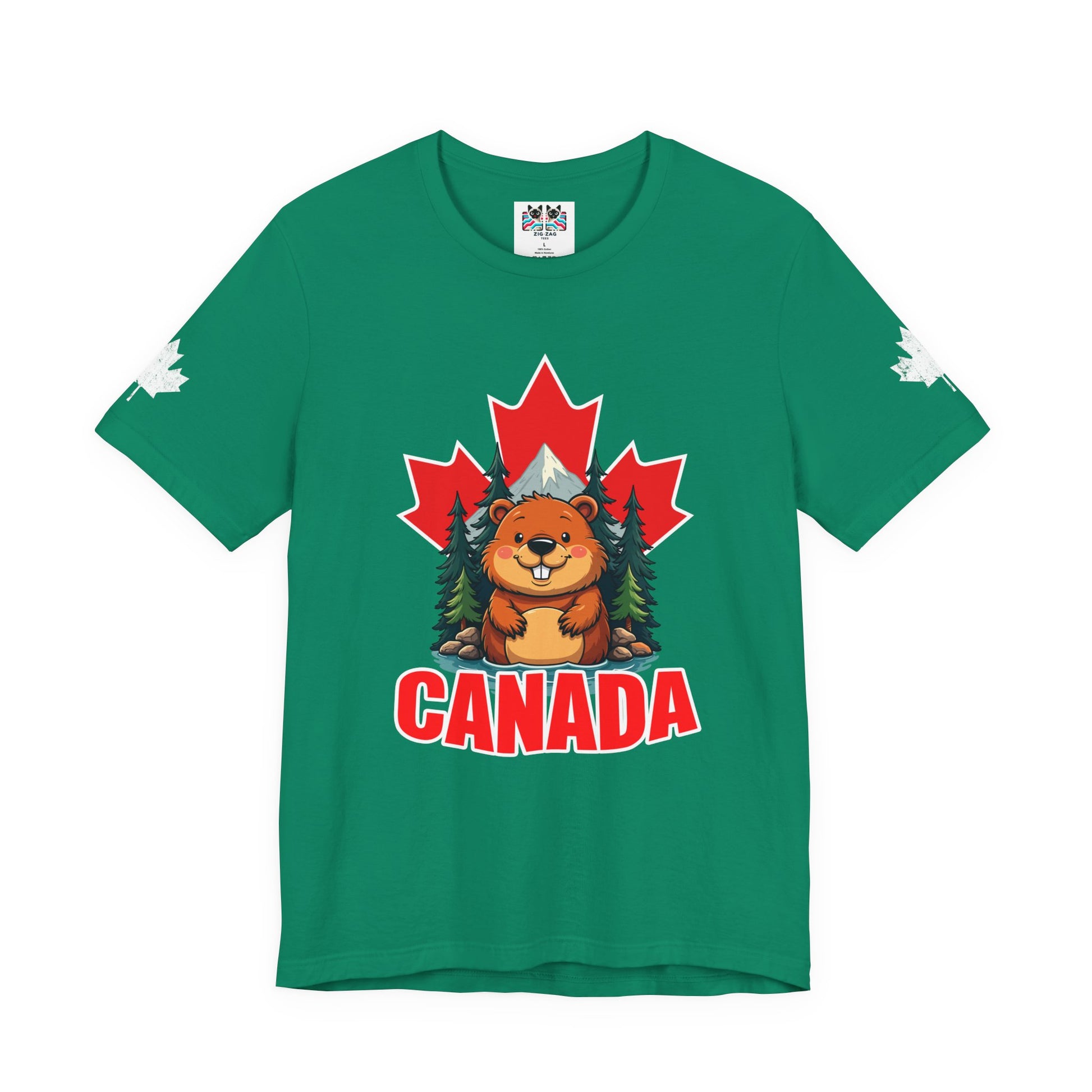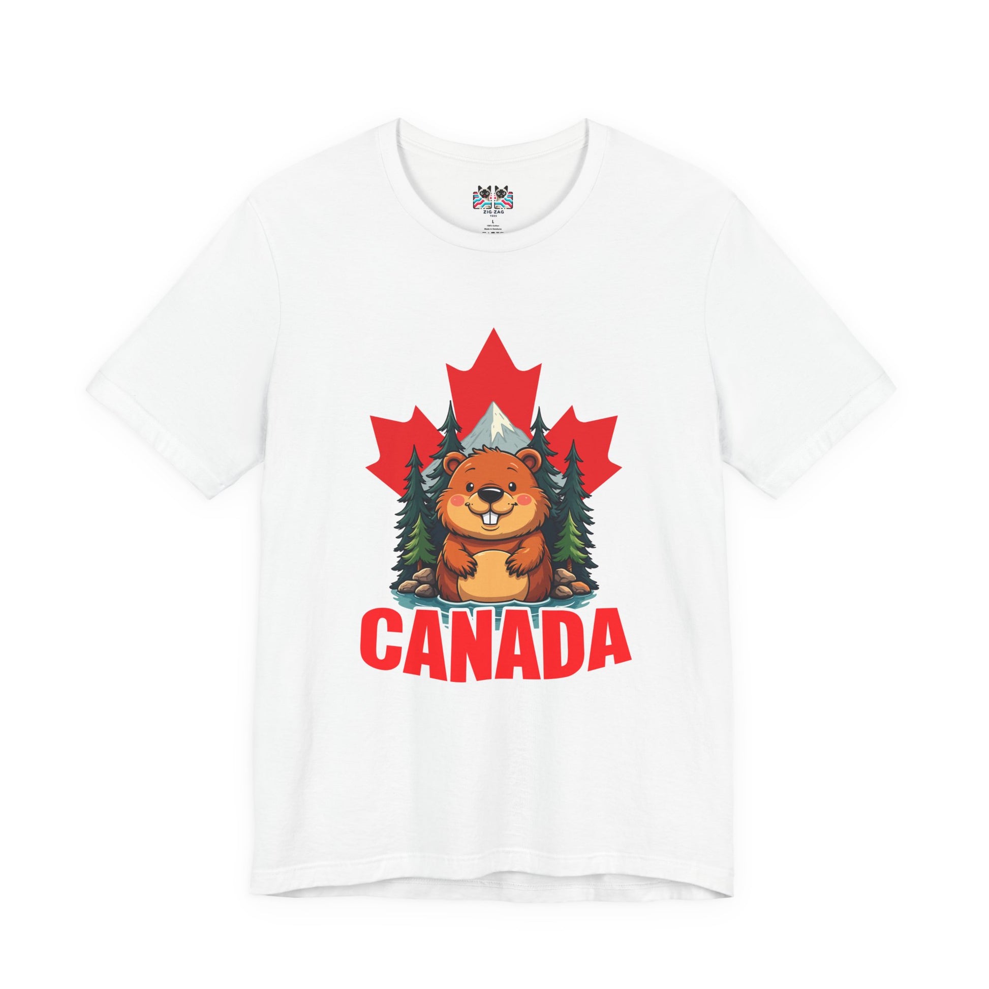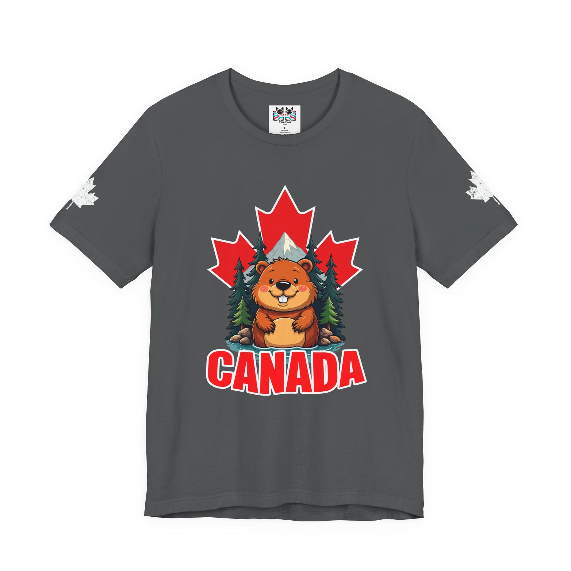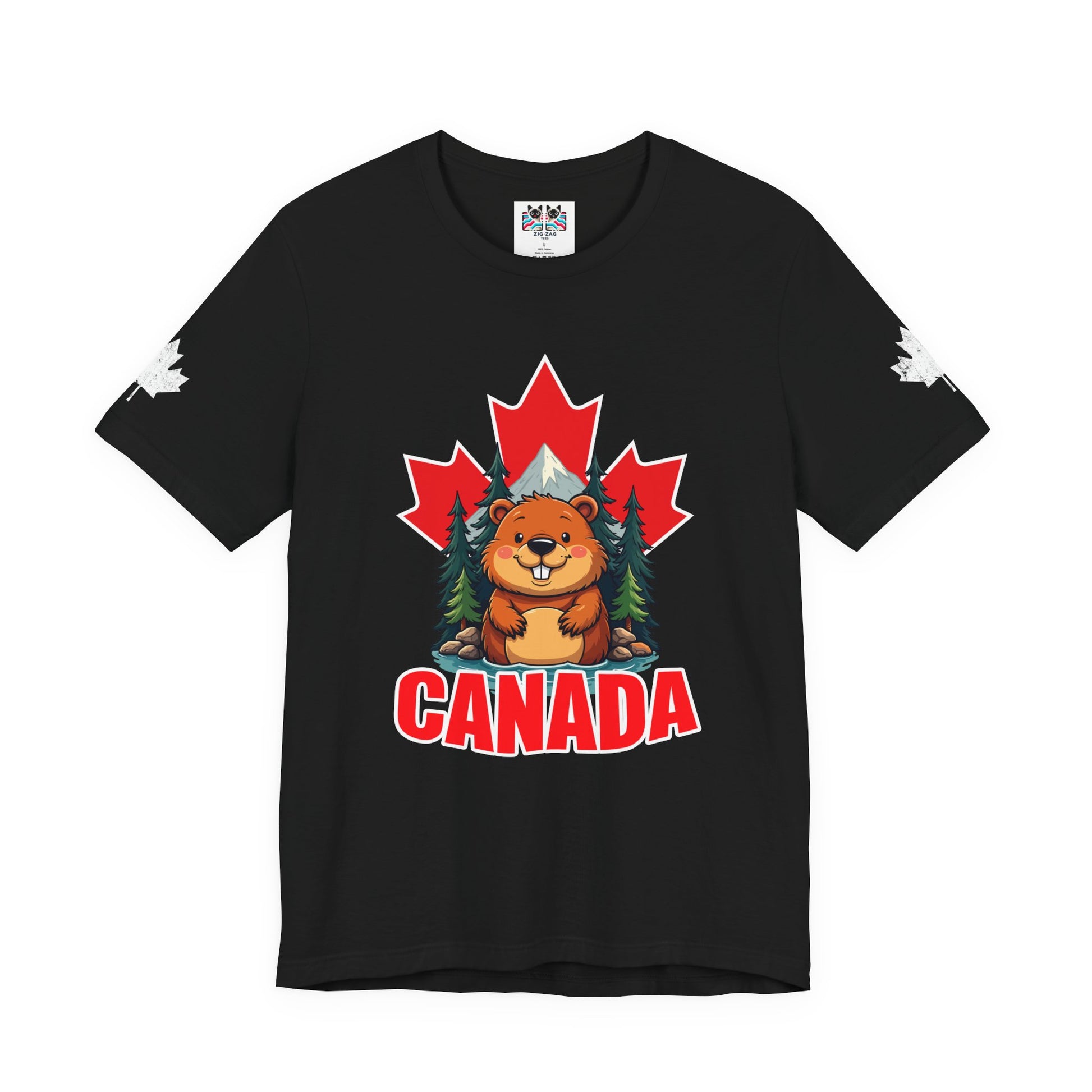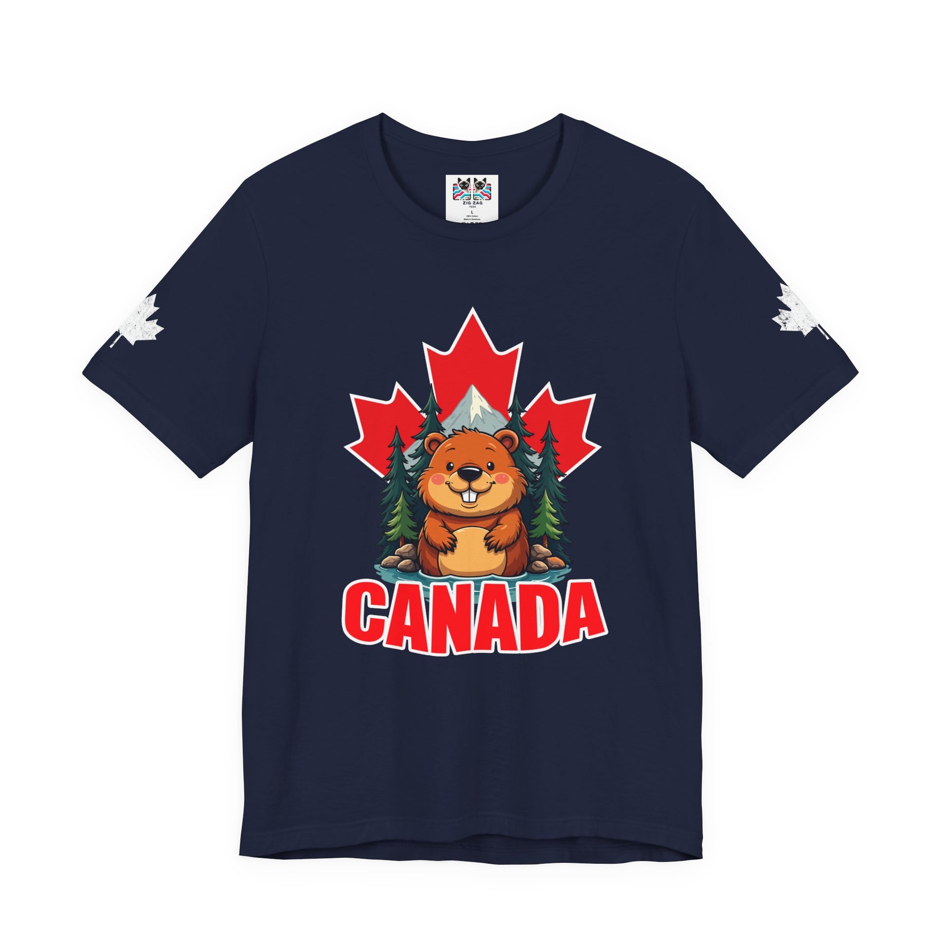 Show your Canadian pride with this playful t-shirt featuring a cute cartoon beaver set against a red maple leaf, paired with bold "CANADA" text. The fun illustration captures the charm of Canadian wildlife and landscape, making it a perfect pick for children and adults alike. With white maple leaf accents on both sleeves, this soft cotton tee is ideal for Canada Day, casual outings, or as a cheerful gift for animal lovers and proud Canadians.