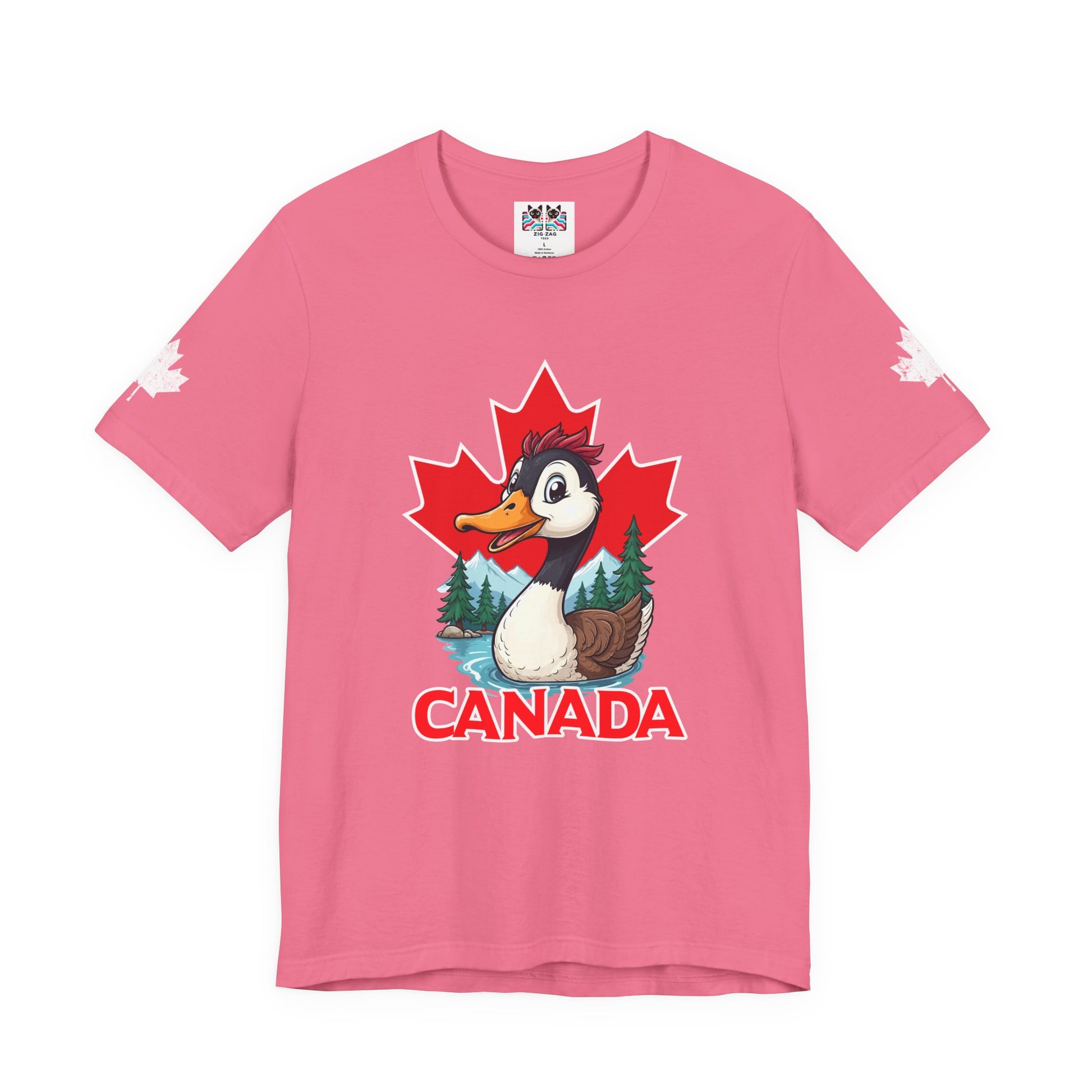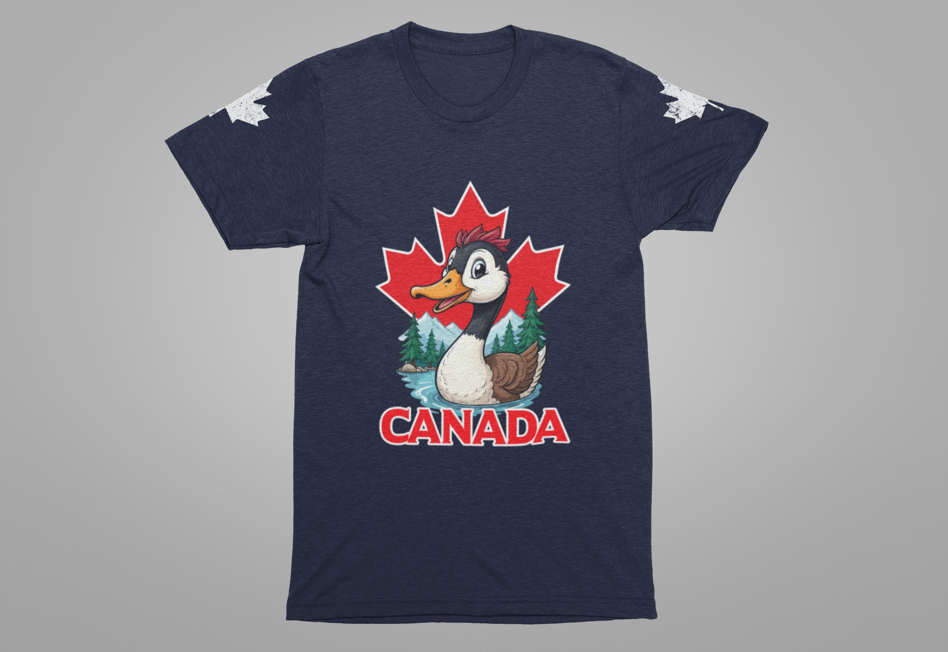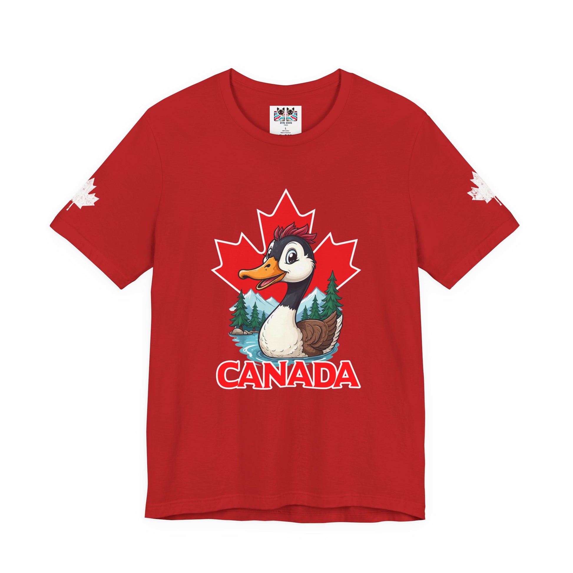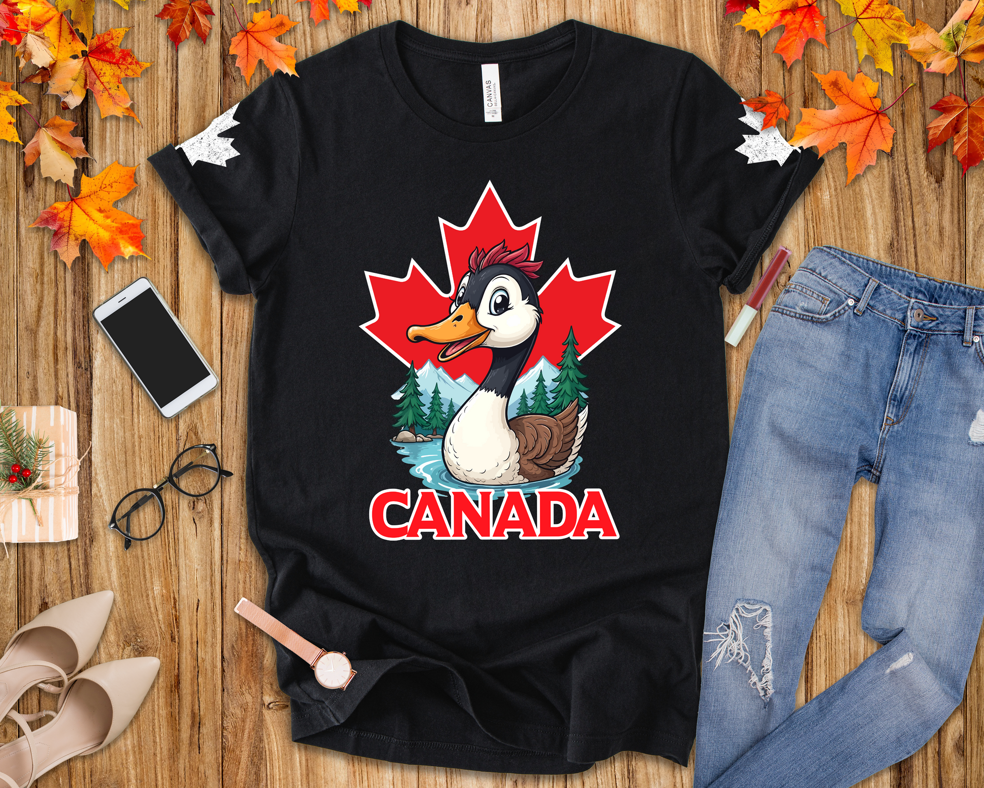 Show your Canadian pride with this playful t-shirt featuring a cute cartoon duck set against a red maple leaf, paired with bold "CANADA" text. The fun illustration captures the charm of Canadian wildlife and landscape, making it a perfect pick for children and adults alike. With white maple leaf accents on both sleeves, this soft cotton tee is ideal for Canada Day, casual outings, or as a cheerful gift for animal lovers and proud Canadians.