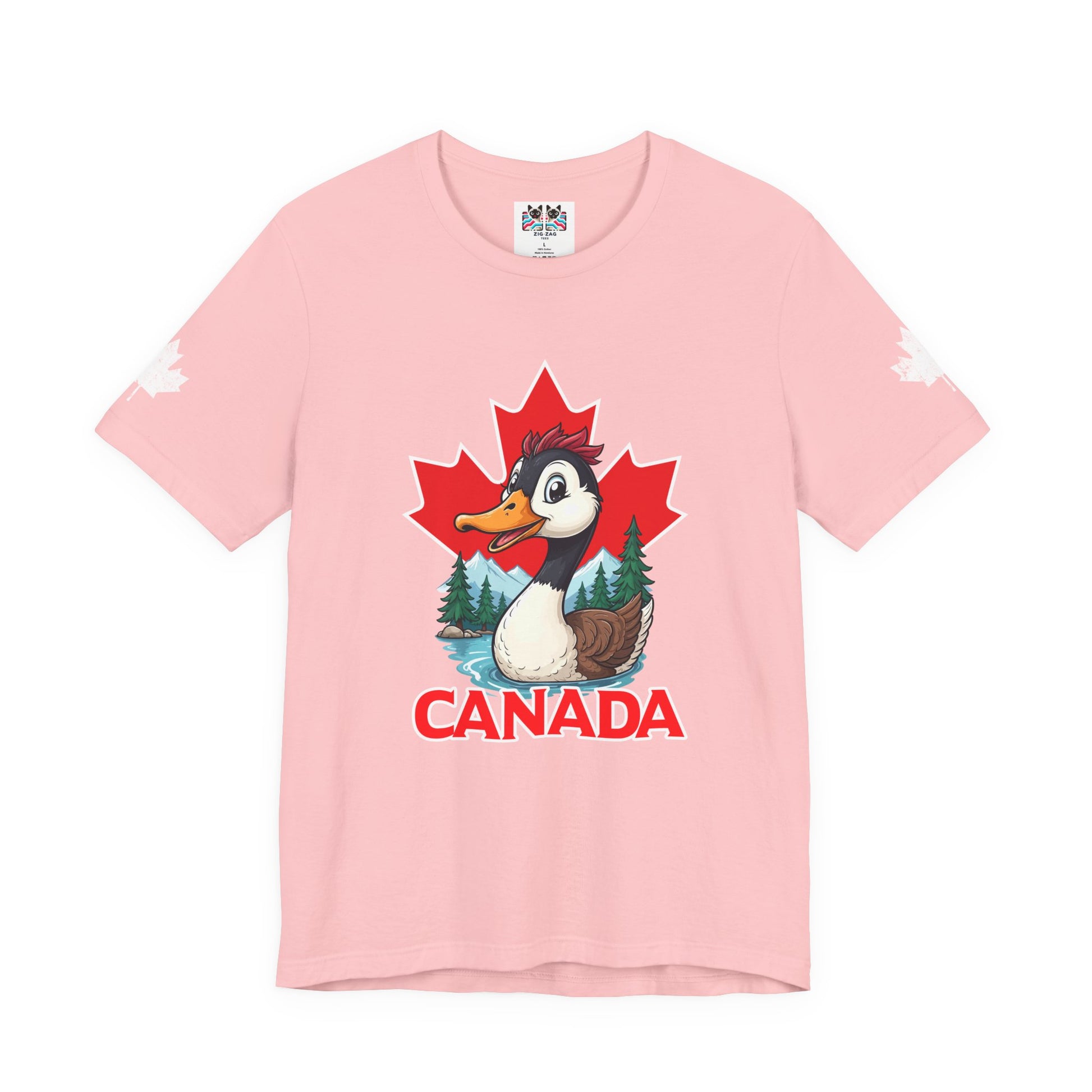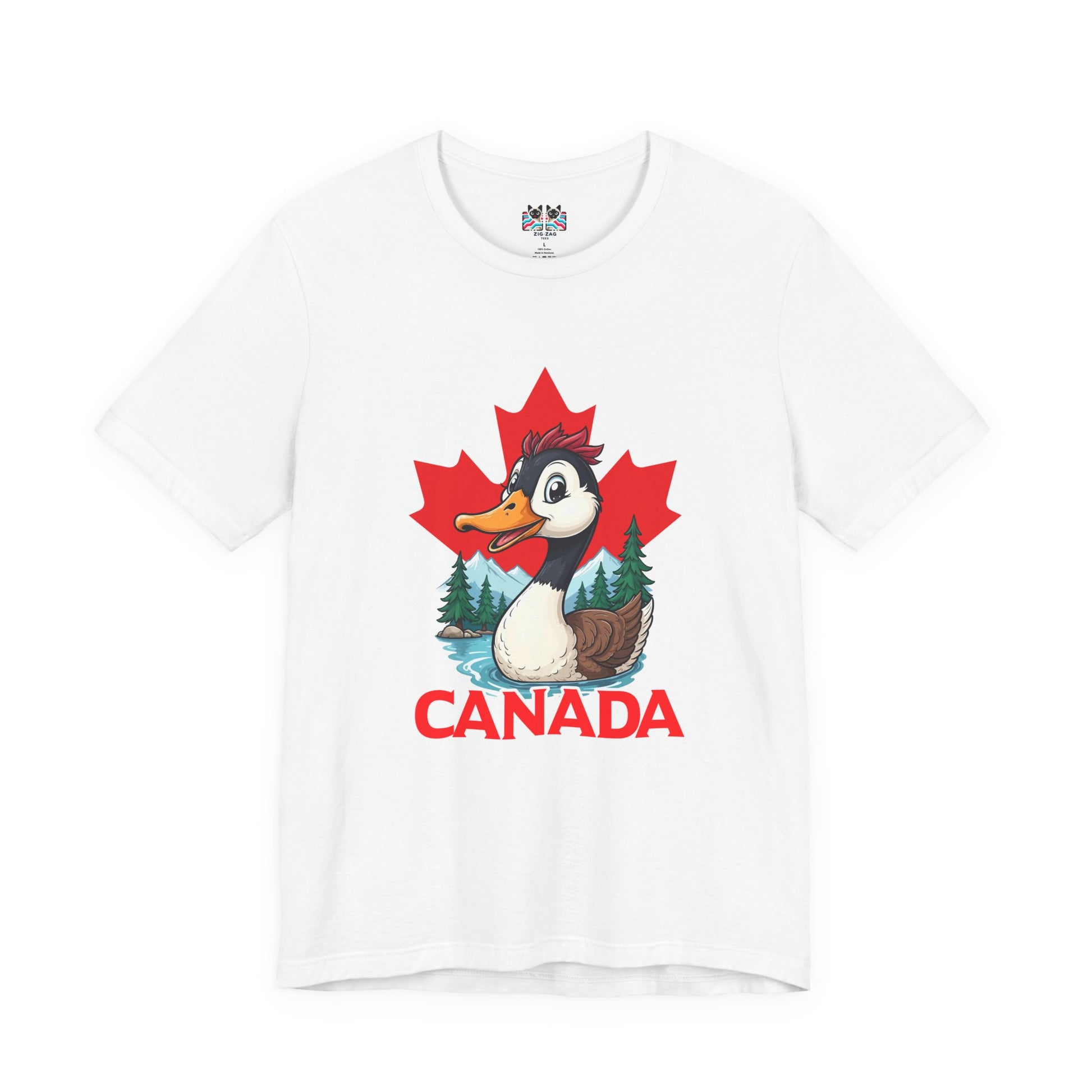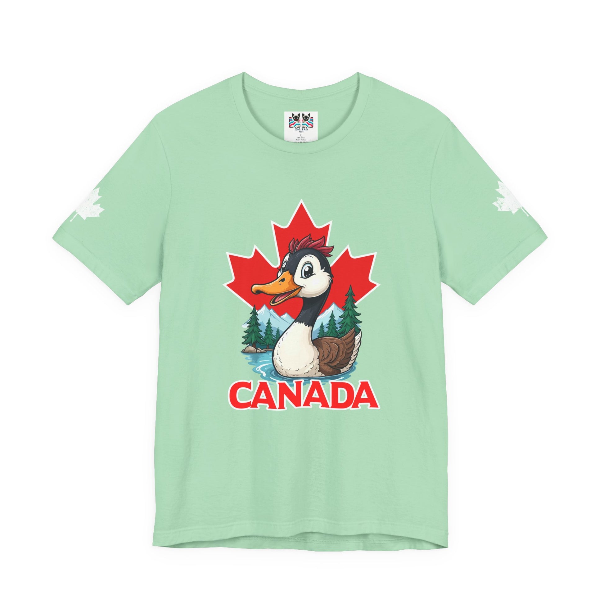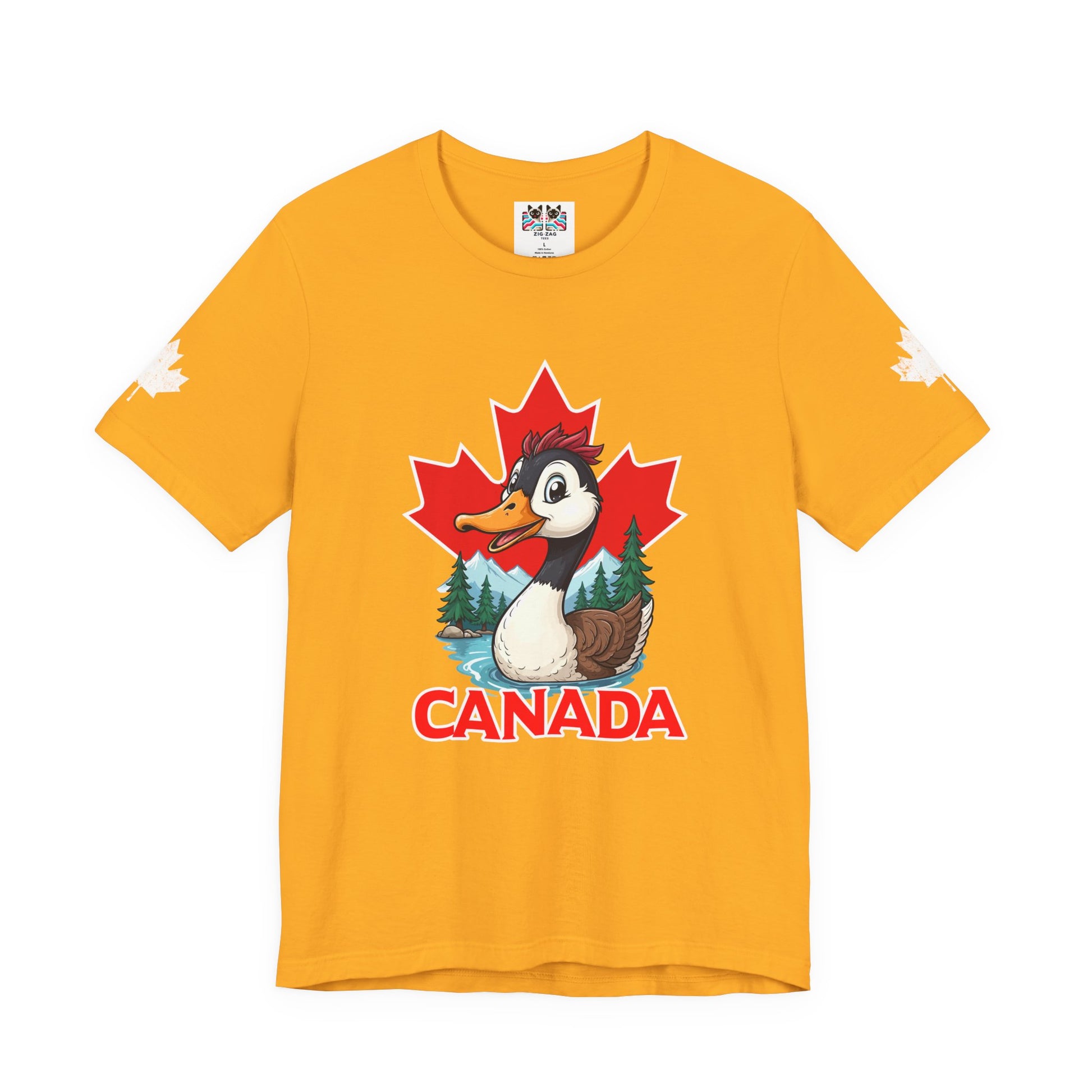 Show your Canadian pride with this playful t-shirt featuring a cute cartoon duck set against a red maple leaf, paired with bold "CANADA" text. The fun illustration captures the charm of Canadian wildlife and landscape, making it a perfect pick for children and adults alike. With white maple leaf accents on both sleeves, this soft cotton tee is ideal for Canada Day, casual outings, or as a cheerful gift for animal lovers and proud Canadians.
