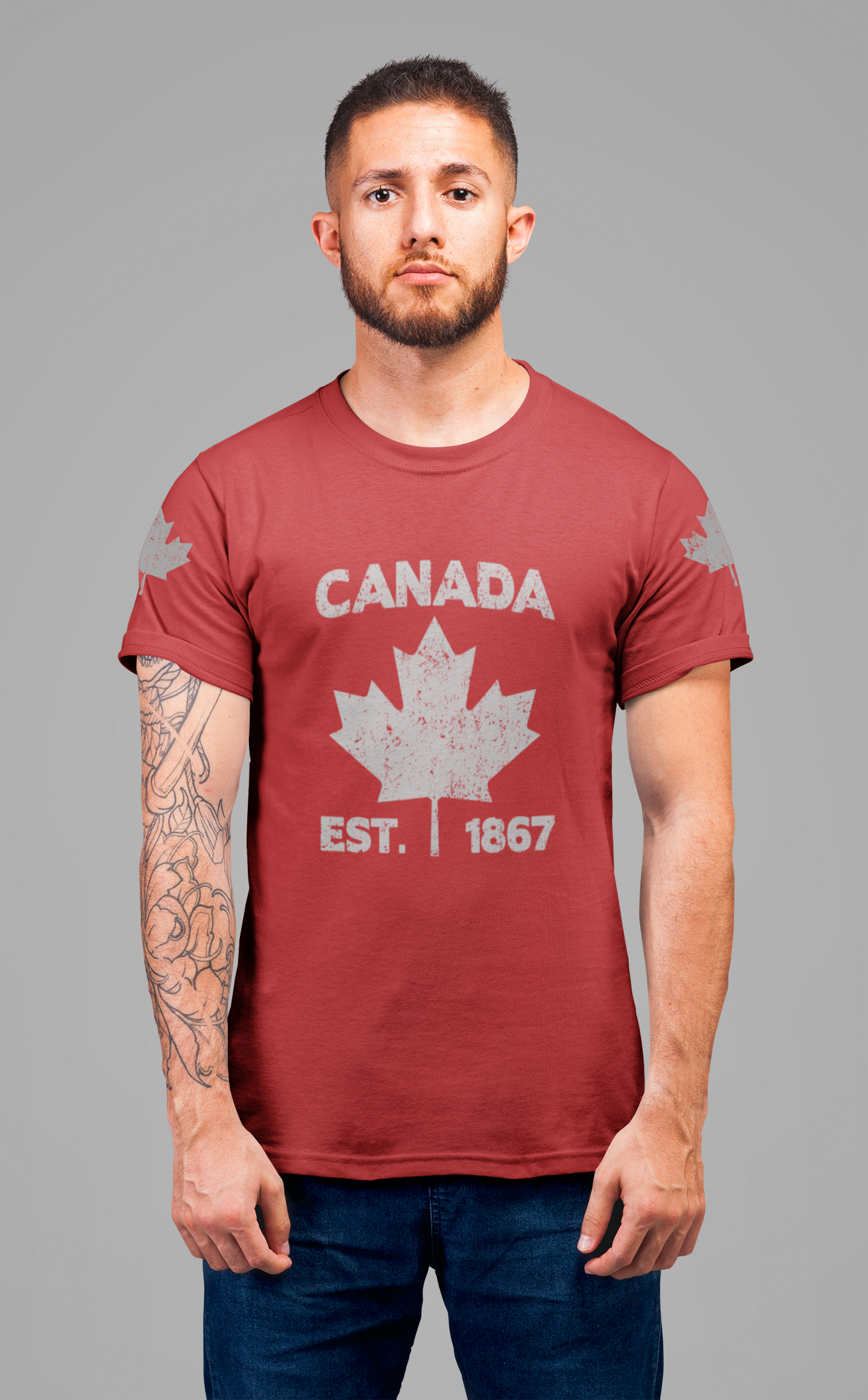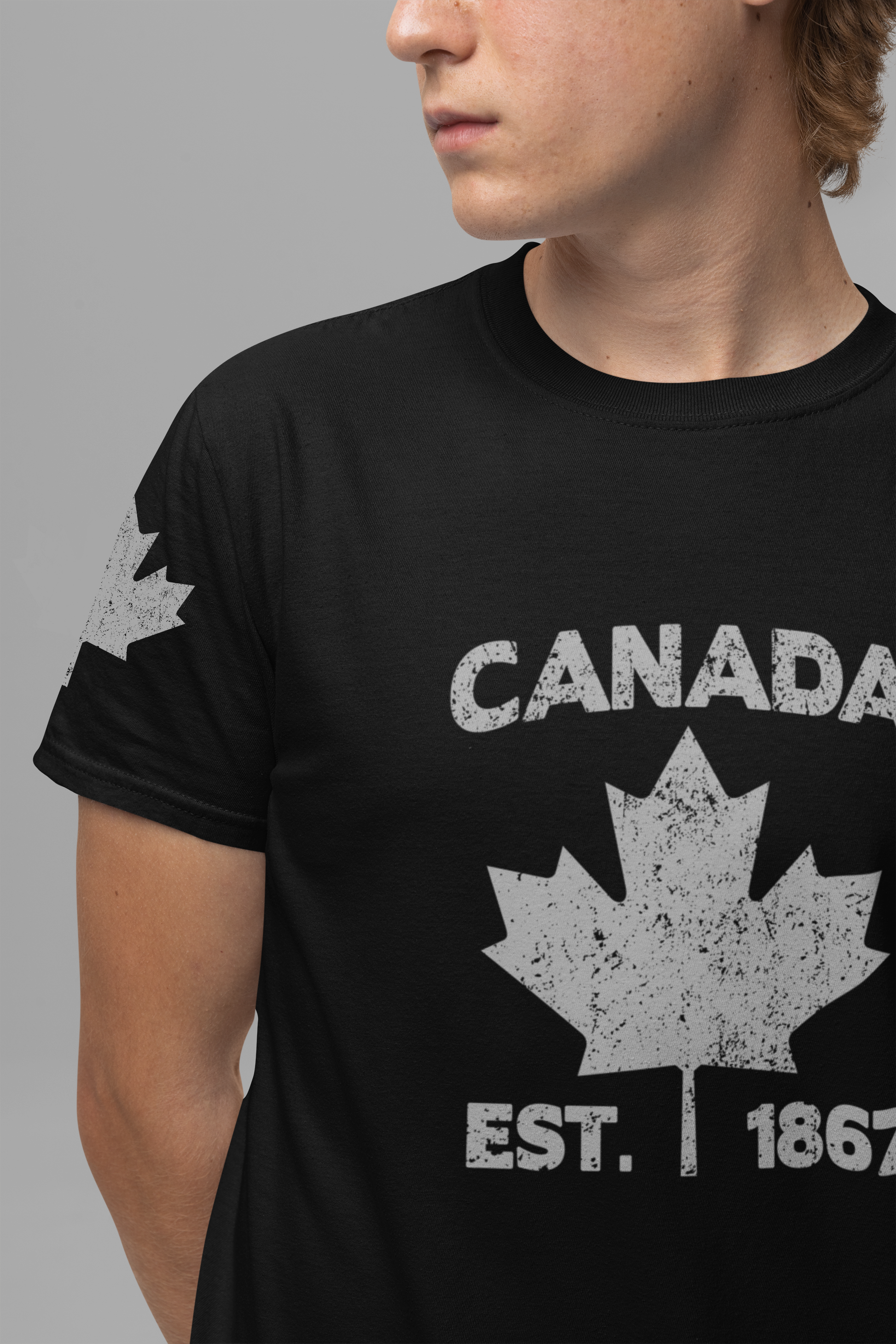 Celebrate Canadian pride and heritage with this classic t-shirt featuring a bold distressed maple leaf graphic in the center. The text "CANADA" arches above the leaf, with "EST. 1867" below, commemorating the year of confederation. Additional maple leaf accents on the sleeves enhance the iconic national theme and vintage look, making it perfect for Canada Day, casual outings, or showing patriotism year-round. Crafted from soft, breathable fabric for lasting comfort and style.
