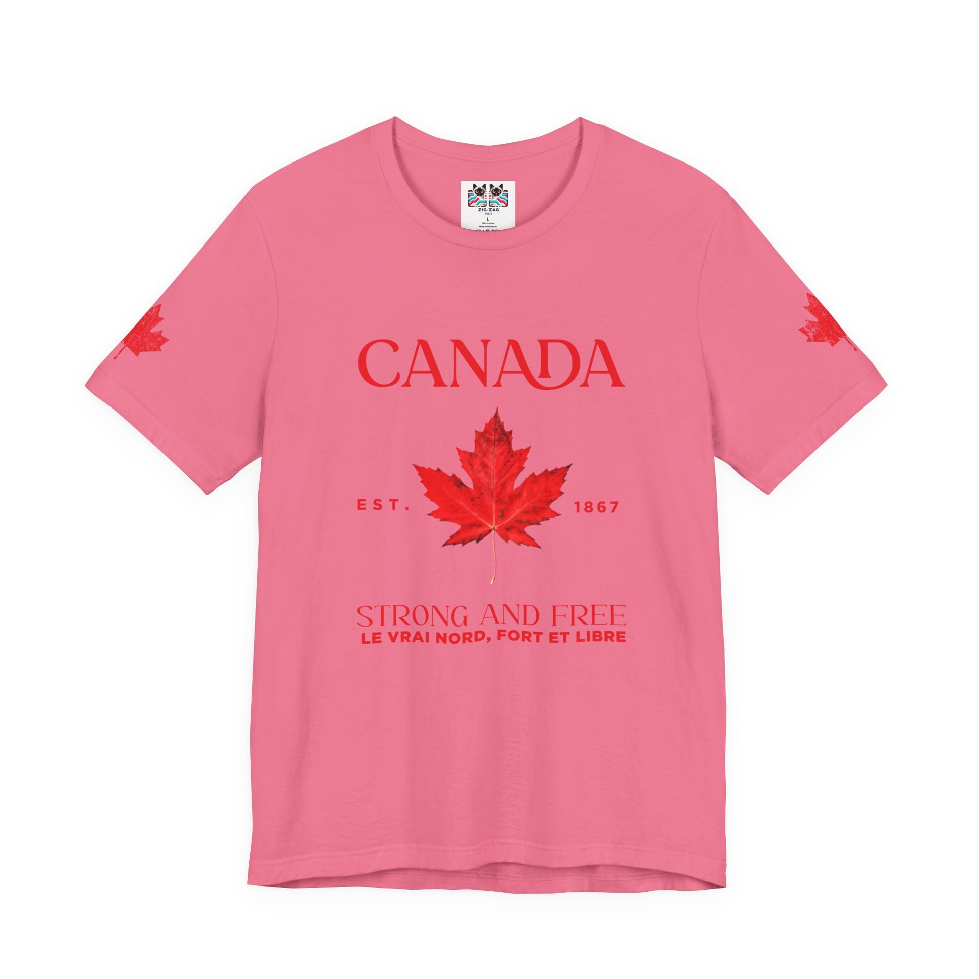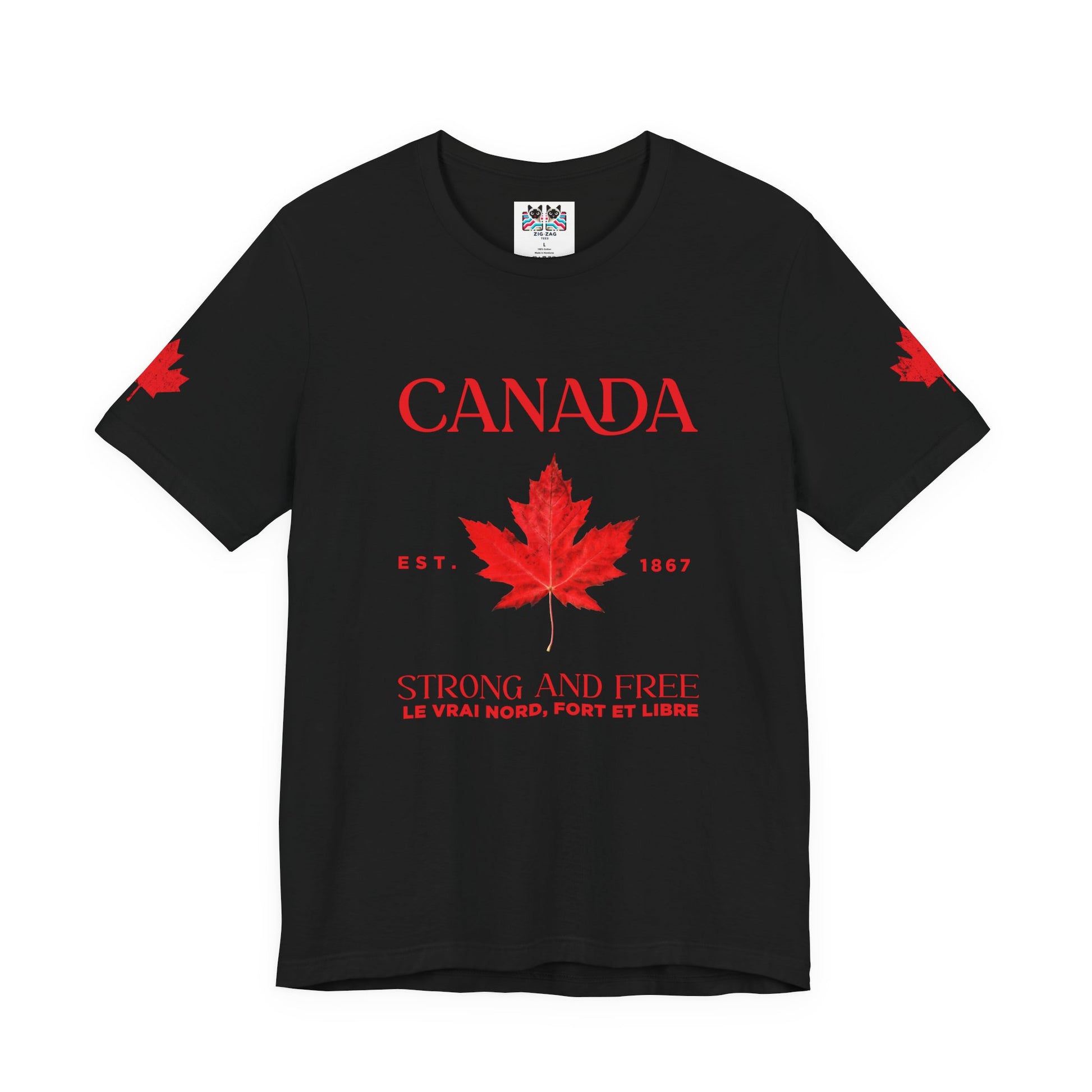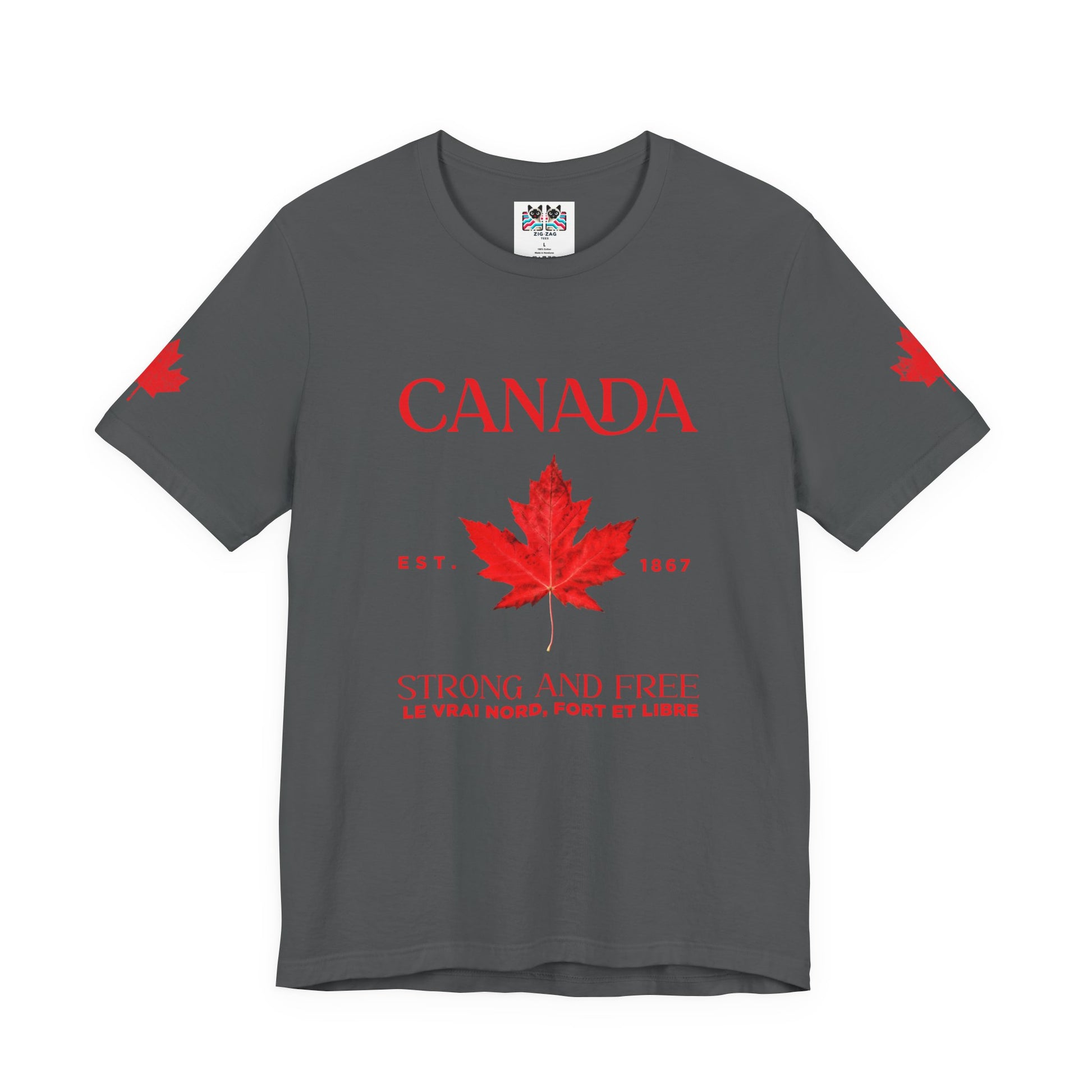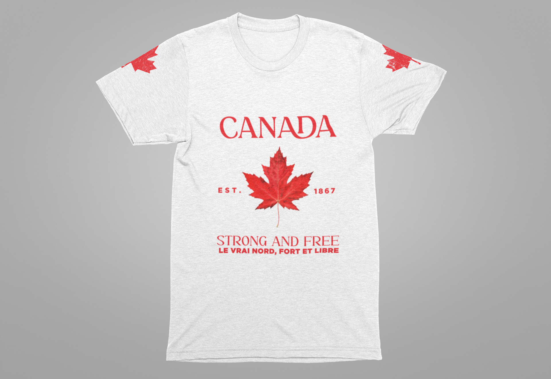 Show your pride with this iconic t-shirt featuring a bold maple leaf in the center, “CANADA” in large text above, and a trio of empowering slogans below: “Strong and Free, Le Vrai Nord, Fort Et Libre, EST. 1867.” The design combines patriotic flair with classic heritage, making it perfect for national holidays, special occasions, or everyday wear. Maple leaves on both sleeves add a final touch of Canadian spirit. This soft, comfortable tee is ideal for anyone who wants to celebrate the true north’s legacy and strength.