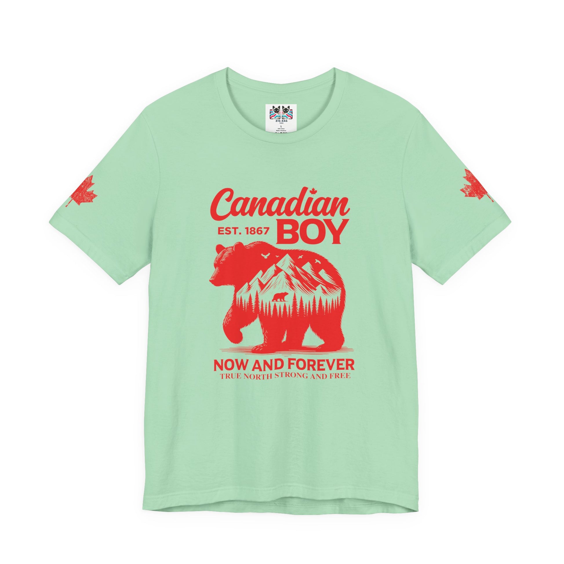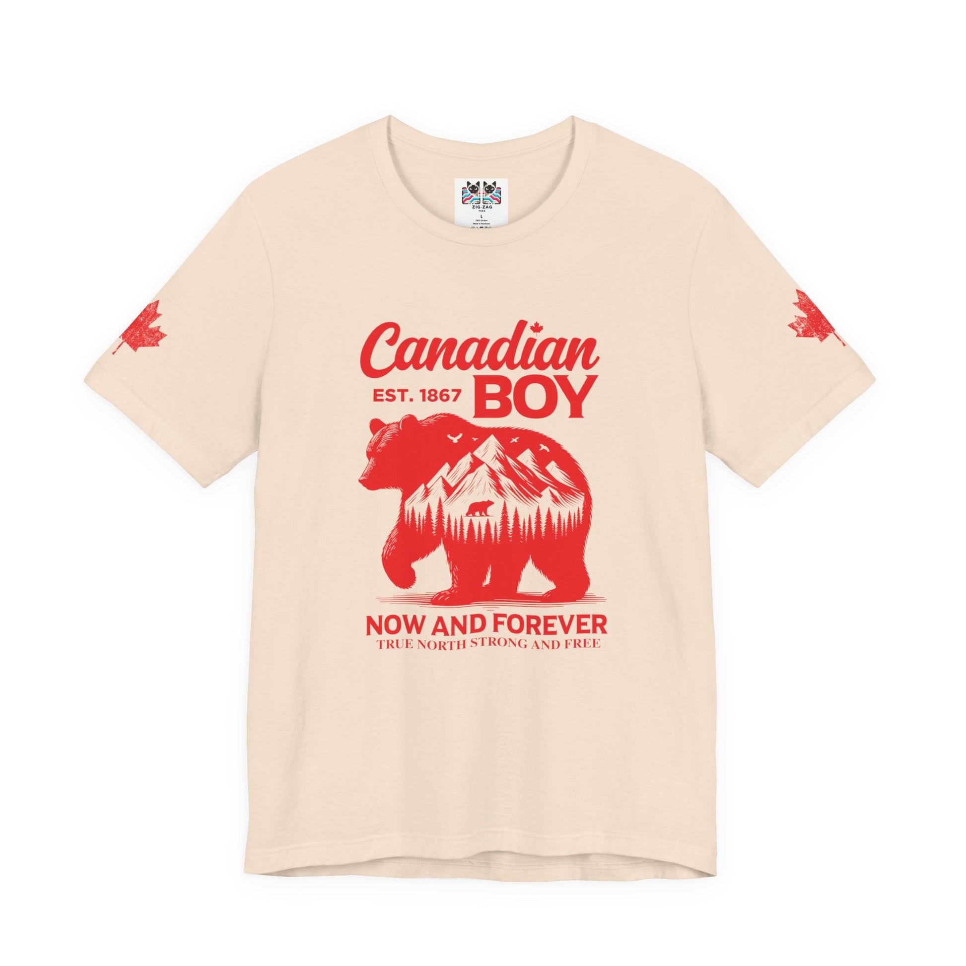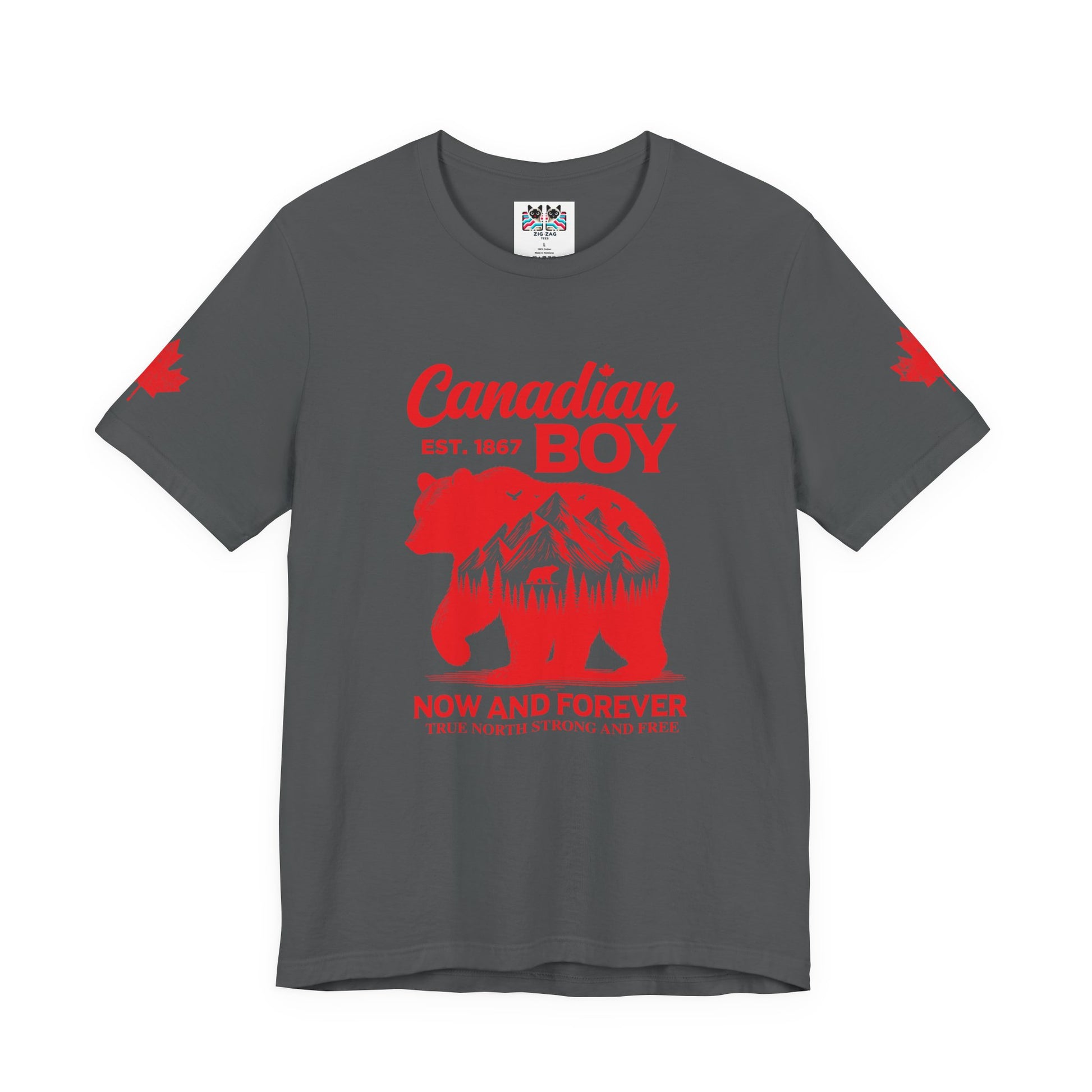 Celebrate Canadian pride with this captivating t-shirt featuring a large bear walking with mountains and forests beautifully embossed on its body. Within the bear graphic, you can also spot detailed wildlife and a smaller bear walking, adding depth to the nature-inspired design. The bold text “Canadian Boy est. 1867” at the top and “Now and Forever, True North Strong and Free” at the bottom emphasize the deep connection to Canadian wilderness and heritage. Crafted for comfort and style, this tee is perfect for nature enthusiasts and proud Canadians alike.