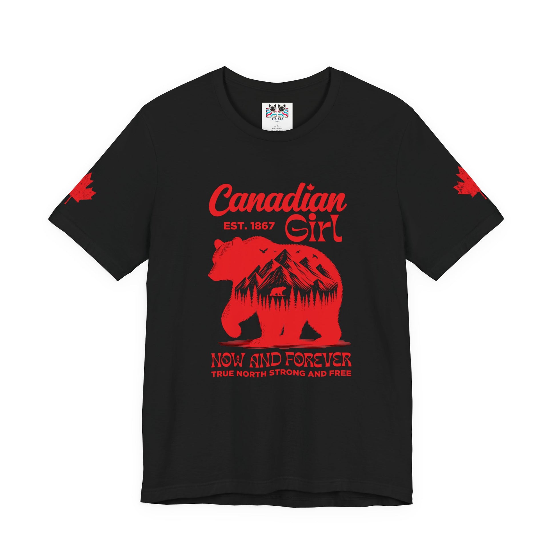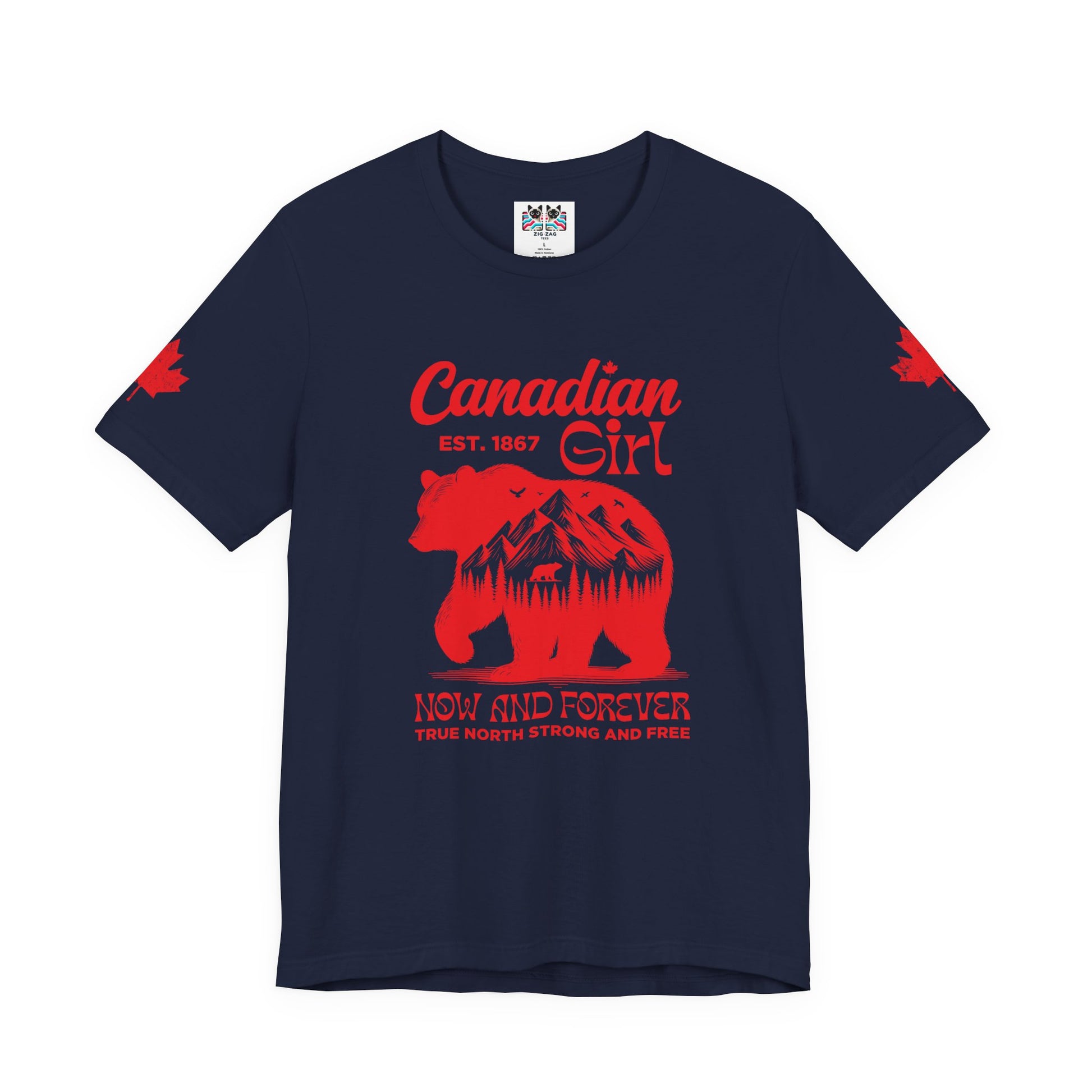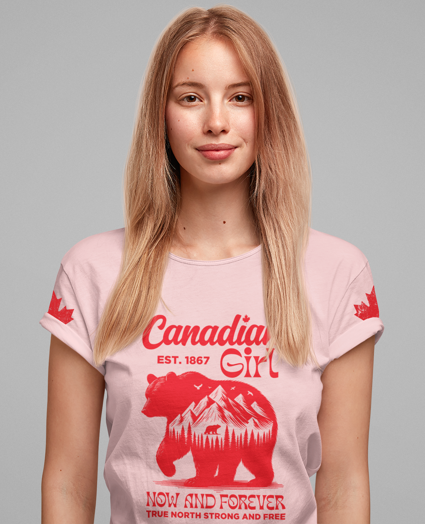 Celebrate the spirit of Canadian wilderness with this stunning t-shirt featuring a large bear walking, embossed with intricate graphics of mountains, forests, and abundant wildlife. Inside the bear’s silhouette, you can see another bear walking amid the wilderness, creating a powerful double-layered nature scene. The top proudly displays "Canadian Girl est. 1867" while the bottom reads "Now and Forever, True North Strong and Free," emphasizing enduring pride and connection to Canada’s great outdoors. Crafted for comfort and style, this tee is perfect for nature lovers and patriotic hearts alike.