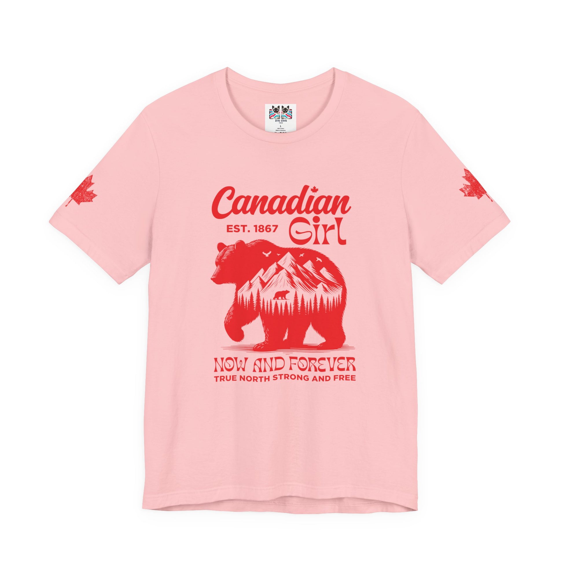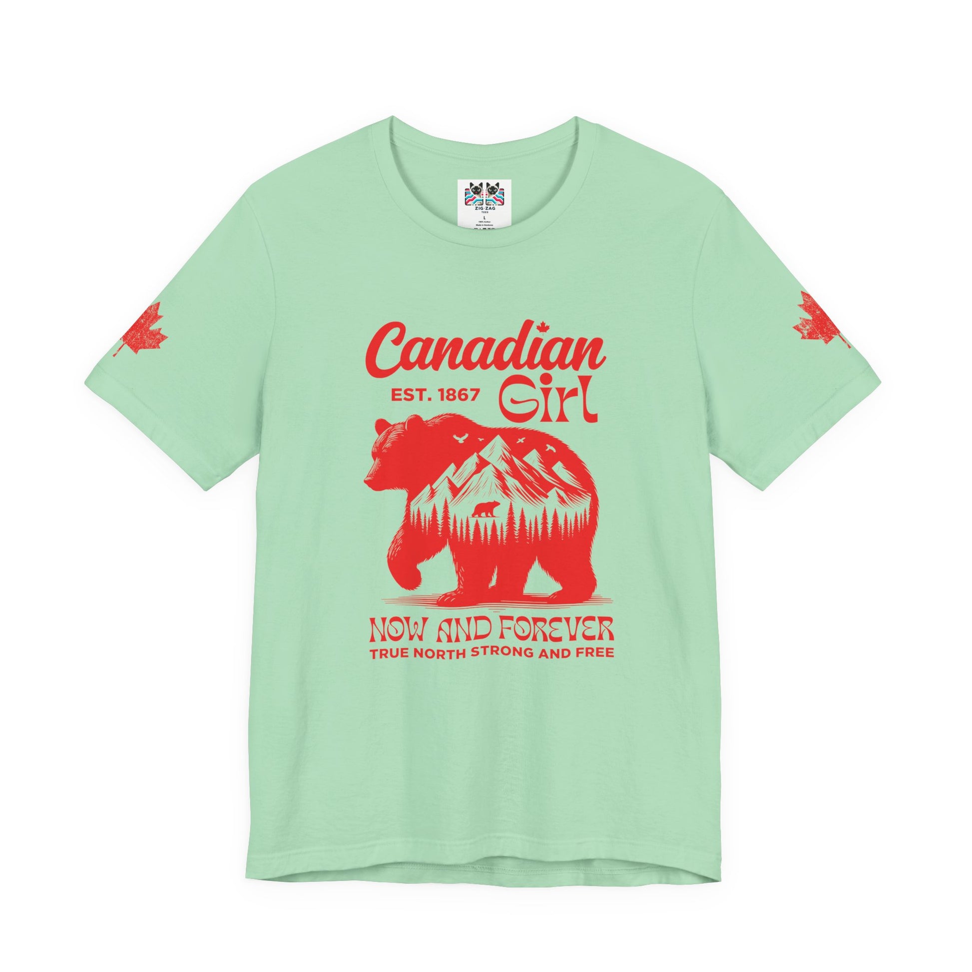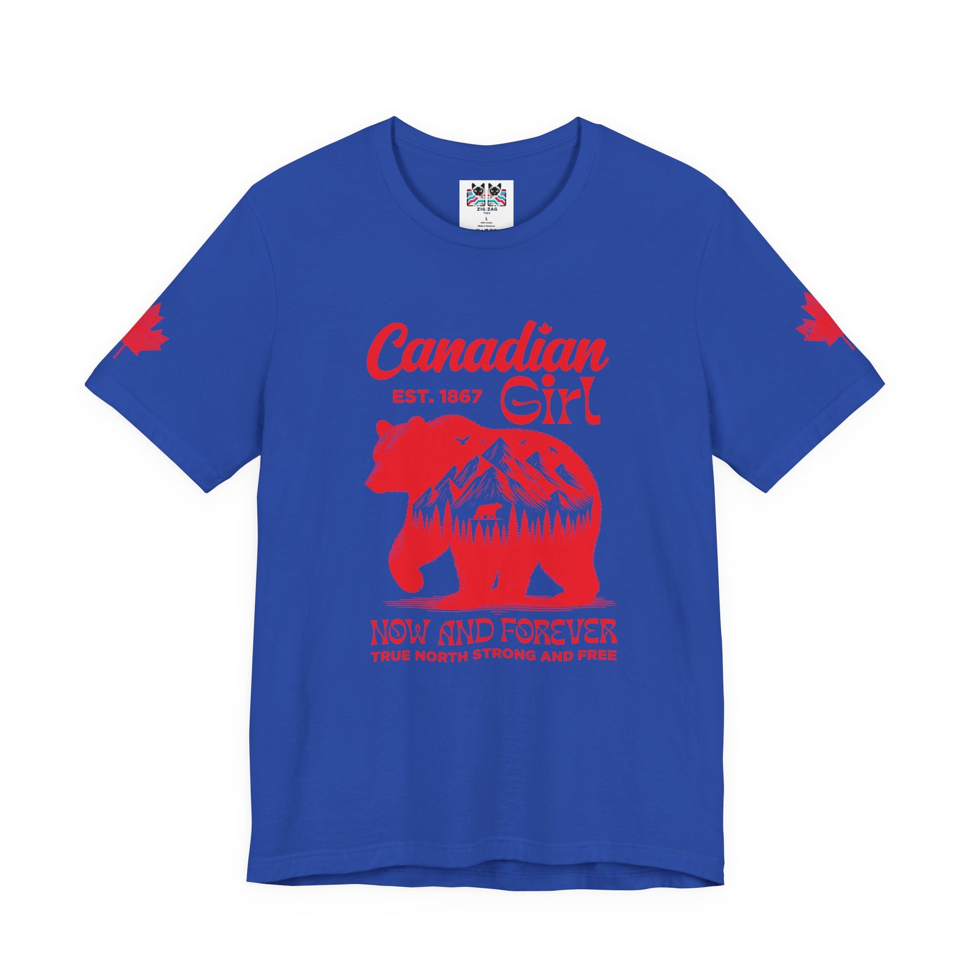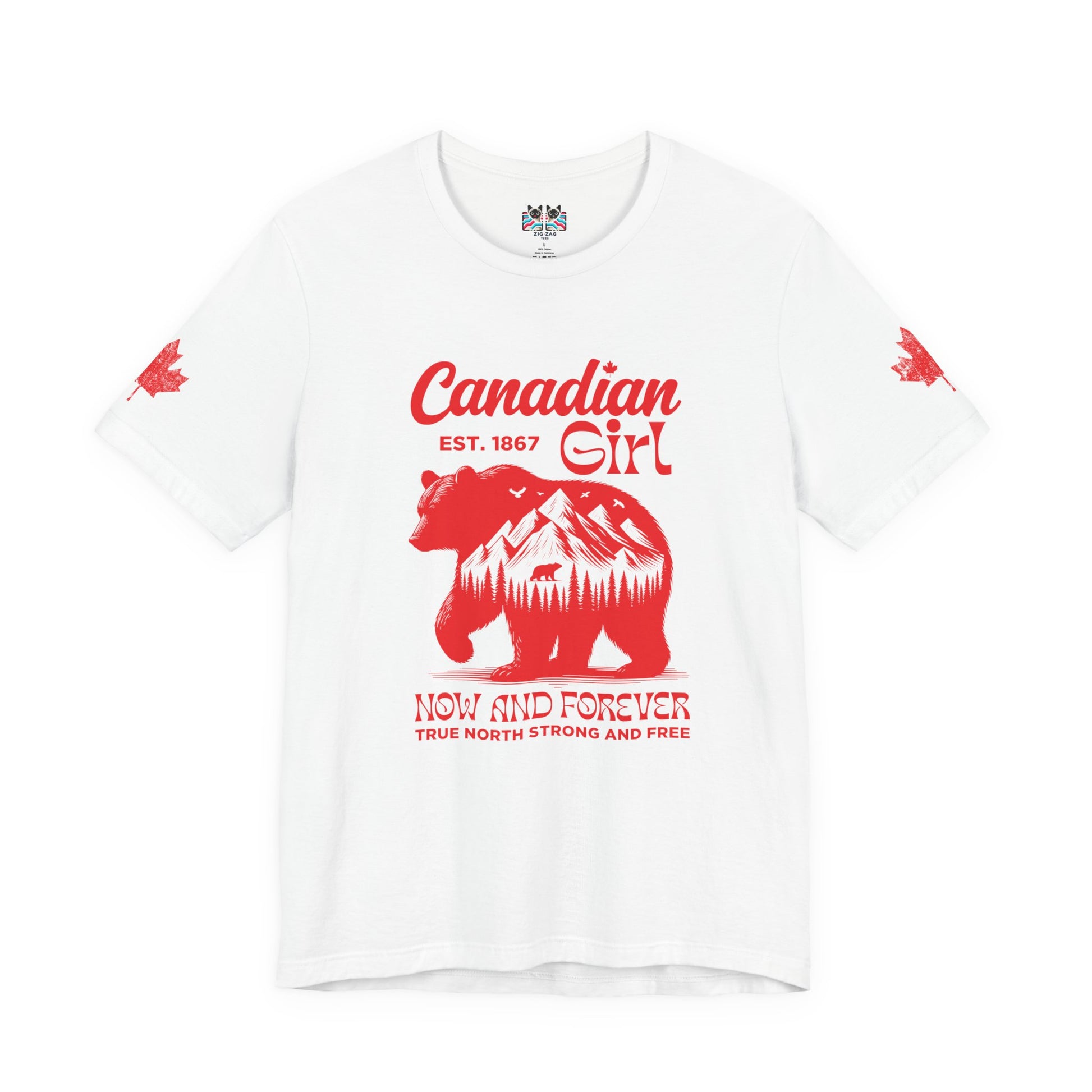 Celebrate the spirit of Canadian wilderness with this stunning t-shirt featuring a large bear walking, embossed with intricate graphics of mountains, forests, and abundant wildlife. Inside the bear’s silhouette, you can see another bear walking amid the wilderness, creating a powerful double-layered nature scene. The top proudly displays "Canadian Girl est. 1867" while the bottom reads "Now and Forever, True North Strong and Free," emphasizing enduring pride and connection to Canada’s great outdoors. Crafted for comfort and style, this tee is perfect for nature lovers and patriotic hearts alike.