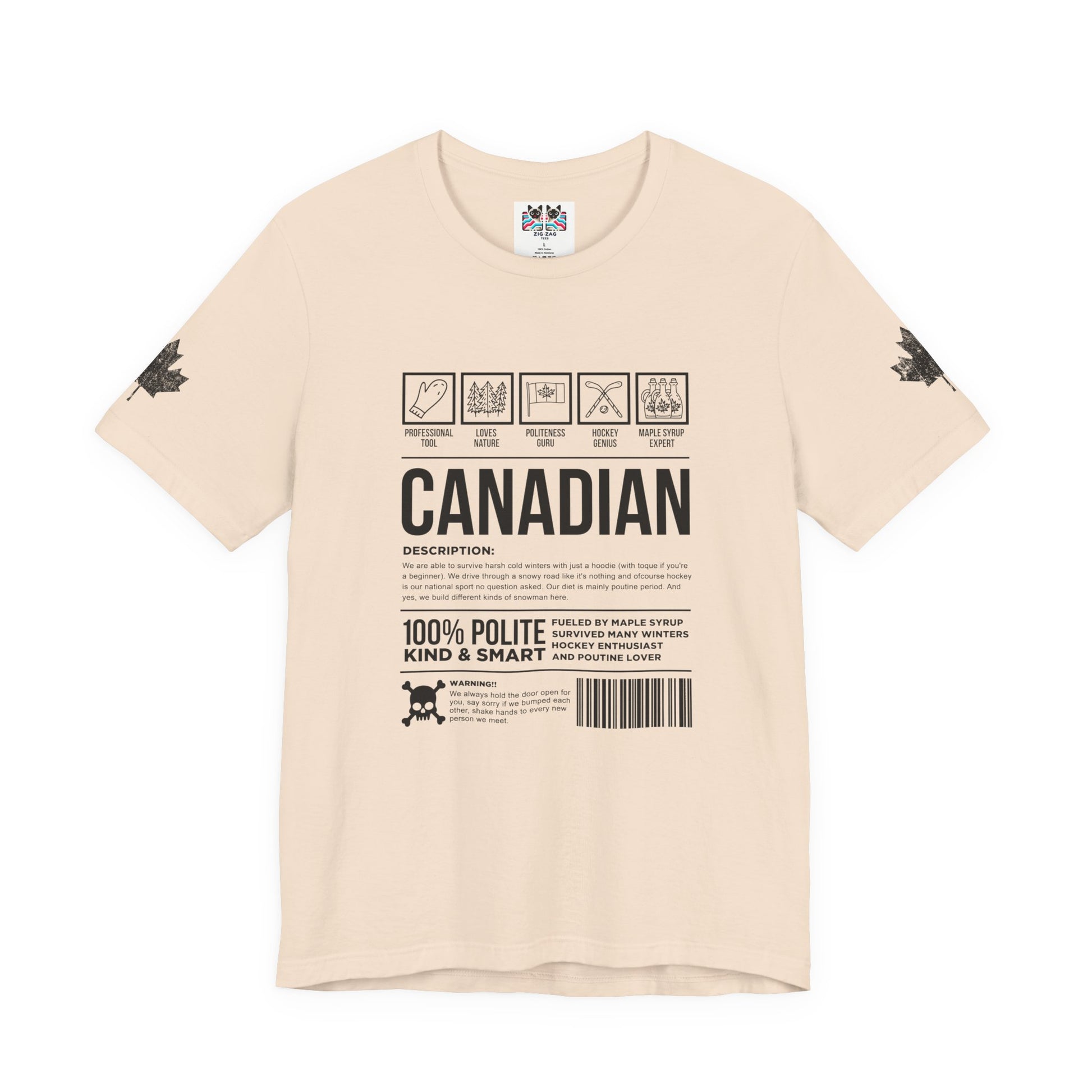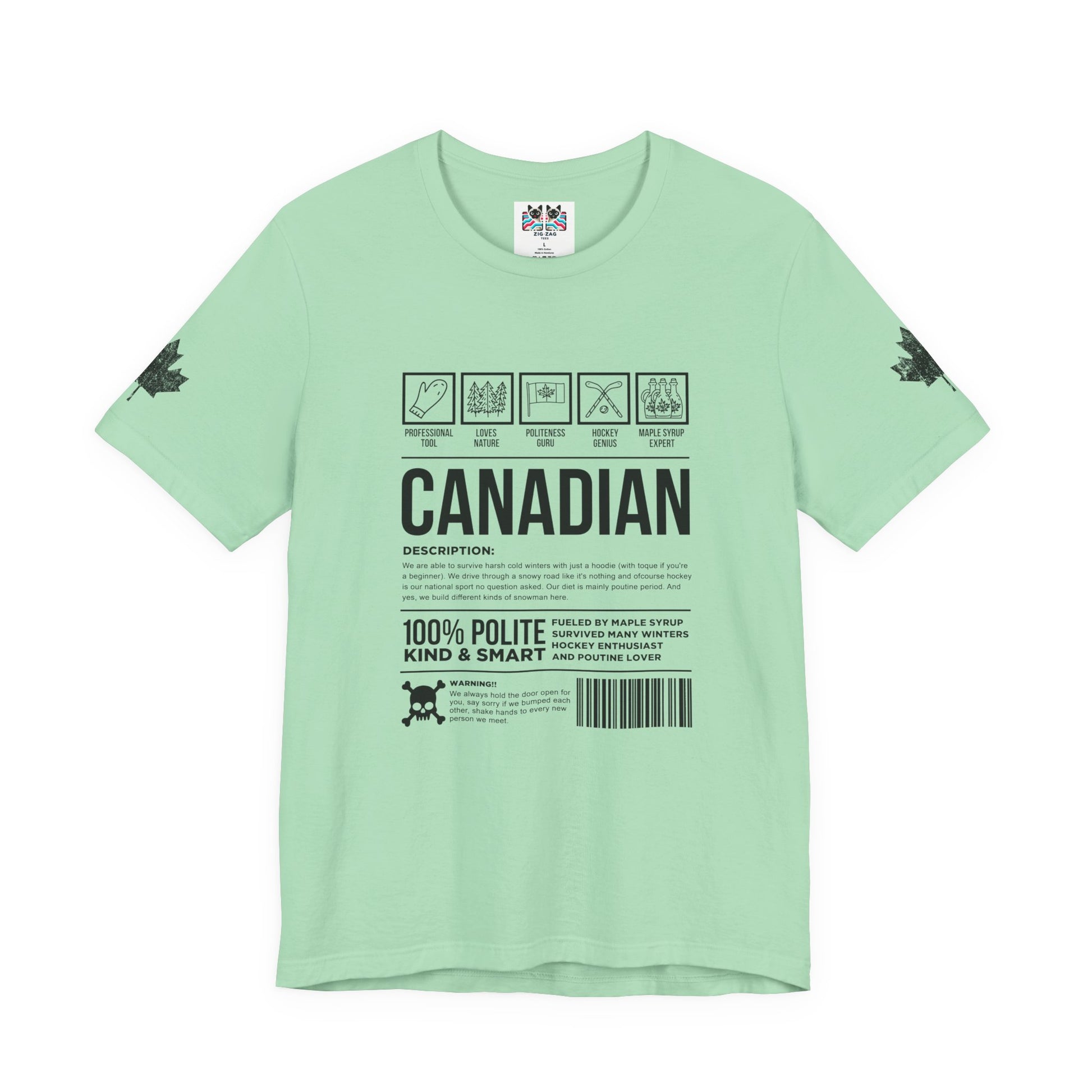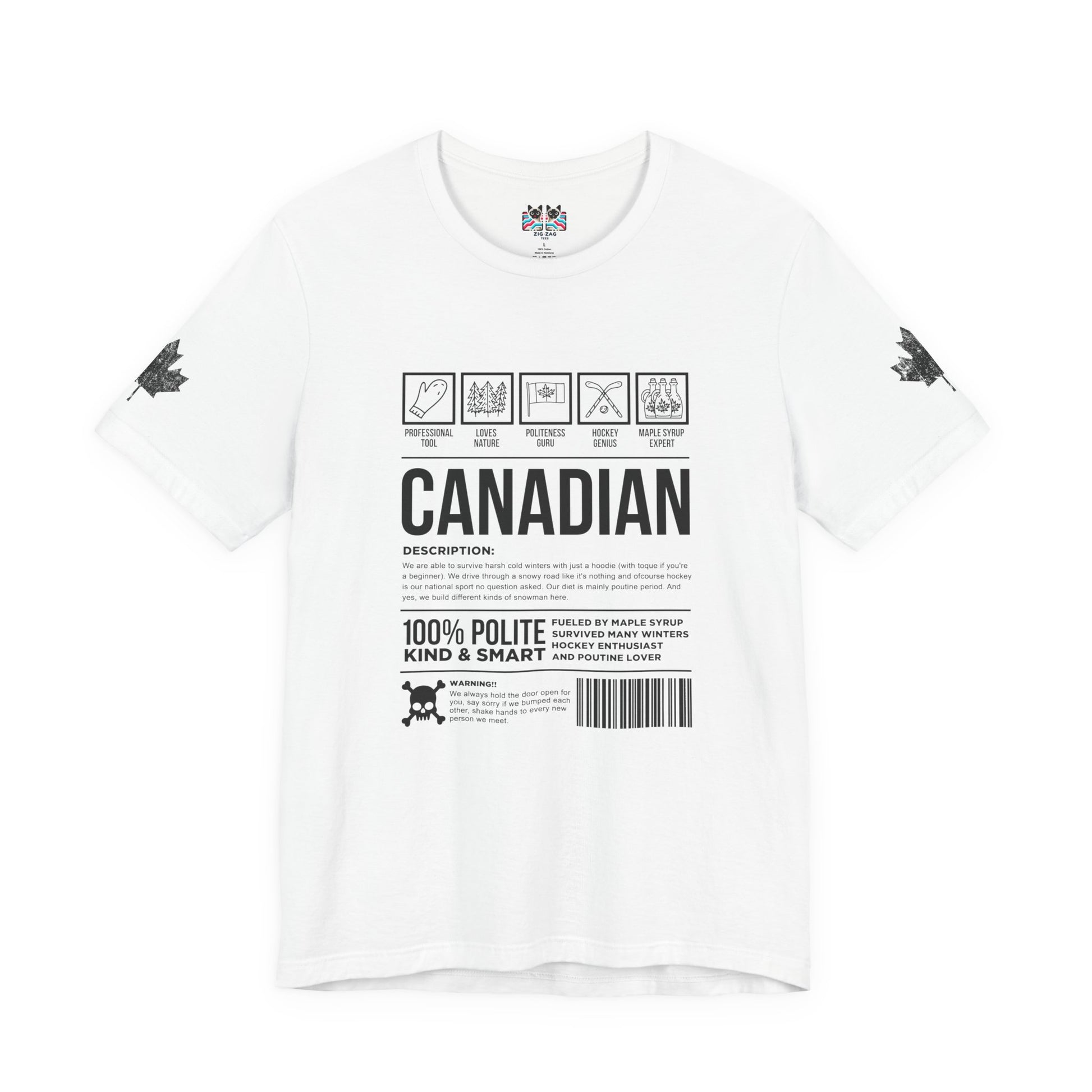Wear your Canadian pride with this witty t-shirt featuring a nutrition label-inspired graphic titled "CANADIAN." Highlighting traits like politeness, love for nature, maple syrup expertise, and hockey genius, the playful design includes icons, a barcode, and amusing 'ingredients' that define what it means to be Canadian. With maple leaf accents on both sleeves, this cozy tee delivers a unique blend of humor and heritage. Perfect for Canada Day, gifts, or everyday wear for anyone who loves their identity and makes kindness a habit.