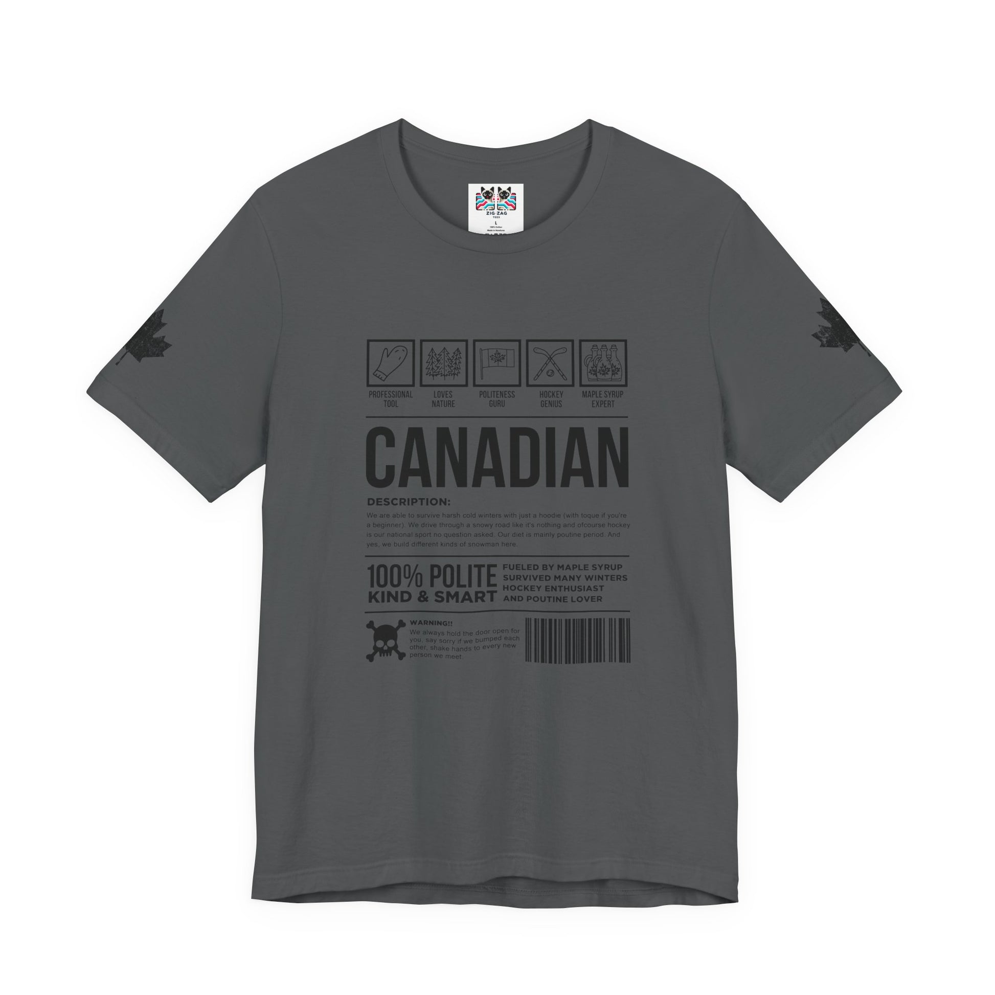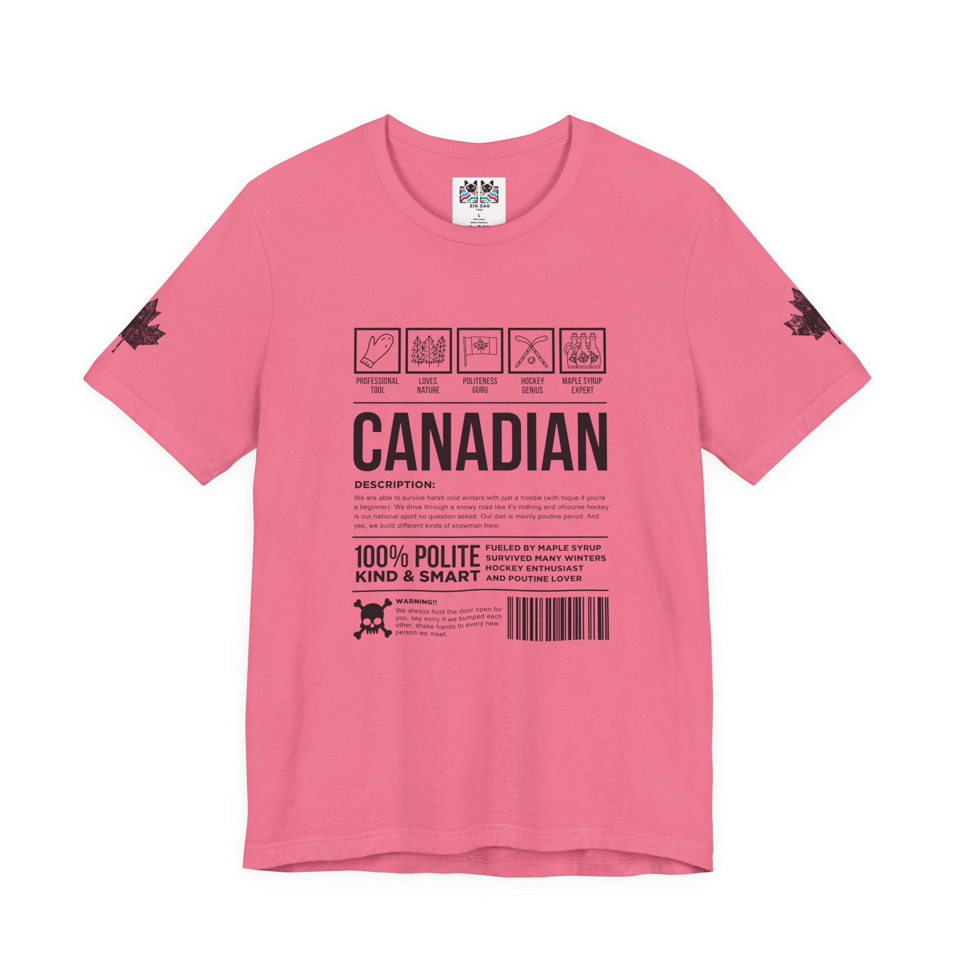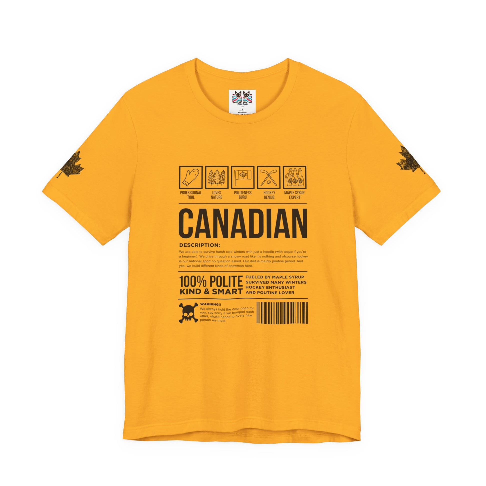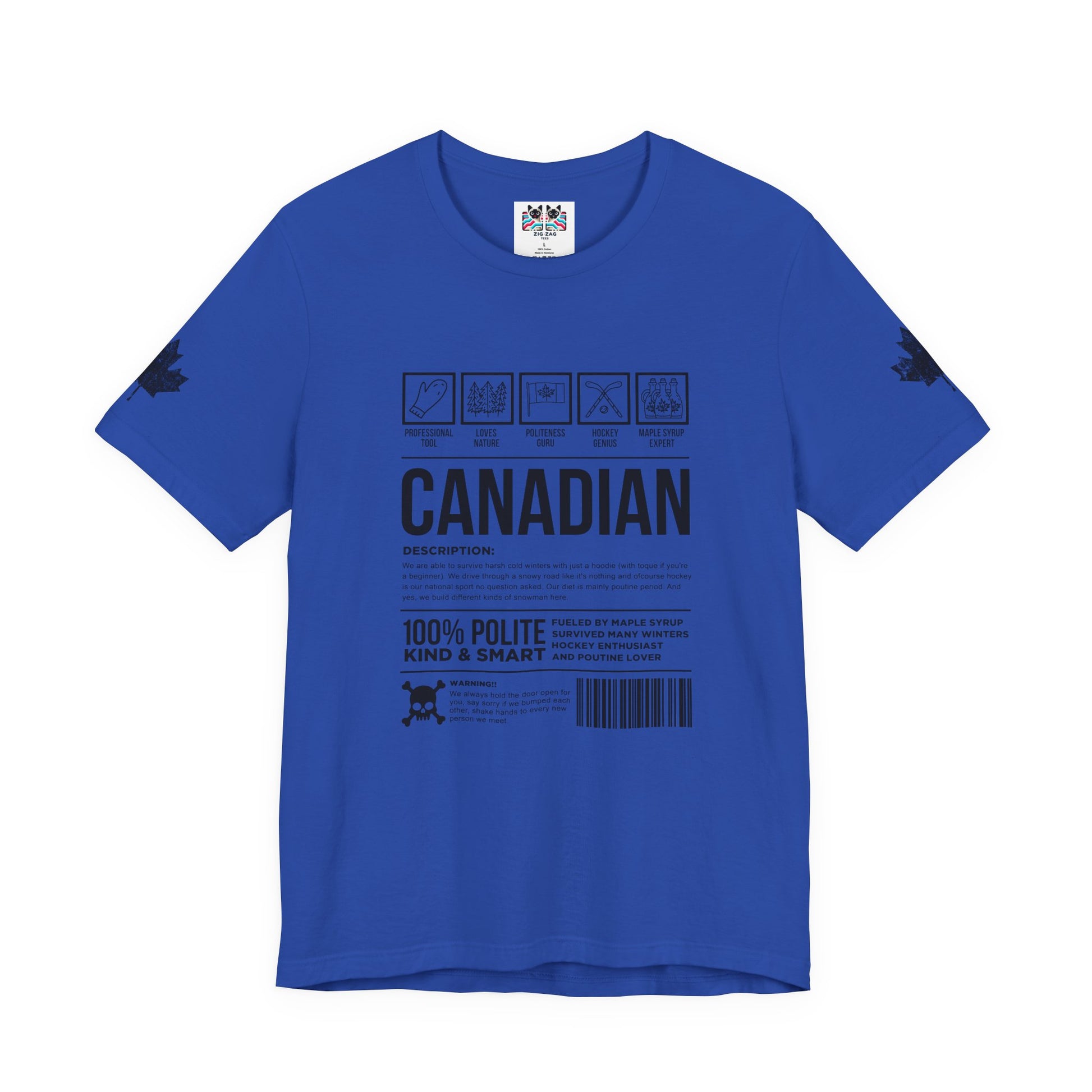 Wear your Canadian pride with this witty t-shirt featuring a nutrition label-inspired graphic titled "CANADIAN." Highlighting traits like politeness, love for nature, maple syrup expertise, and hockey genius, the playful design includes icons, a barcode, and amusing 'ingredients' that define what it means to be Canadian. With maple leaf accents on both sleeves, this cozy tee delivers a unique blend of humor and heritage. Perfect for Canada Day, gifts, or everyday wear for anyone who loves their identity and makes kindness a habit.