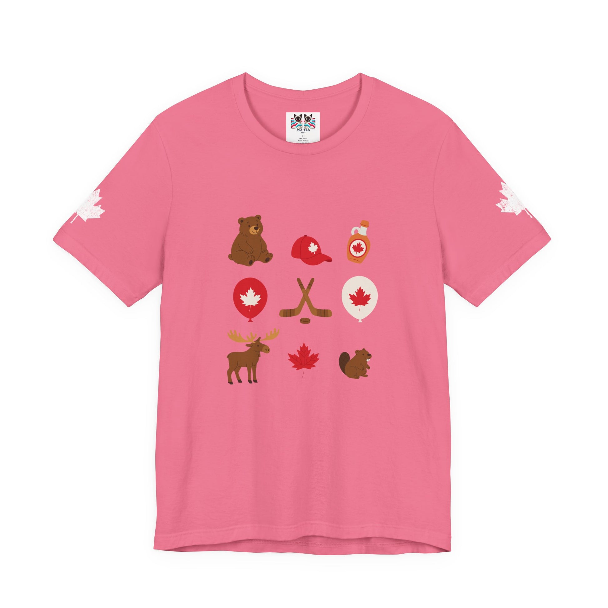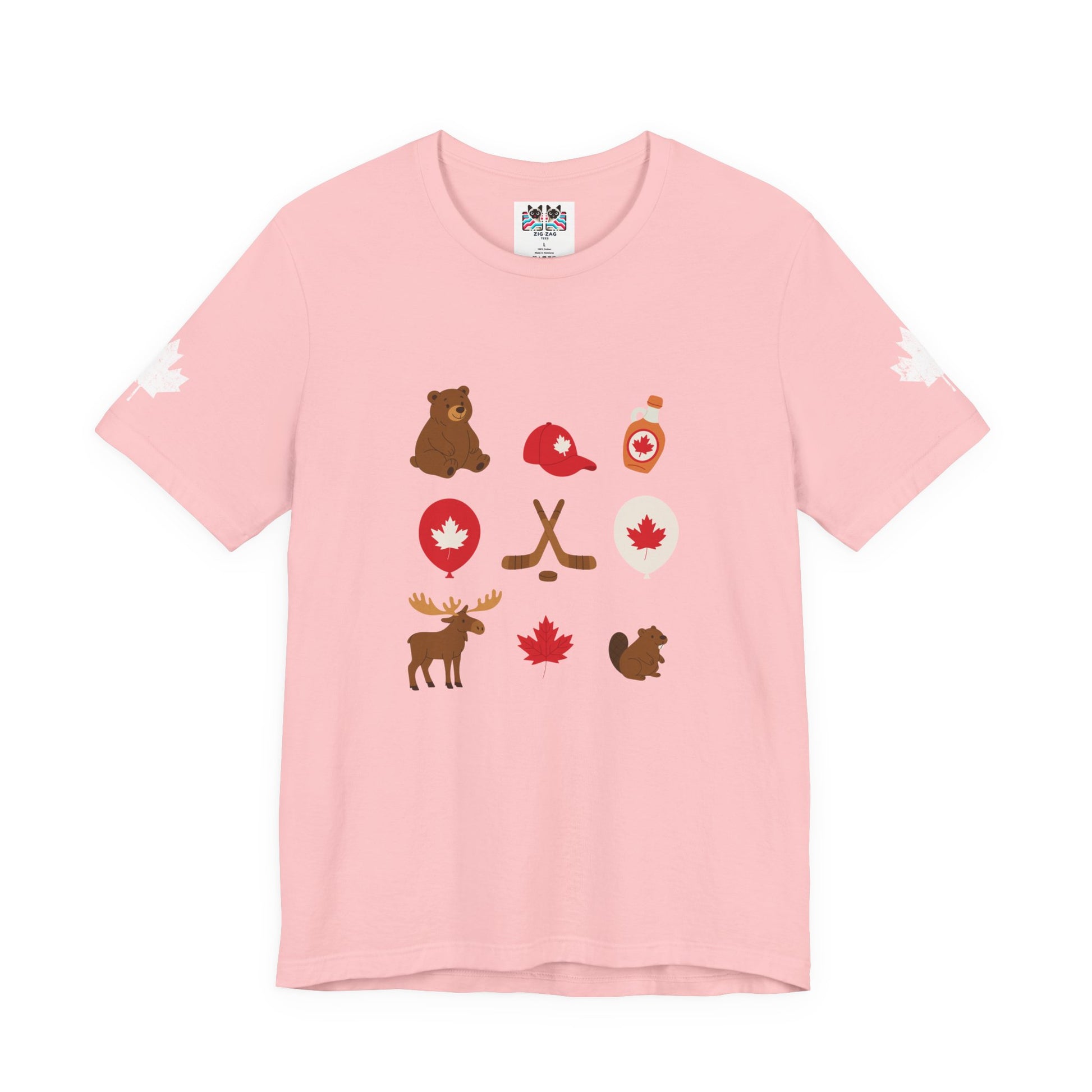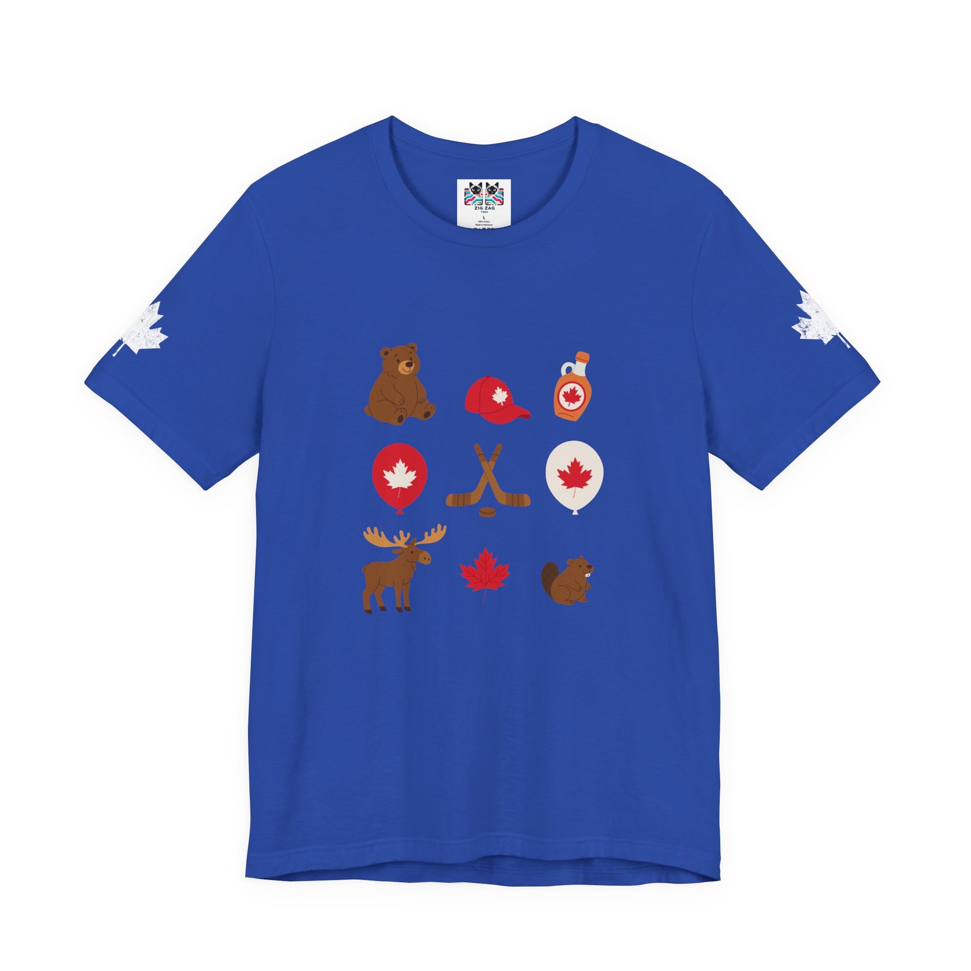Celebrate the essence of Canadian wildlife with this vibrant t-shirt showcasing a delightful collection of iconic images: a sitting bear, a cap with a maple leaf graphic, a bottle of maple syrup, hockey sticks and puck, a standing moose, a squirrel, a classic maple leaf, and two balloons with maple leaf designs. This colorful spread on a soft, comfortable tee captures the spirit of Canada’s outdoors and culture, making it perfect for nature lovers, hockey fans, and anyone proud to show Canadian heritage year-round.