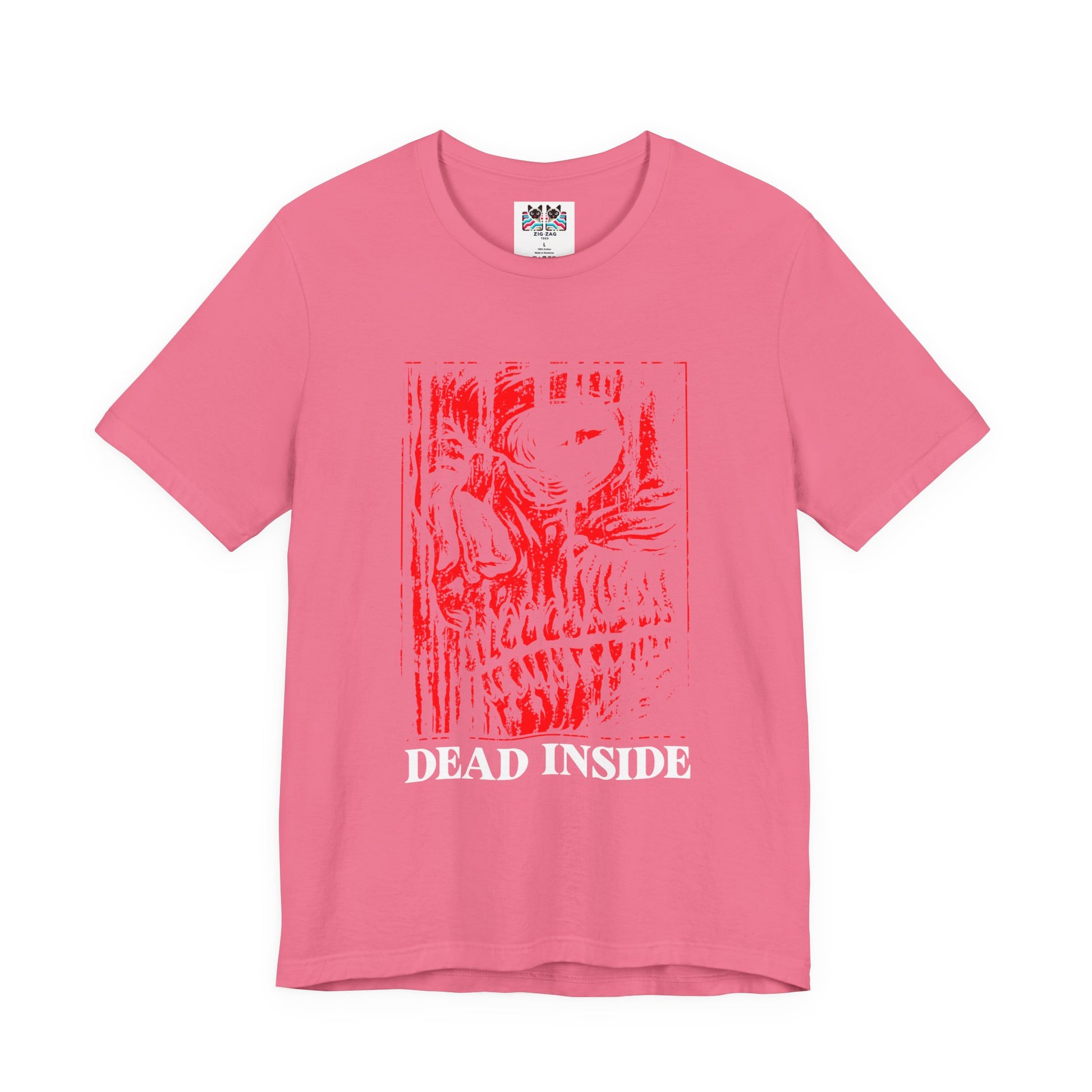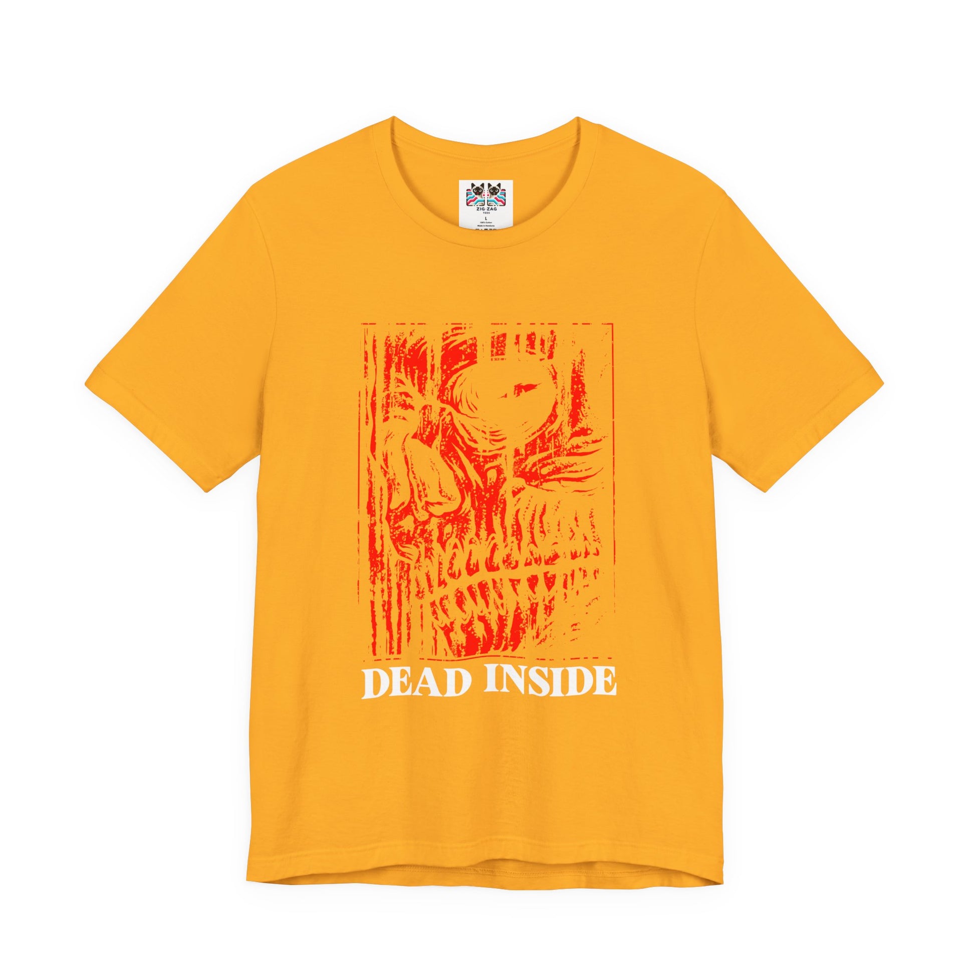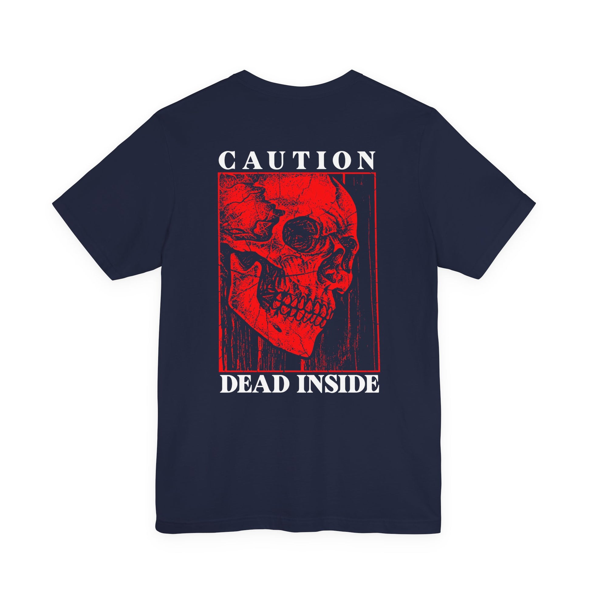 Show your dark sense of humor with this bold horror tee featuring a distressed red skull illustration on the front with the text “Dead Inside” beneath it. The back design turns up the attitude with a large side-profile skull graphic framed by the warning word “Caution” above and “Dead Inside” below, creating a gritty punk and metal-inspired look. Perfect for goths, emos, metalheads, and anyone who loves edgy artwork, this graphic t-shirt is ideal for concerts, festivals, Halloween, or everyday alternative style.