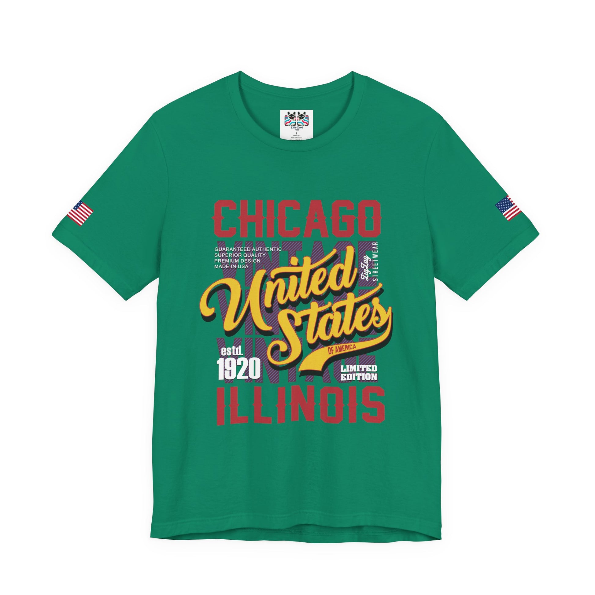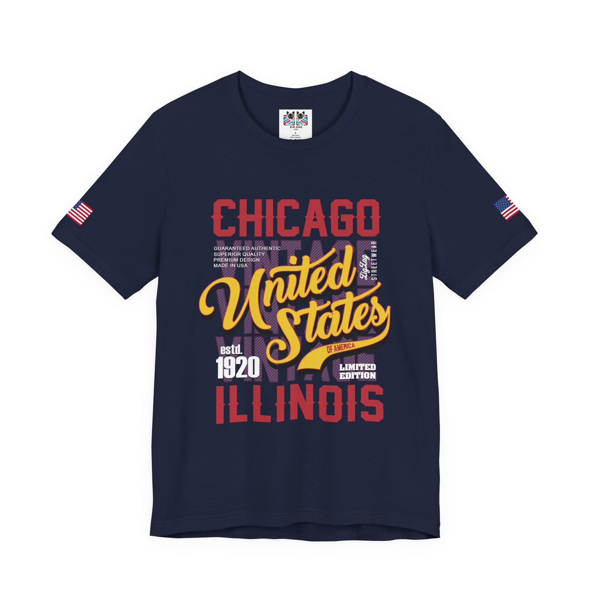 Make a statement with this bold "CHICAGO - UNITED STATES - estd. 1920 - ILLINOIS - LIMITED EDITION" vintage streetwear design! The shirt features dynamic typography with "United States" in striking yellow script, "OF AMERICA" banner, and purple/red geometric patterns creating an urban, contemporary aesthetic. While Chicago was founded in 1837, the 1920 reference likely nods to Chicago's legendary 1920s era - the Roaring Twenties when Chicago gained fame through jazz, speakeasies, and becoming America's second-largest city. The "GUARANTEED AUTHENTIC SUPERIOR QUALITY PREMIUM DESIGN MADE IN U.S.A." and "LIMITED EDITION" branding give this a collectible, exclusive feel. This black t-shirt with American flag sleeve patches is perfect for streetwear enthusiasts, urban fashion lovers, vintage Chicago fans, 1920s history buffs, or anyone wanting a unique, edgy Chicago design. Ideal for hip-hop culture fans, street style, or standing out from typical tourist shirts.