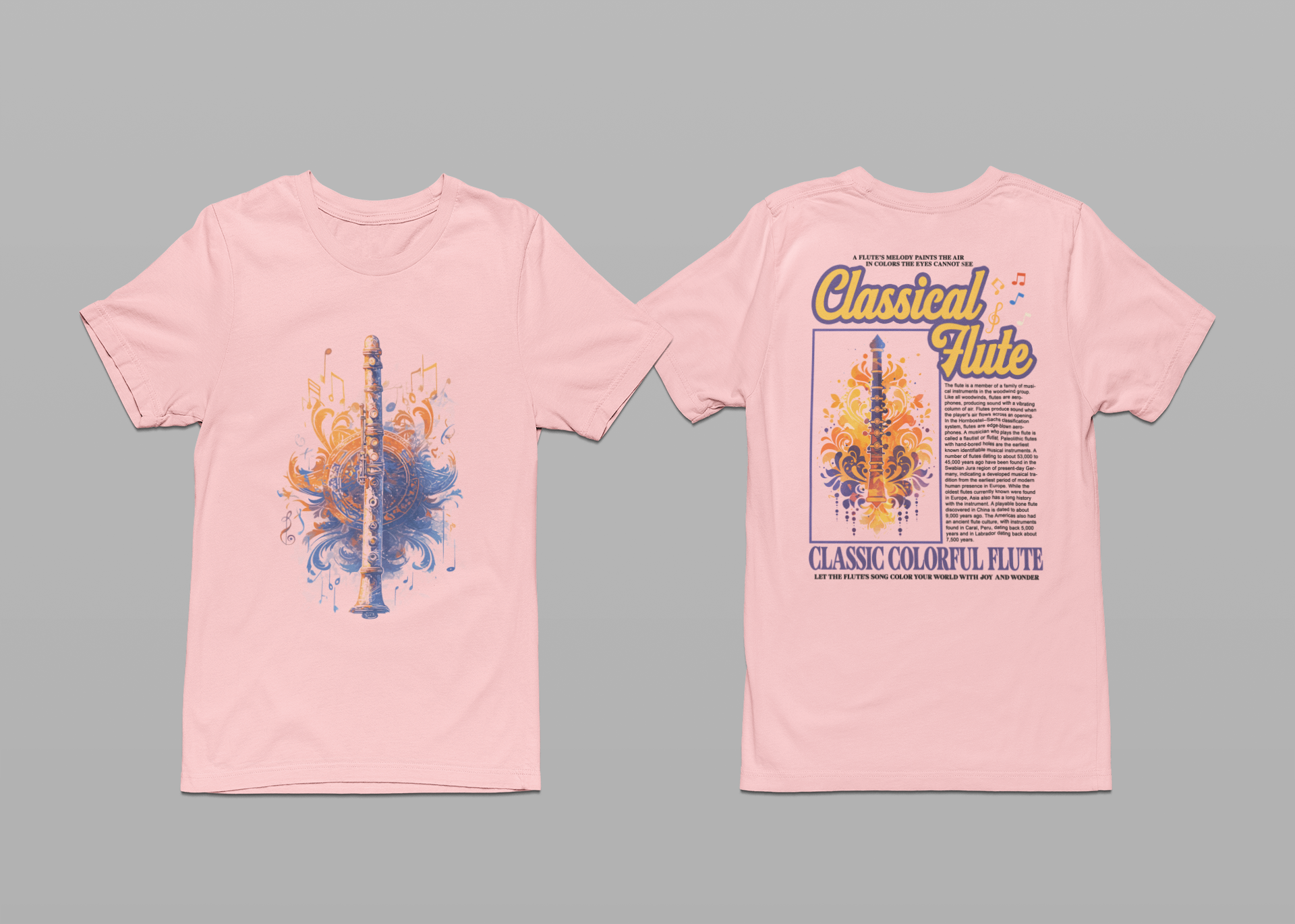 Celebrate your love for classical music with this vibrant flute t-shirt featuring a detailed flute surrounded by swirling colors and music notes on the front, and a bold “Classical Flute” back print with a matching flute illustration, short flute description, and the phrase “Classic Colorful Flute” at the bottom. Perfect for flute players, band students, orchestra members, and music teachers, this artistic tee captures the elegance and color of flute music. Ideal for rehearsals, concerts, recitals, school band events, or everyday wear, it also makes a thoughtful gift for any flutist or classical music fan.