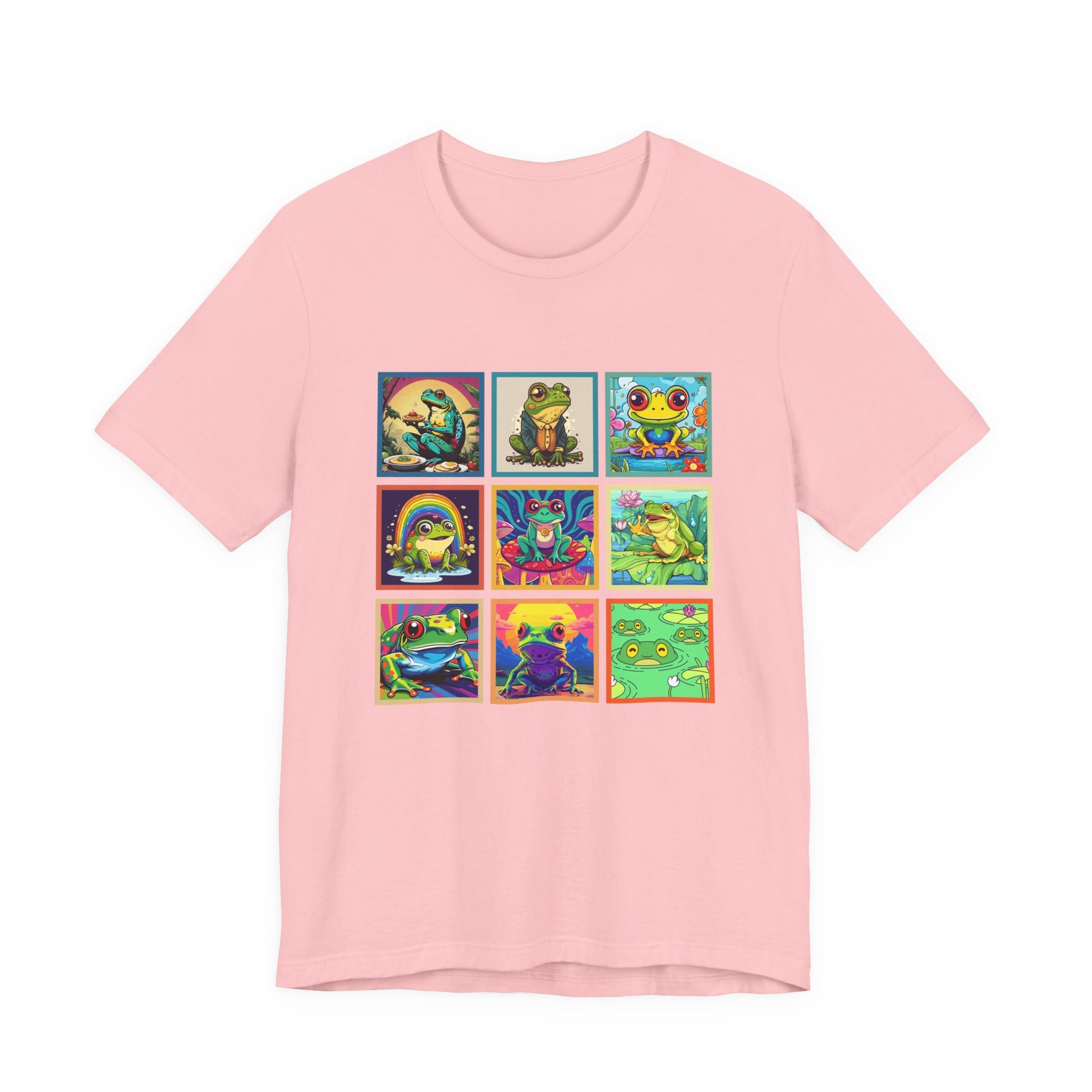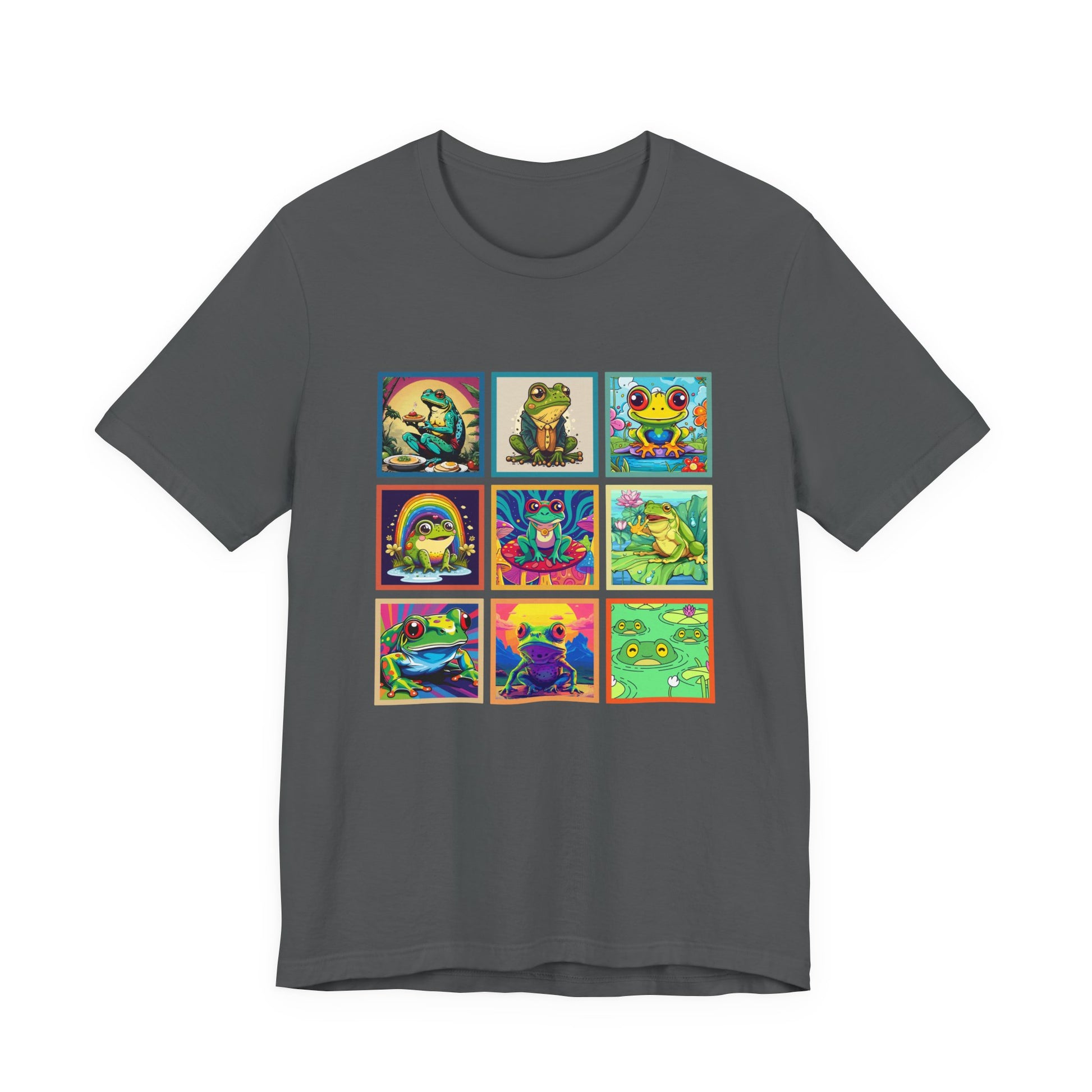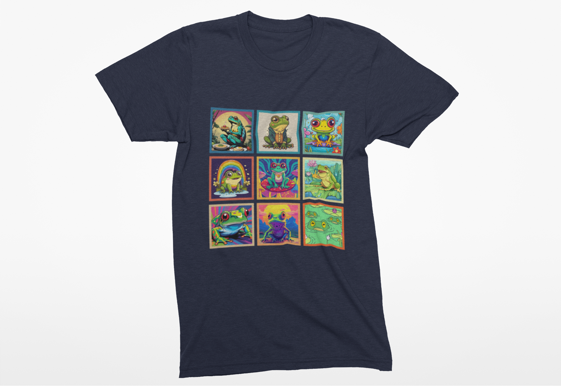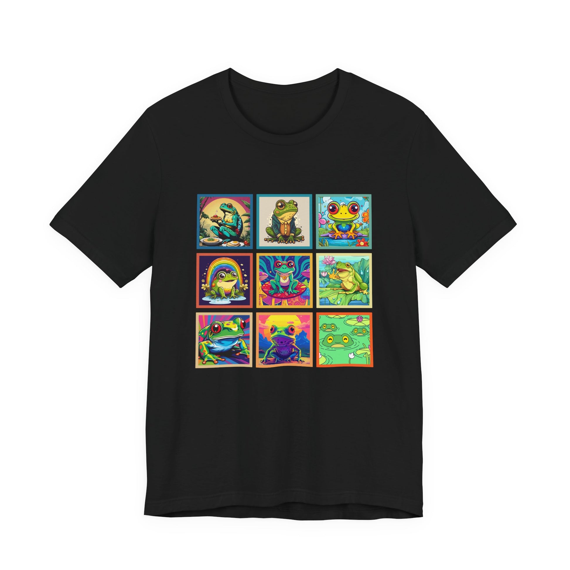 This playful tshirt features a 3x3 grid of vibrant cartoon-style frogs, each in its own colorful square with unique poses, backgrounds, and expressions. The bright rainbow palette and fun amphibian characters make it a perfect statement piece for frog lovers, cottagecore fans, and anyone who enjoys quirky, eye-catching nature-inspired art.