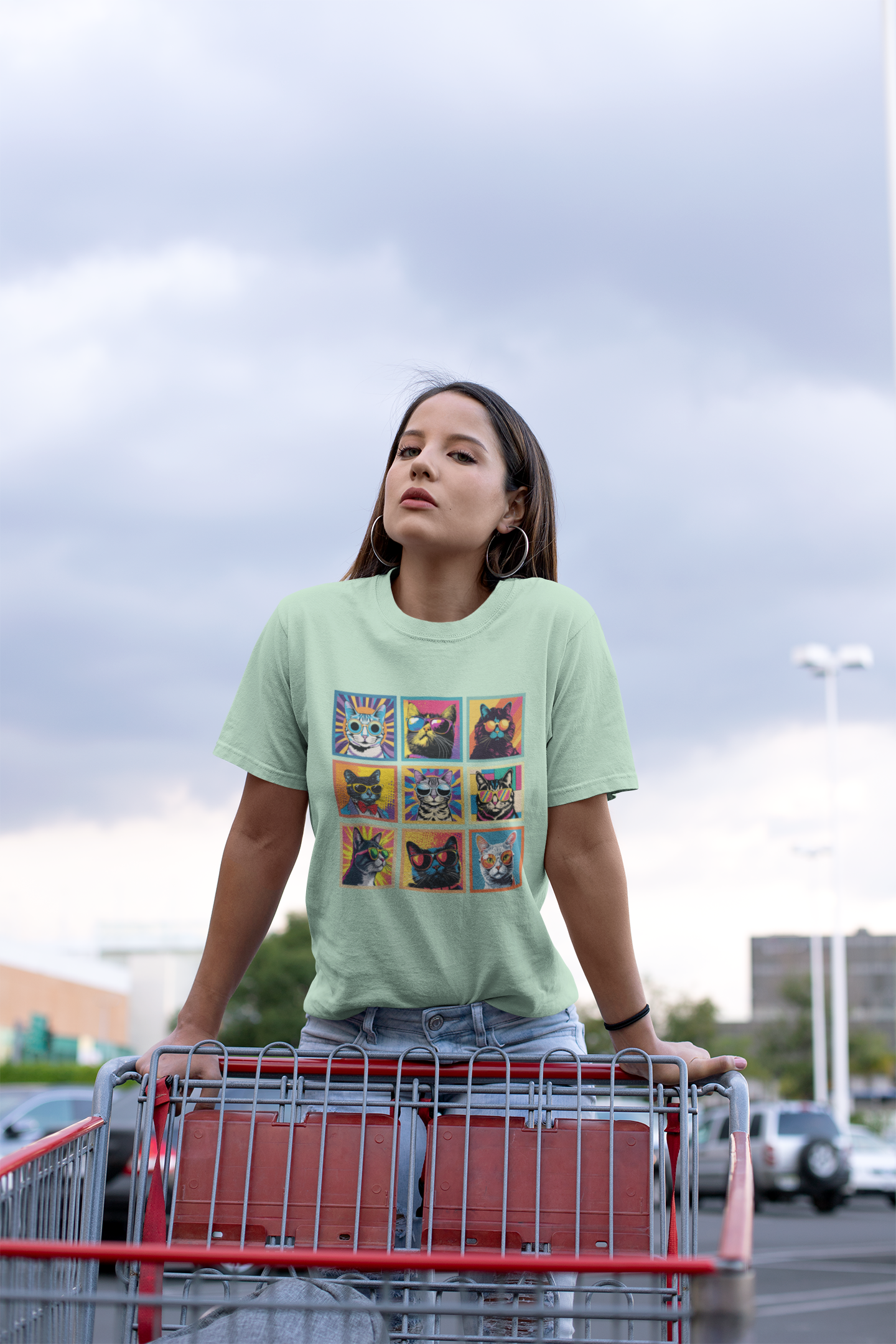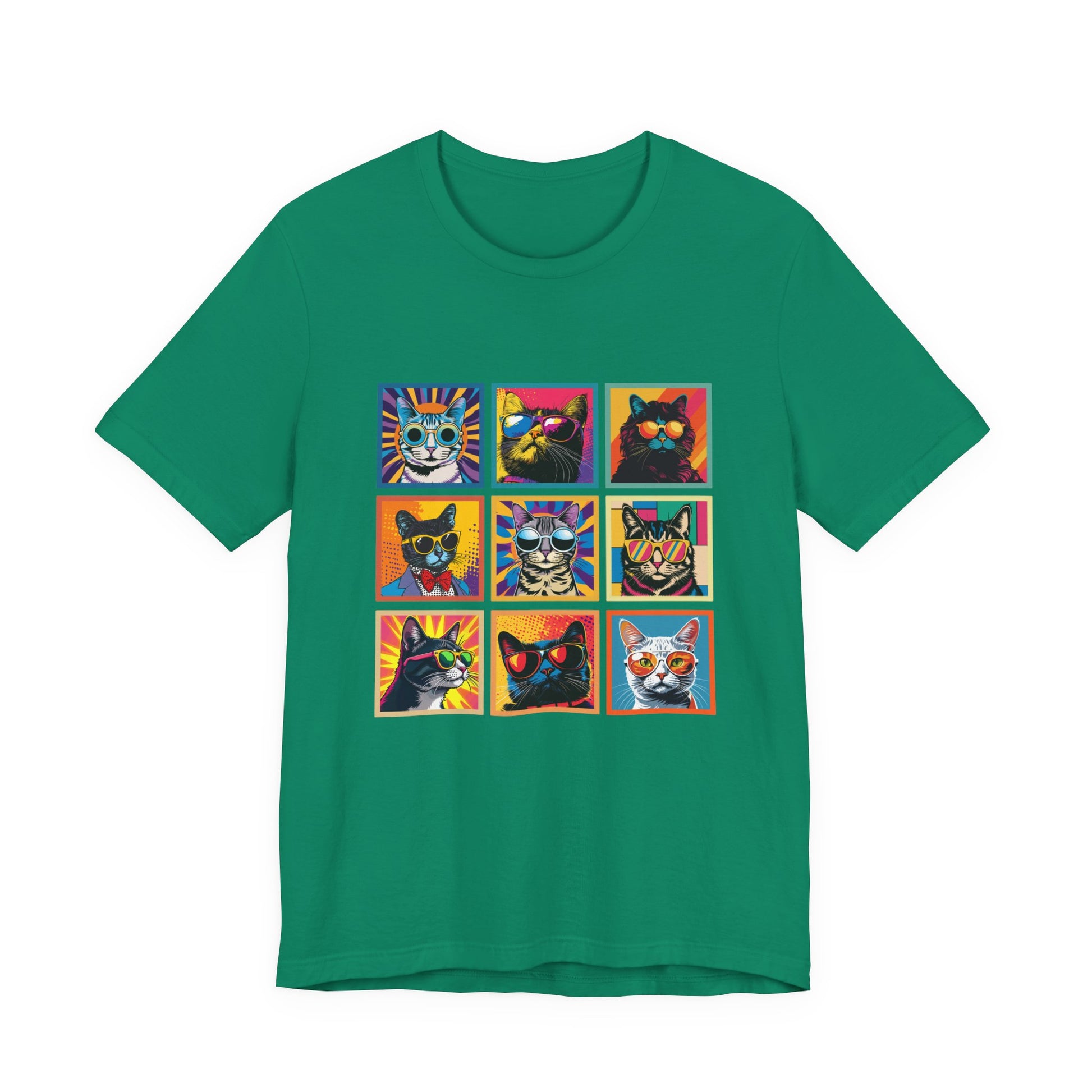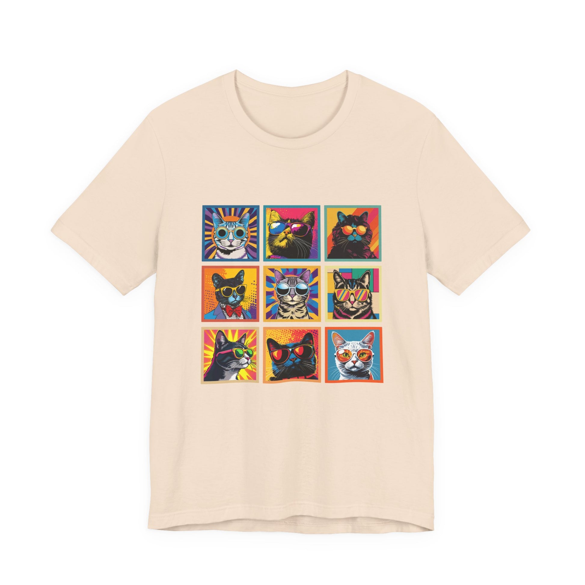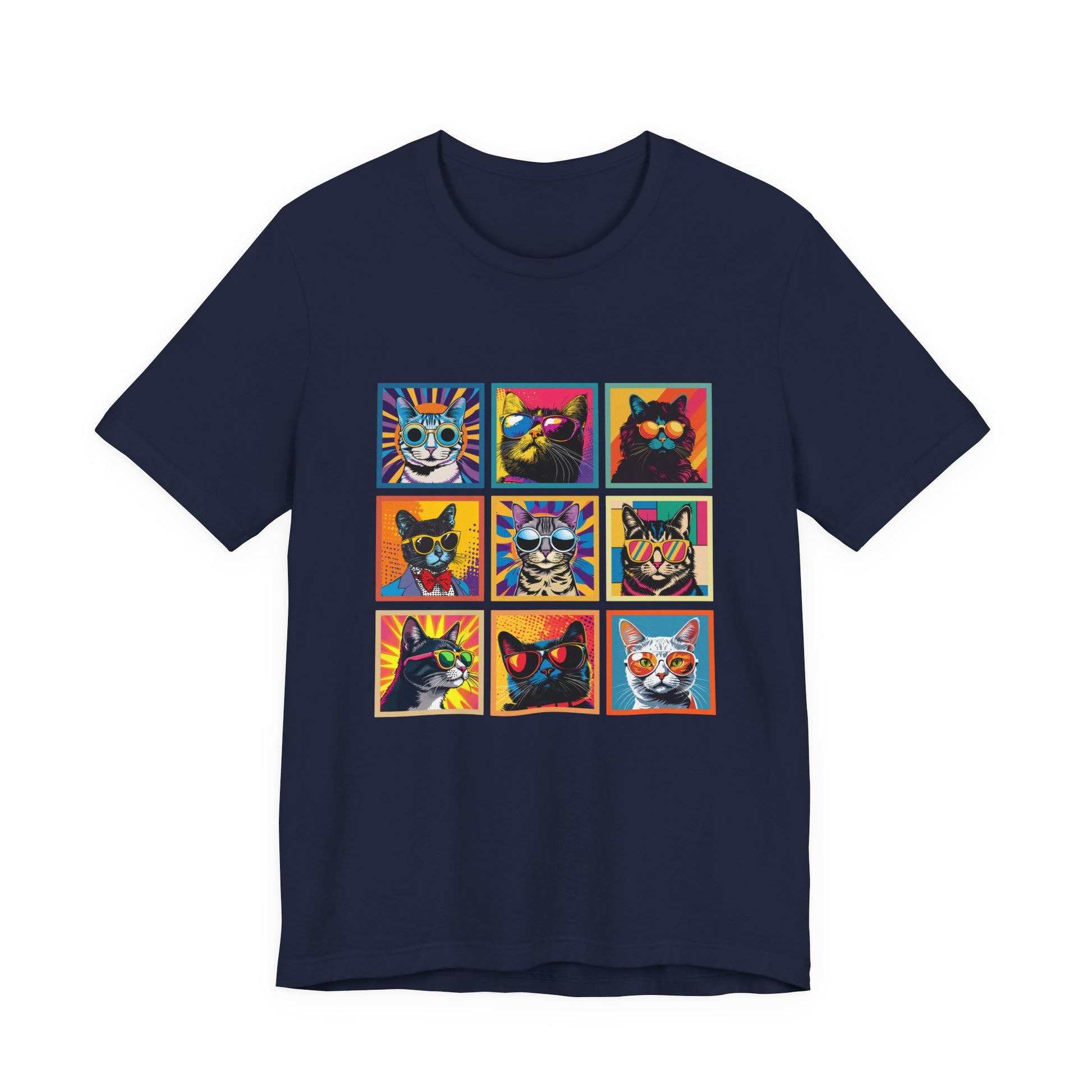 This playful tshirt features a 3x3 grid of colorful pop art-style cats, each rocking funky sunglasses and unique patterns for a bold, retro vibe. The bright square backgrounds and expressive kitty faces create a fun statement piece perfect for cat lovers, art fans, and anyone who loves vibrant, quirky fashion.