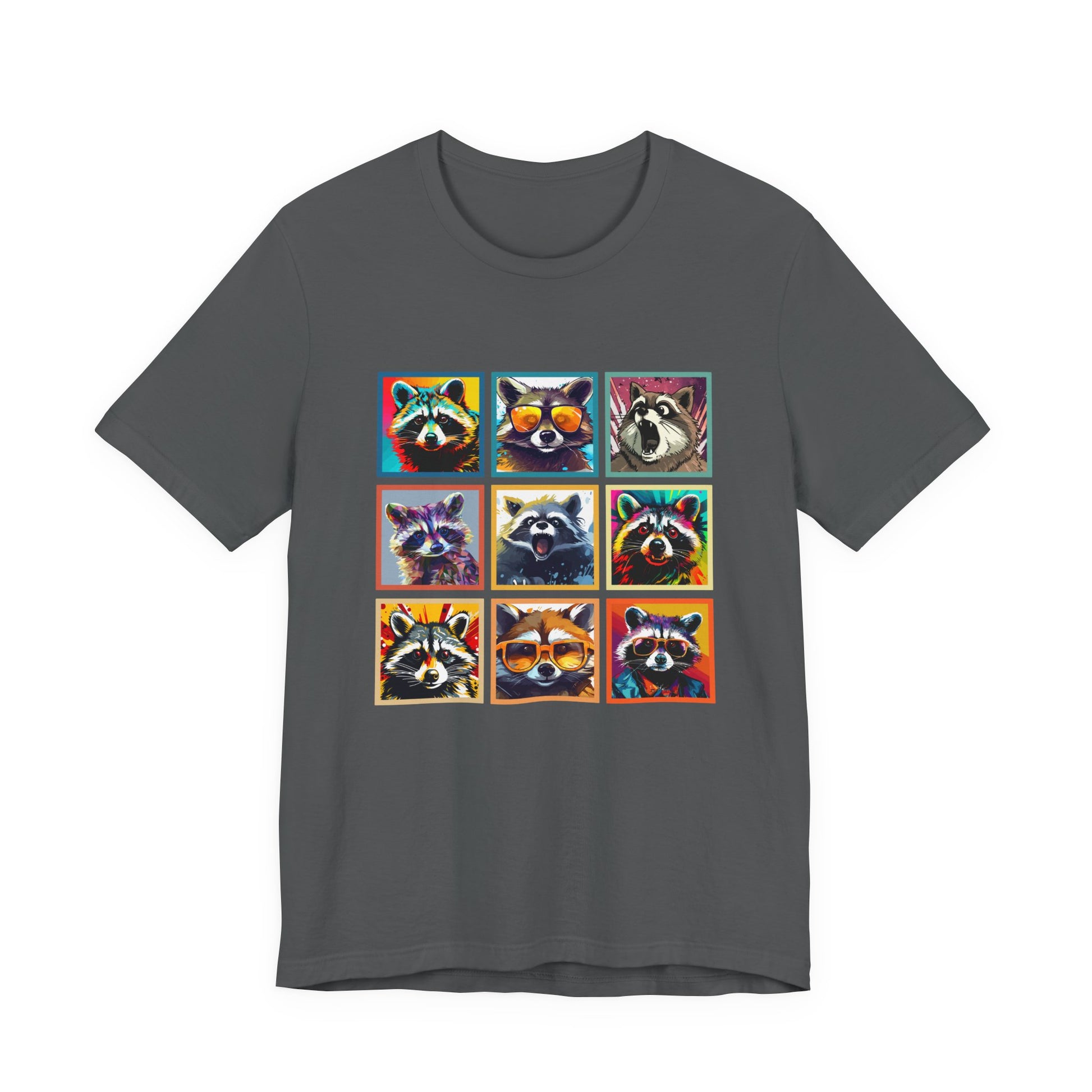 This fun tshirt showcases a 3x3 grid of colorful pop art-style raccoon faces, each with its own quirky expression, sunglasses, and bright background. The playful “trash panda” vibe and bold colors make it a perfect statement piece for raccoon fans, animal lovers, and anyone who enjoys unique, eye-catching streetwear.