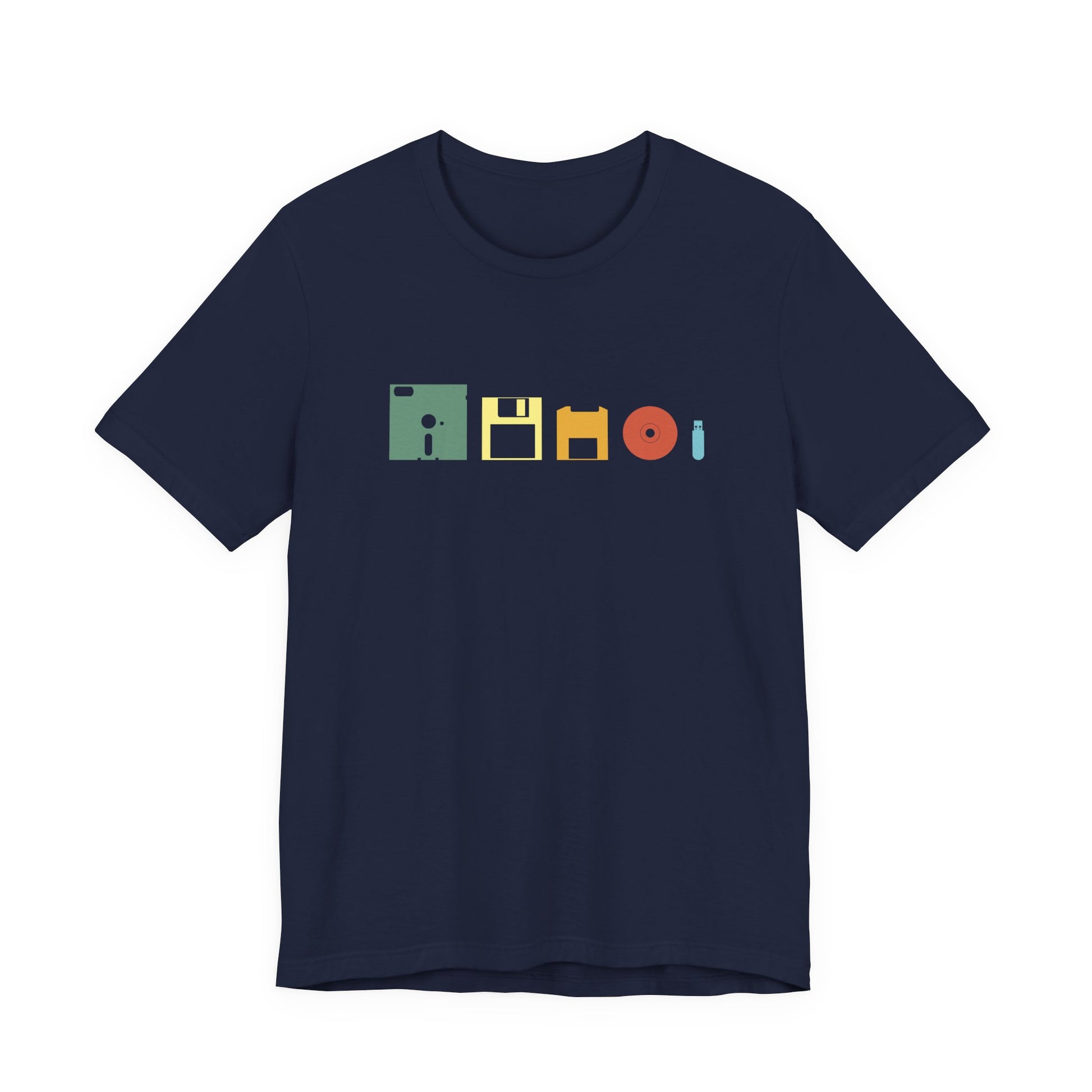 Data Storage Evolution Tshirt – Floppy Disk to CD to Thumb Drive