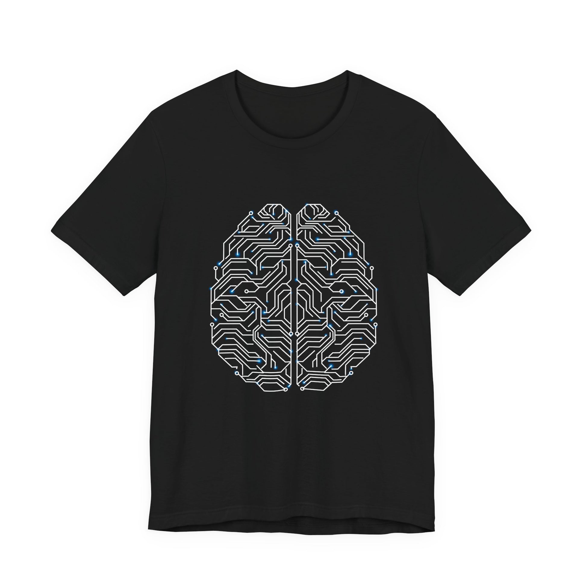 This stylish tshirt features a large human brain shape formed by interconnected lines and nodes resembling a circuit diagram. The design symbolizes the brain’s complex neural network and modern technology’s digital circuits, making it ideal for tech enthusiasts, engineers, neuroscientists, and anyone fascinated by the fusion of science and technology.